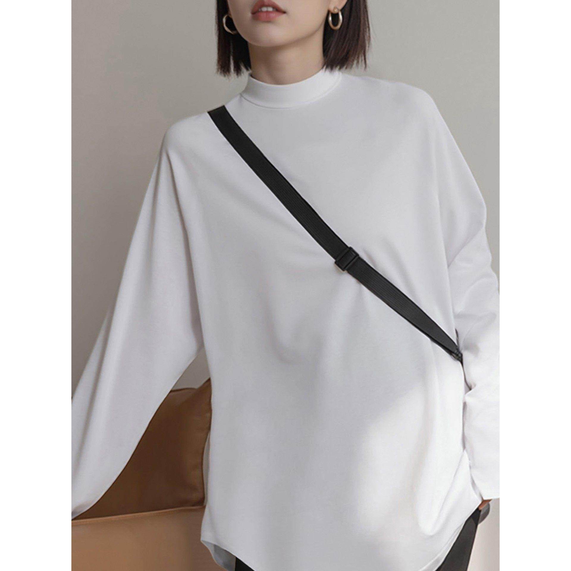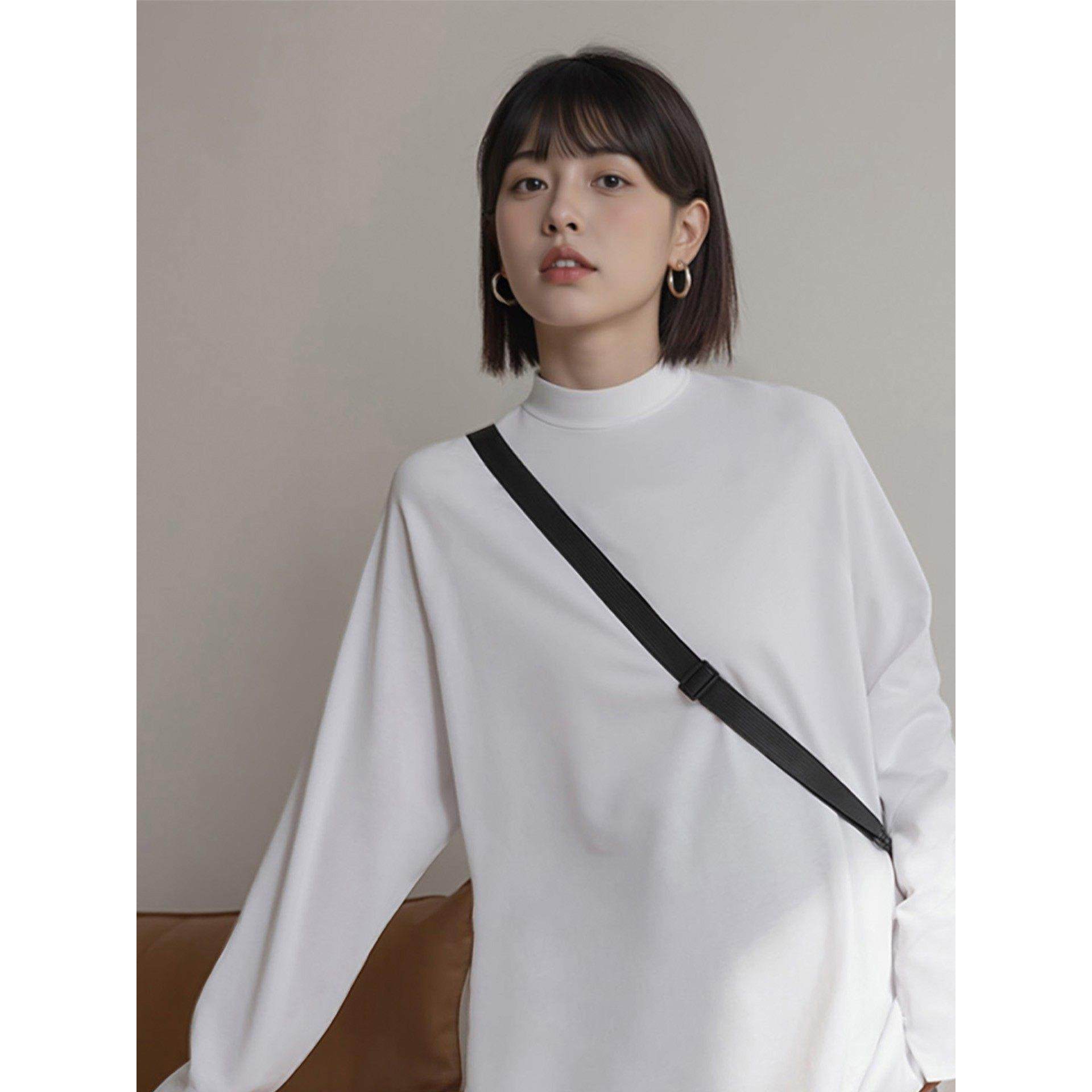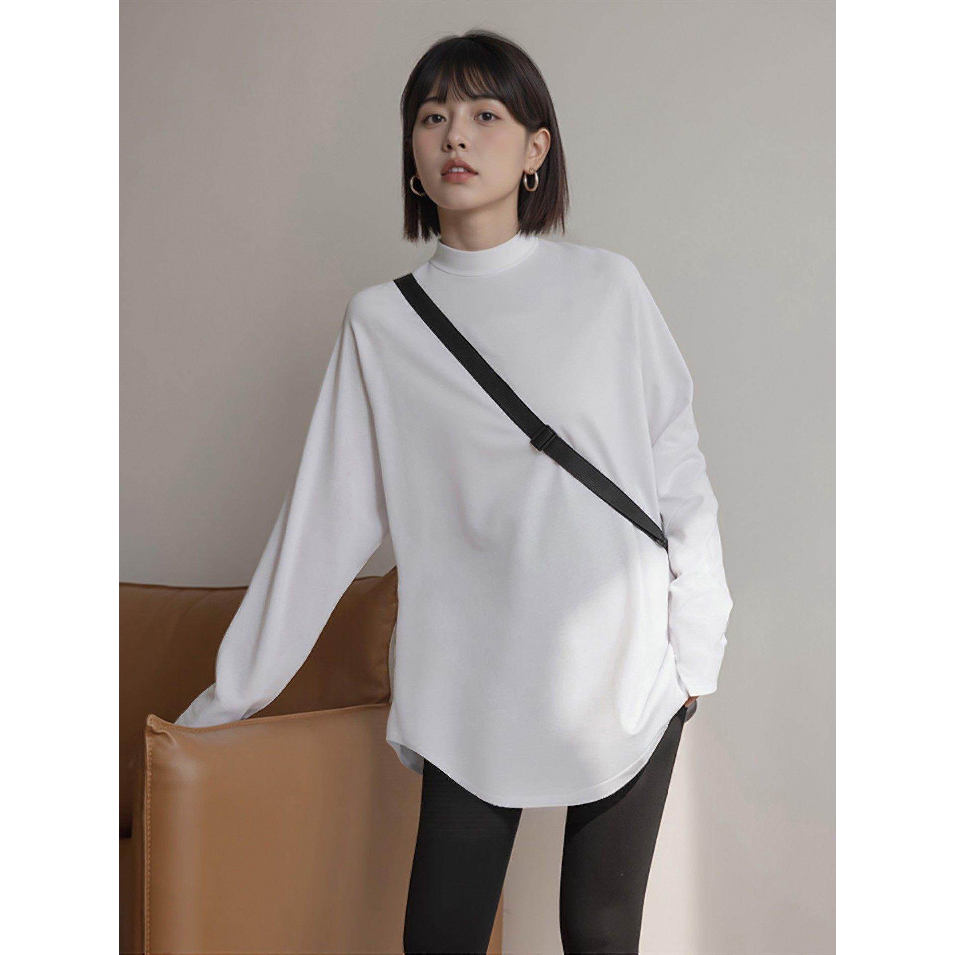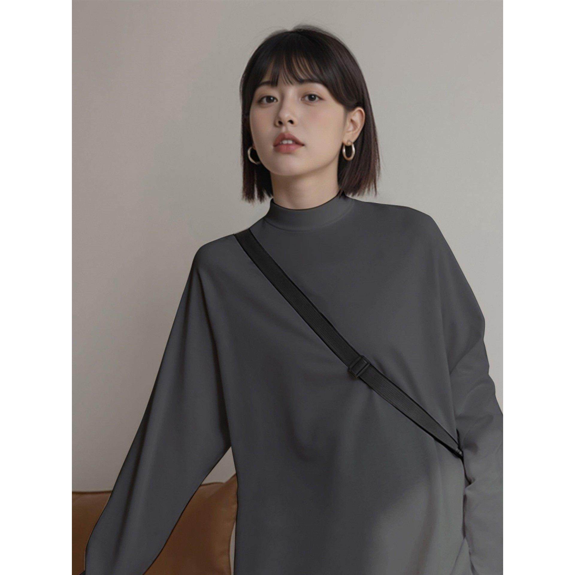 灰色半高领德绒打底衫女秋冬内搭中长款长袖t恤搭配鲨鱼裤的上衣