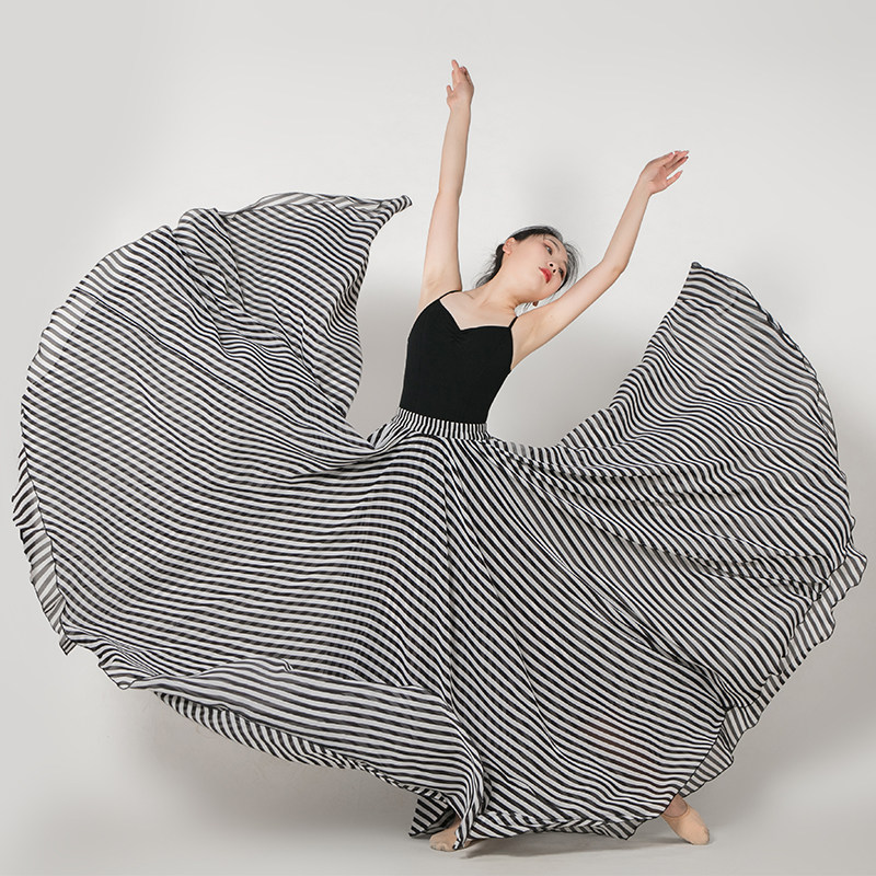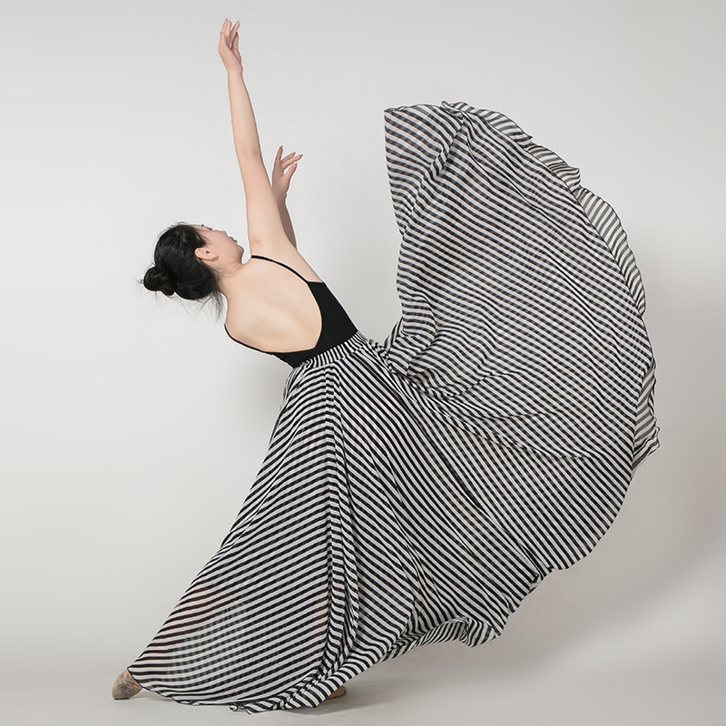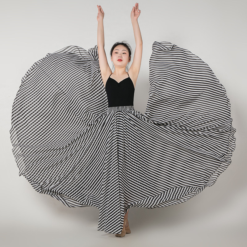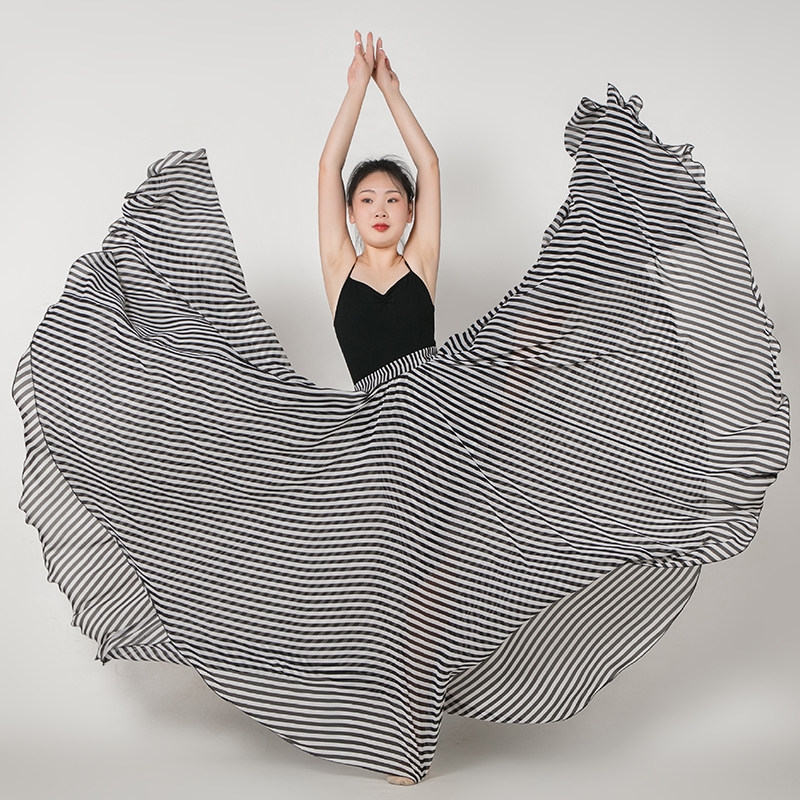 现代舞演出服女720度大摆长裙收腰修身舞蹈服条纹新疆舞大摆裙仙