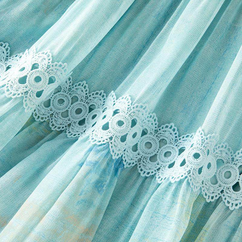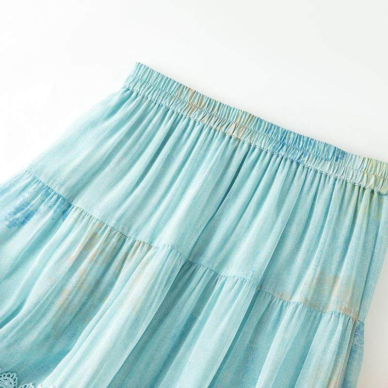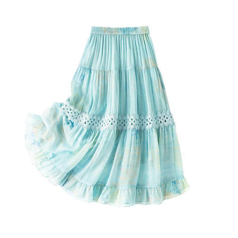 超仙气淡绿色桑蚕丝拼接蕾丝重工纯色松紧腰大摆半身裙85097