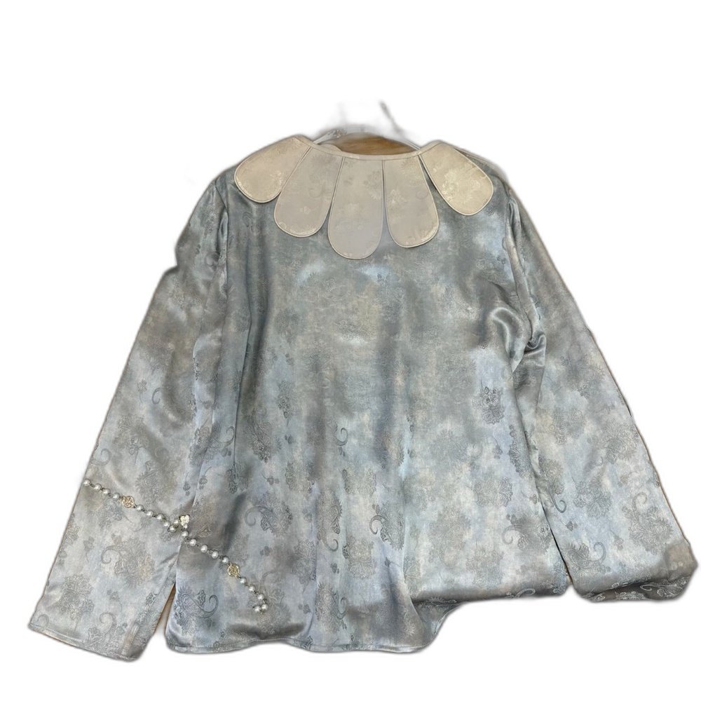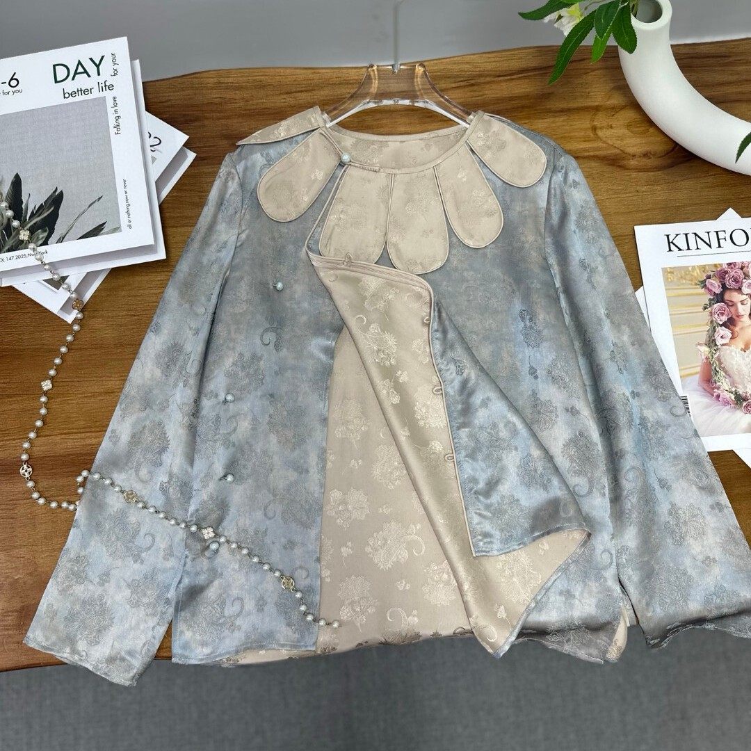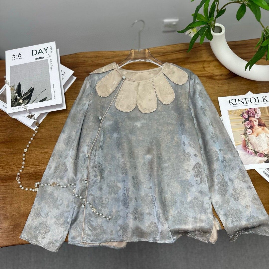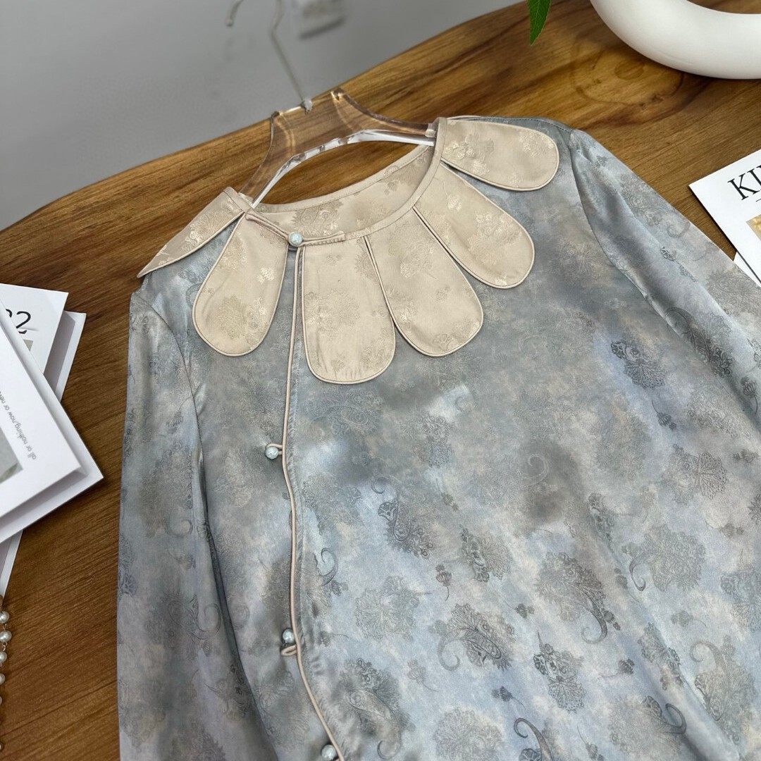 26年早春!桑蚕丝花瓣领斜襟腰果花图案小衫