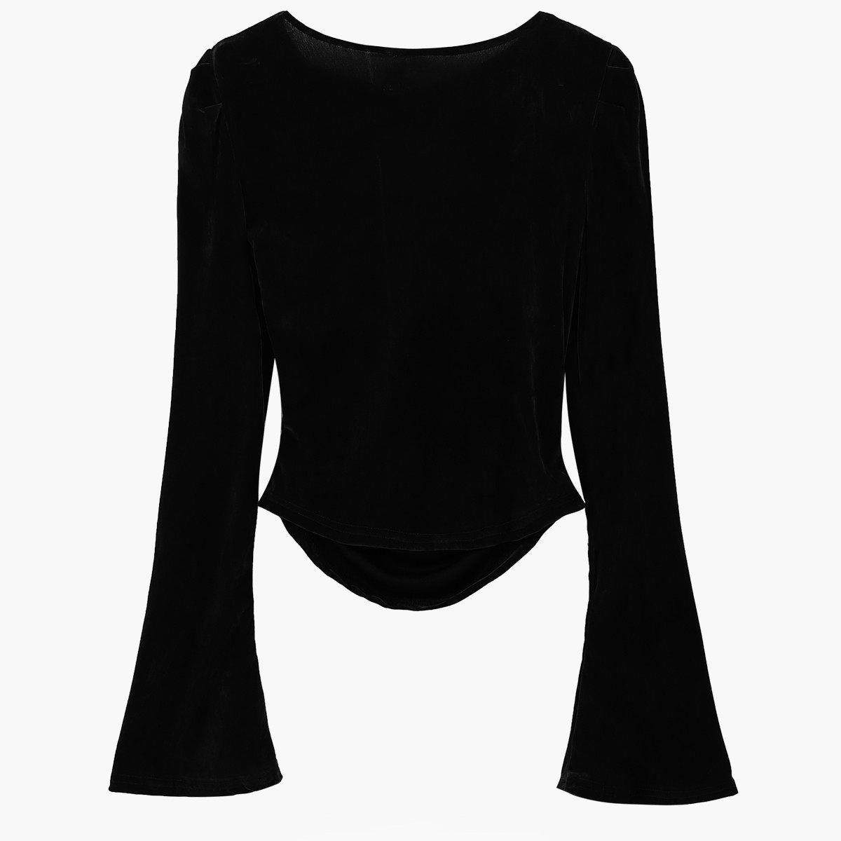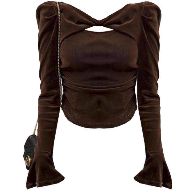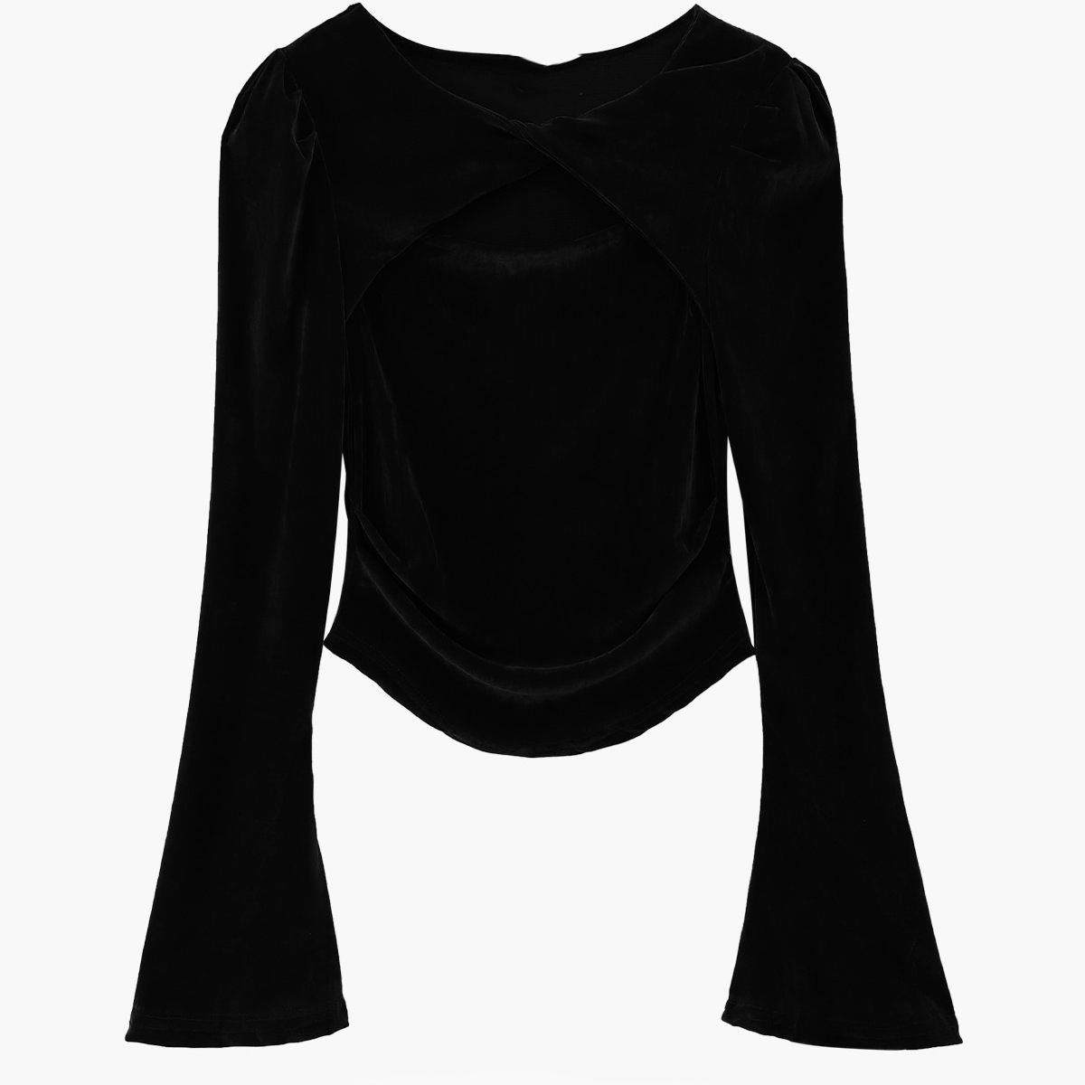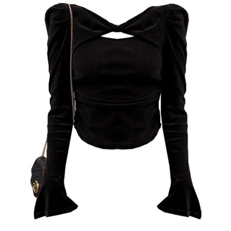 新品香港秋冬新法式金丝绒镂空长袖T恤女喇叭袖修身显瘦打底上衣