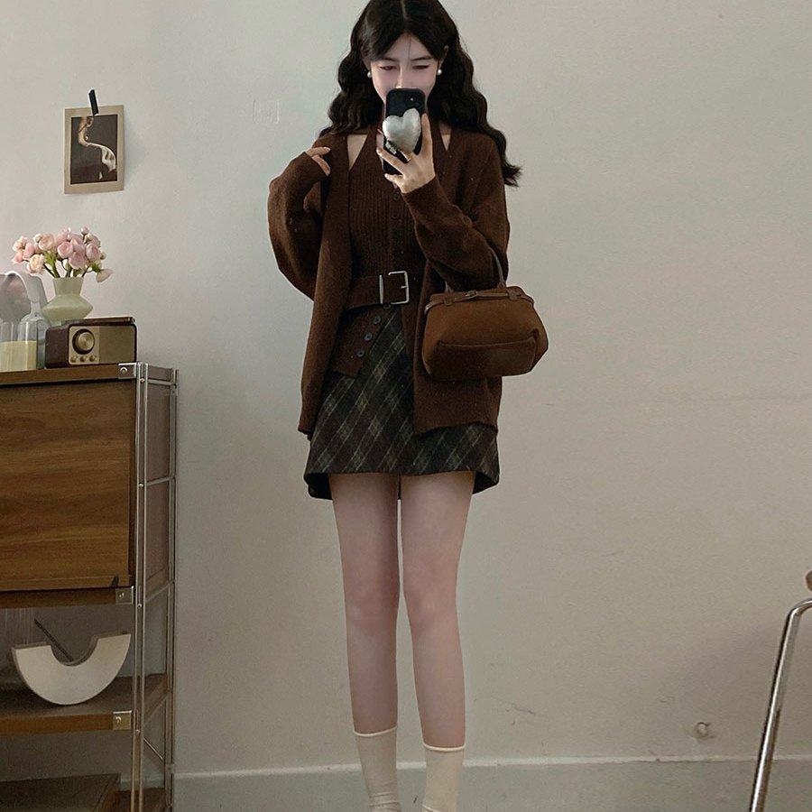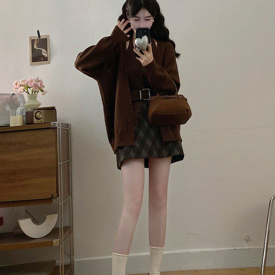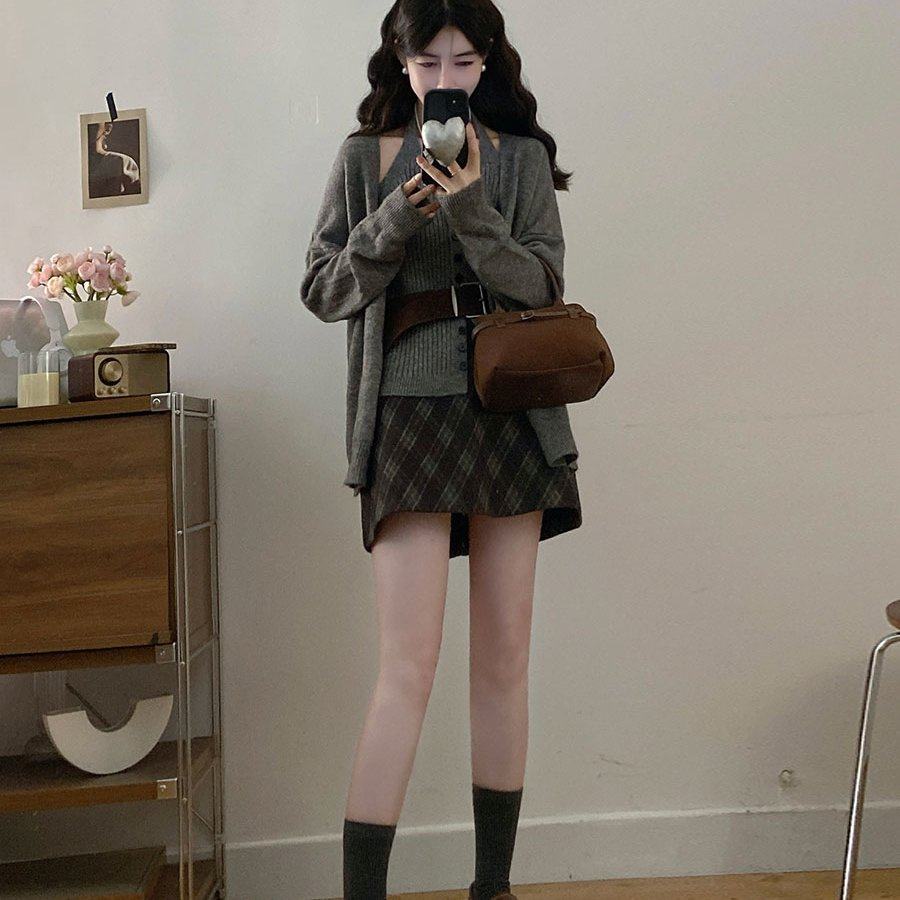 实拍大码女装法式慵懒挂脖吊带针织开衫格纹半身裙三件套套装