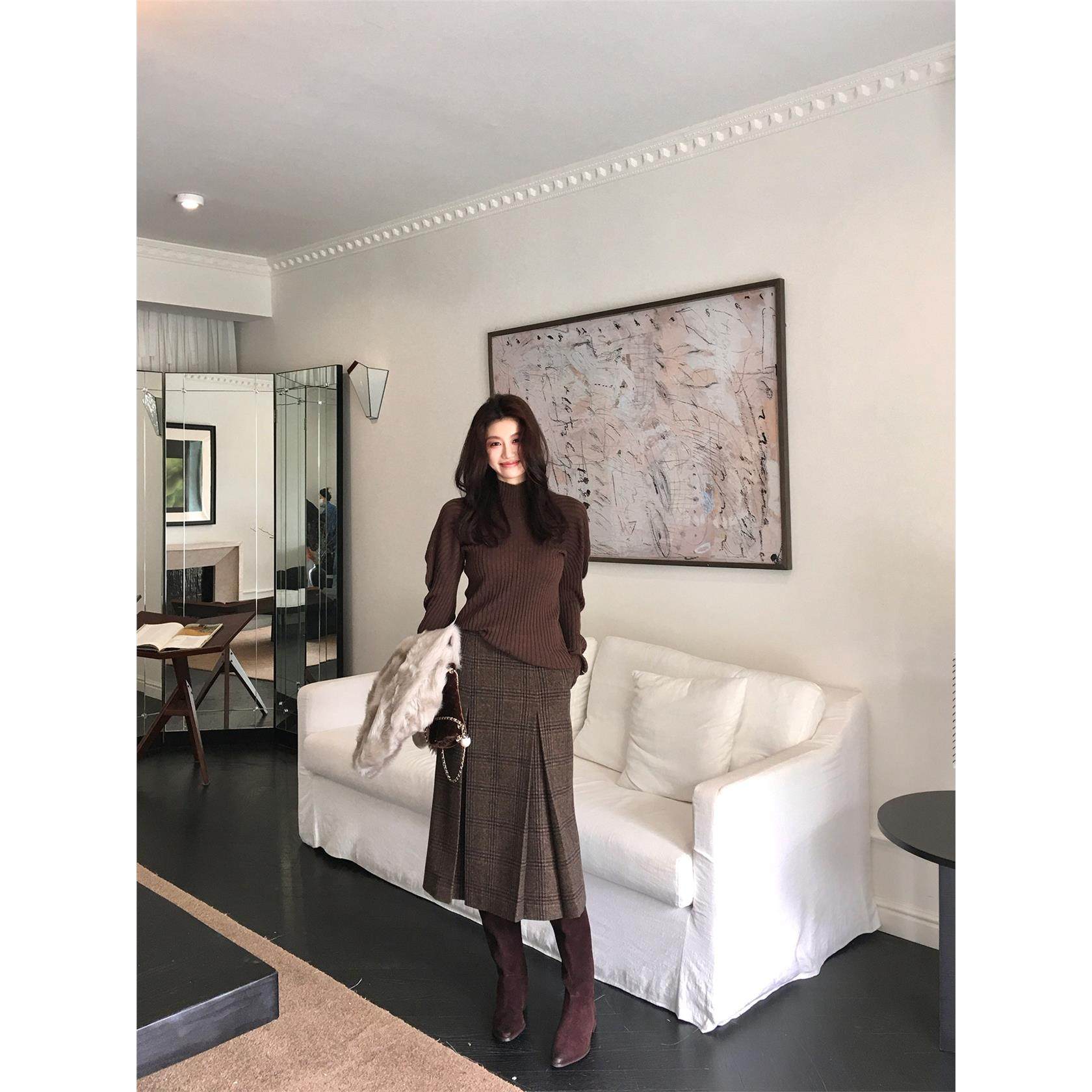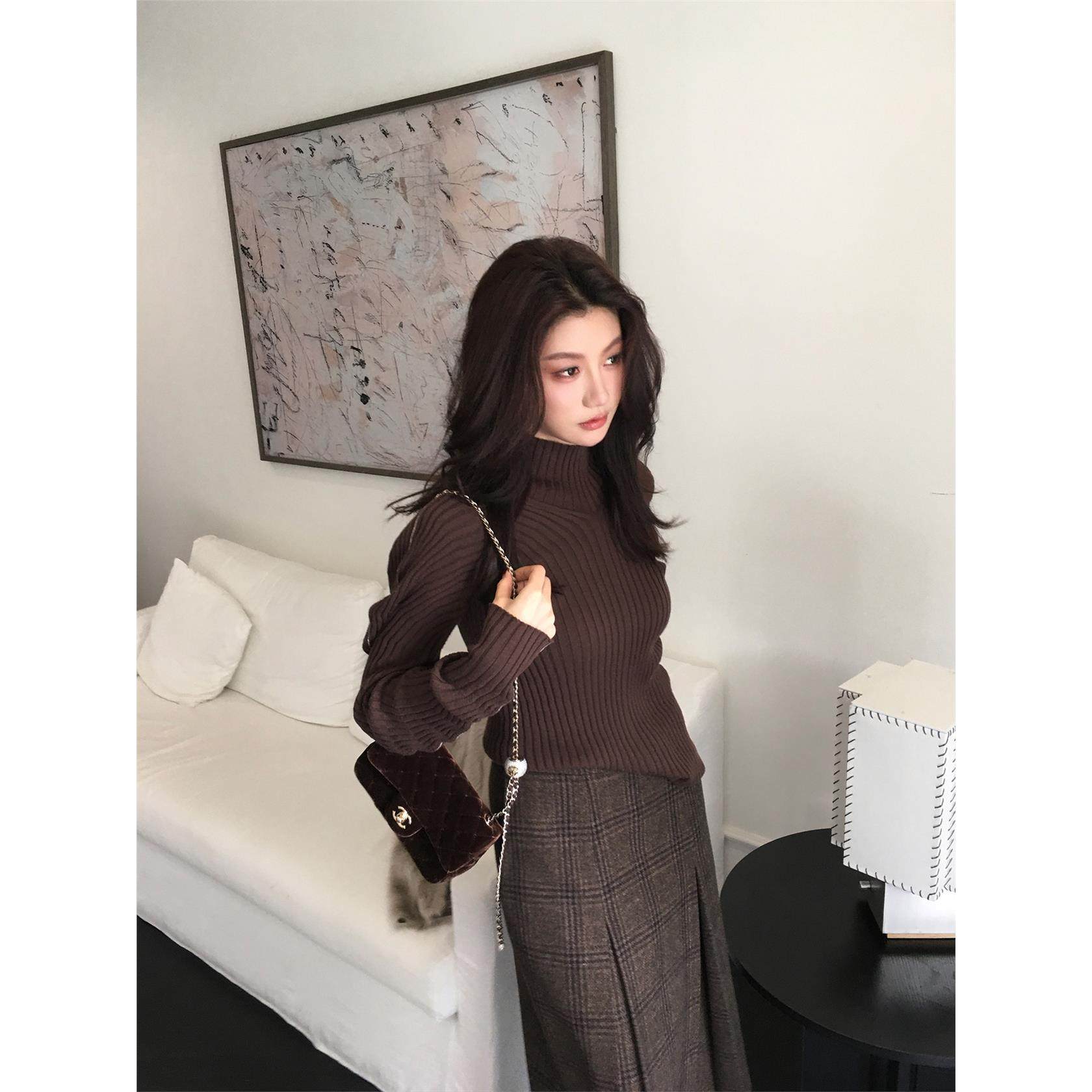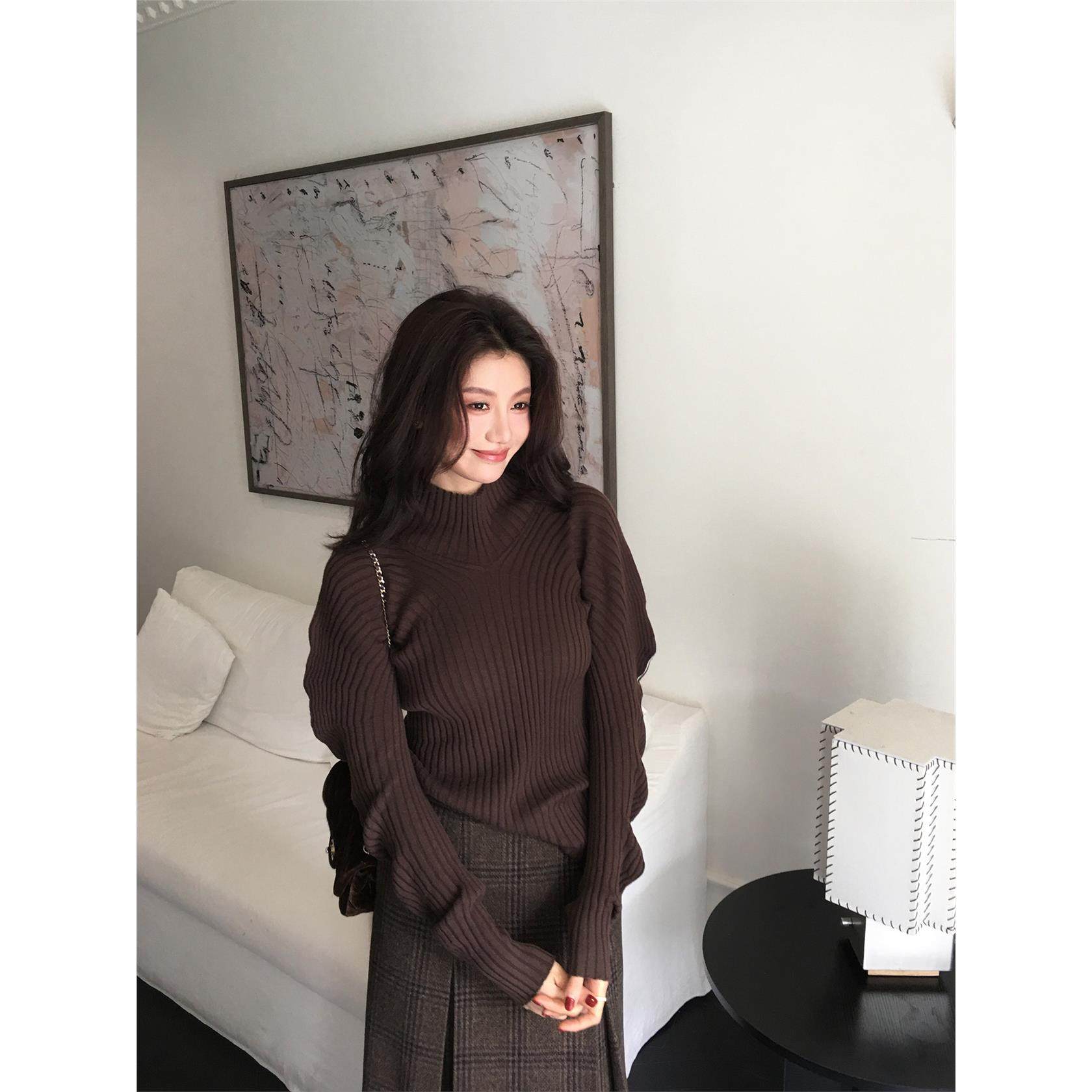 龍喜儿 复古坑条纹半高领毛衣女秋冬高级感绵羊毛打底针织衫D616