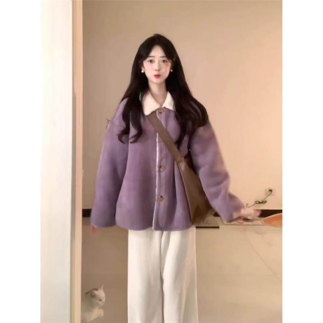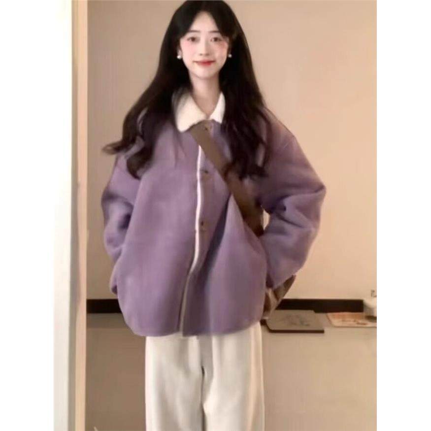 紫色冬季外套女2025新款宽松百搭麂皮一体翻领加绒加厚保暖羊羔毛