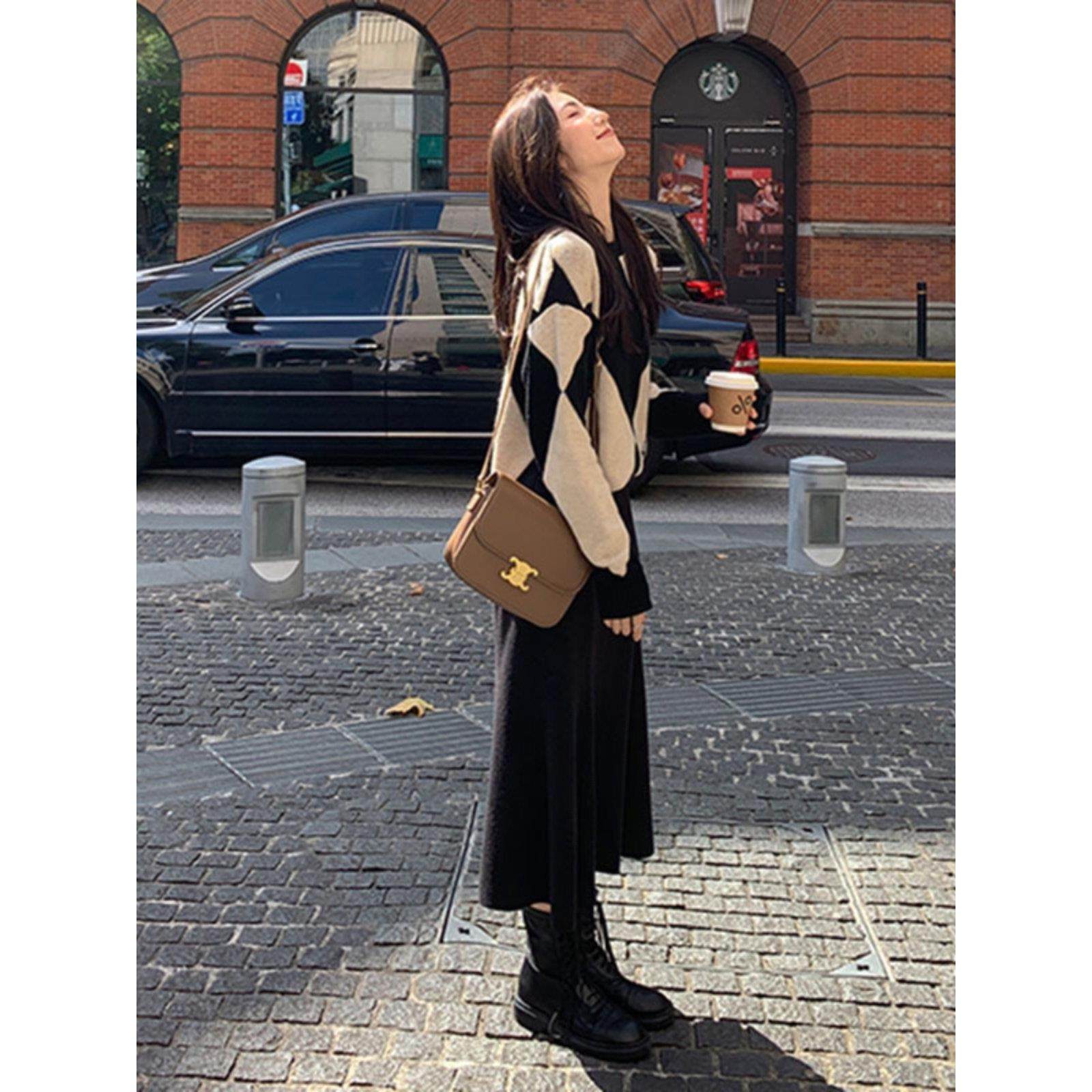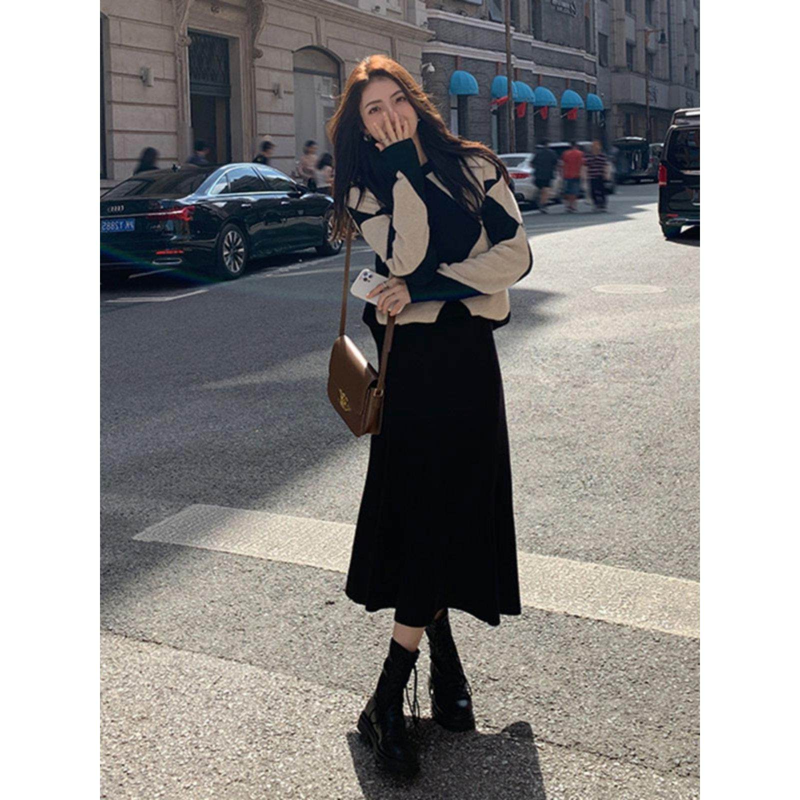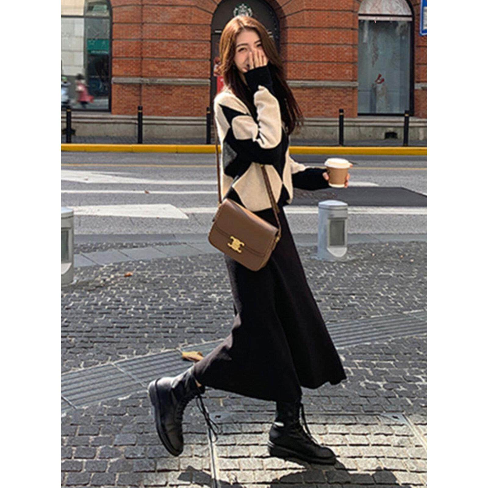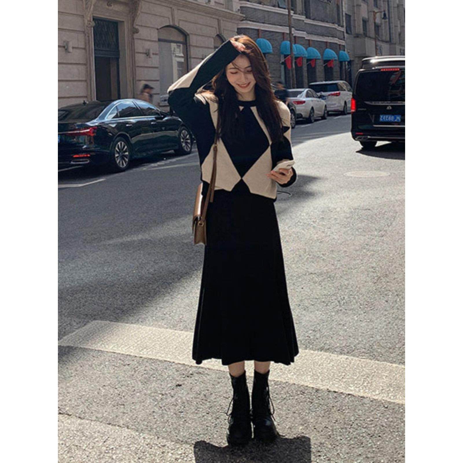 首页> 女装> 欧洲站秋装新款港味覆古桔梗盐系温柔风显瘦菱格毛衣半身裙两件套