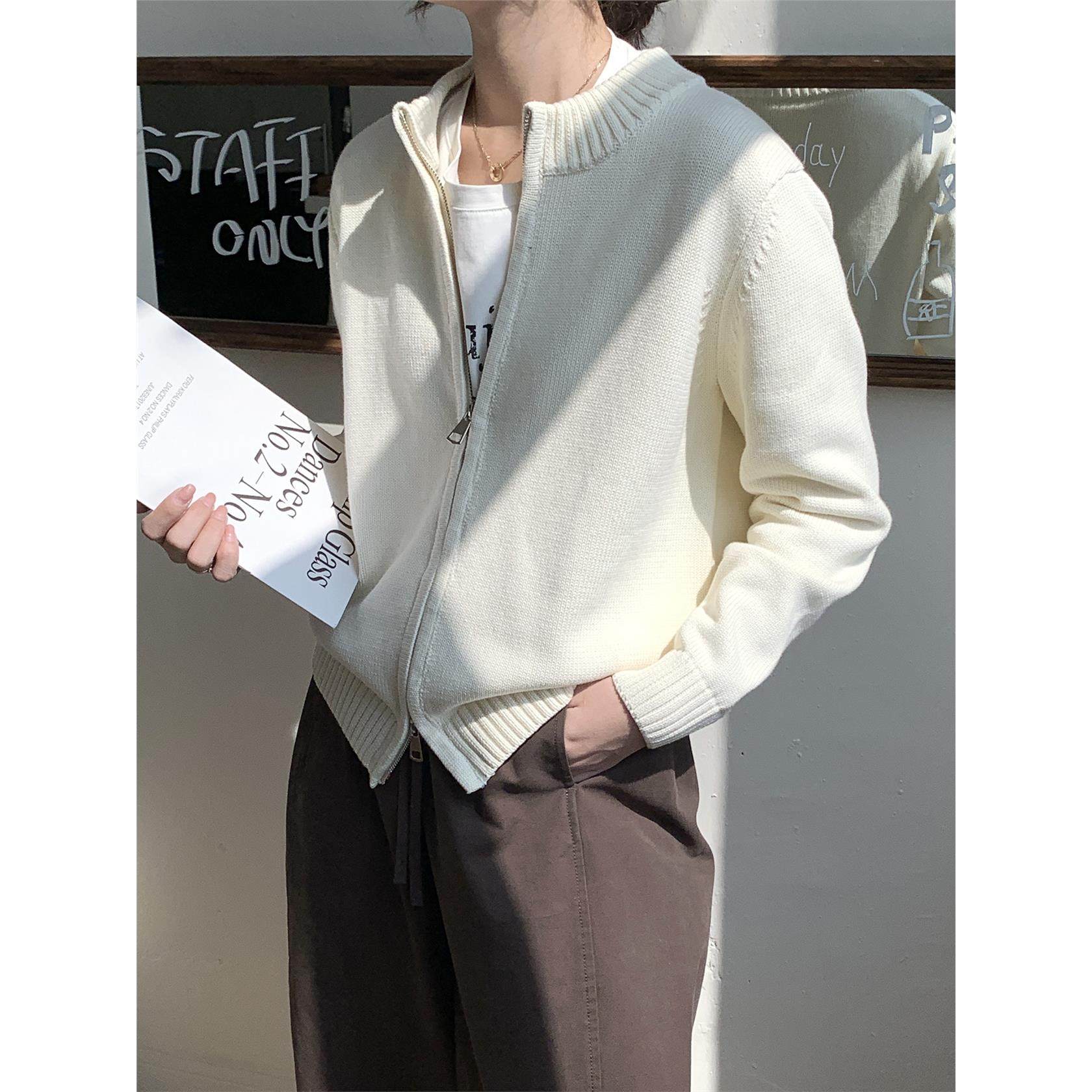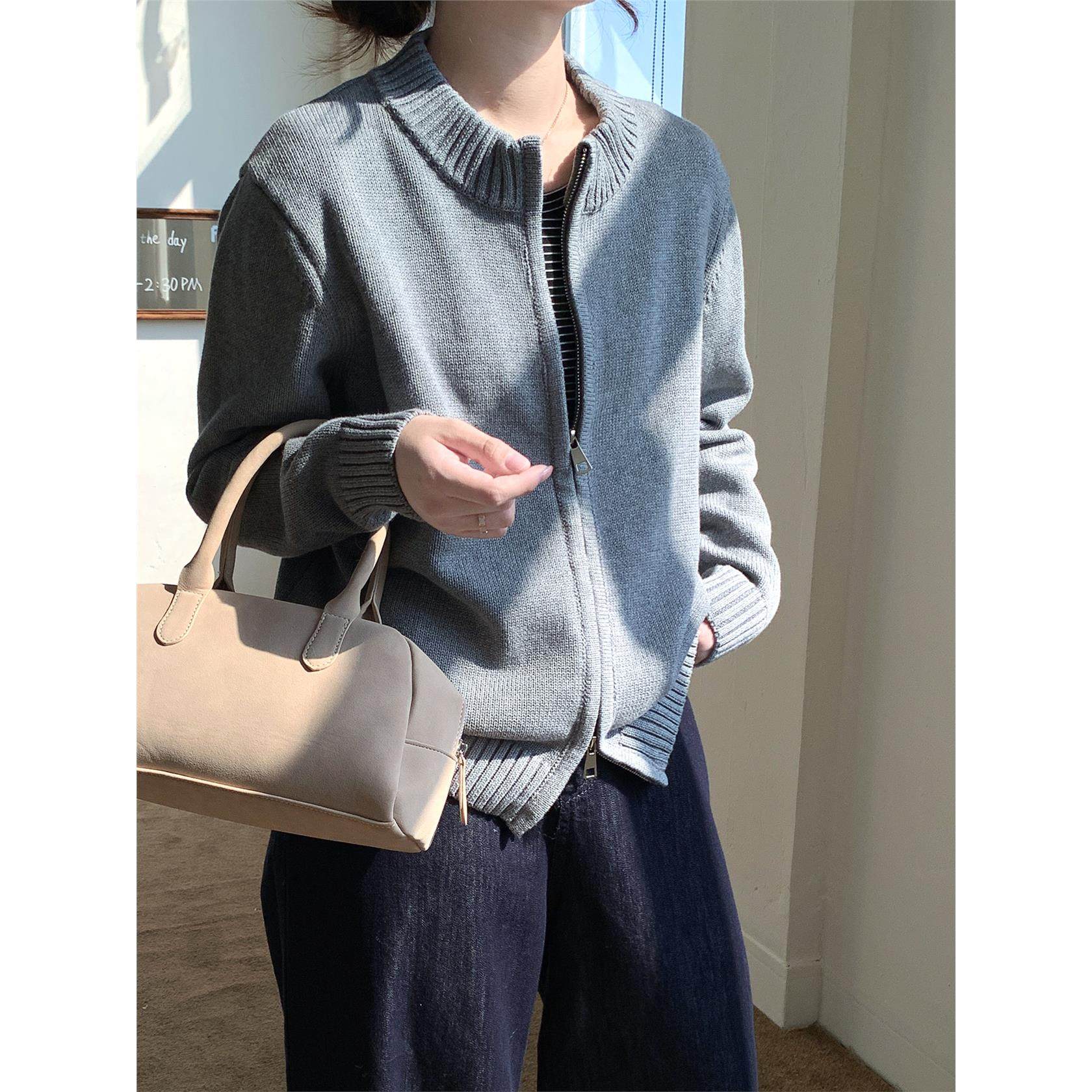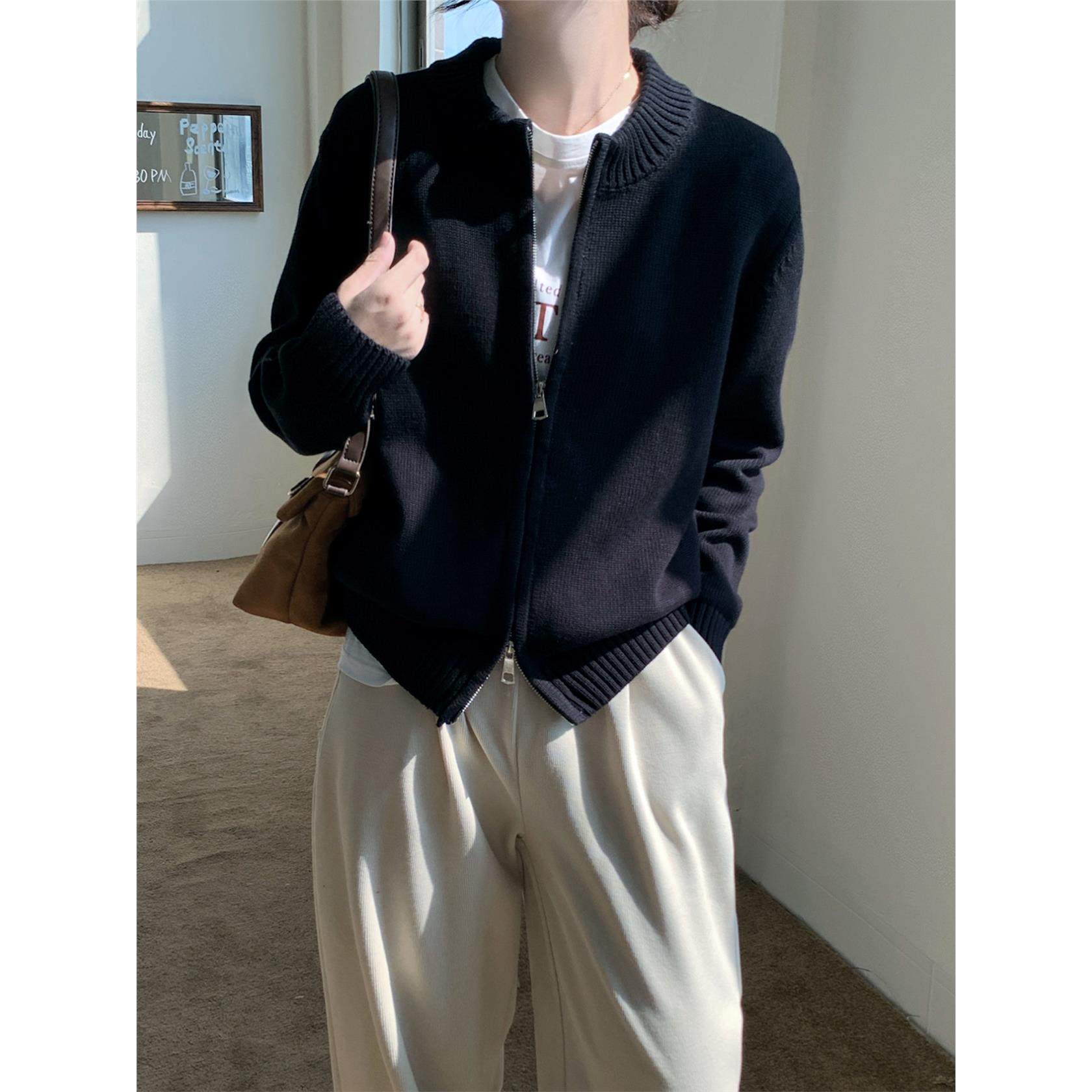 100%纯棉红色针织开衫女长袖高领春秋冬季加厚全棉线拉炼毛衣外套
