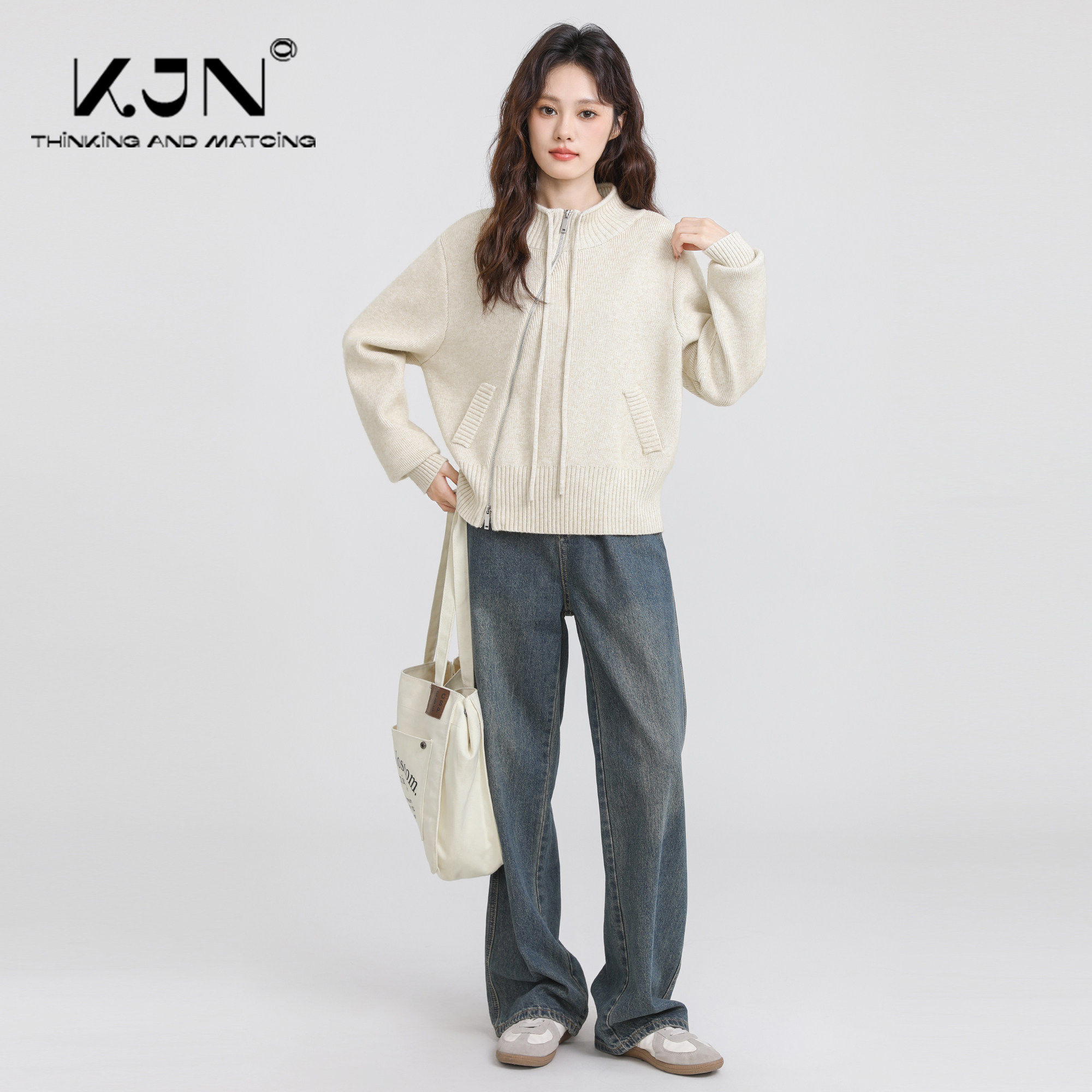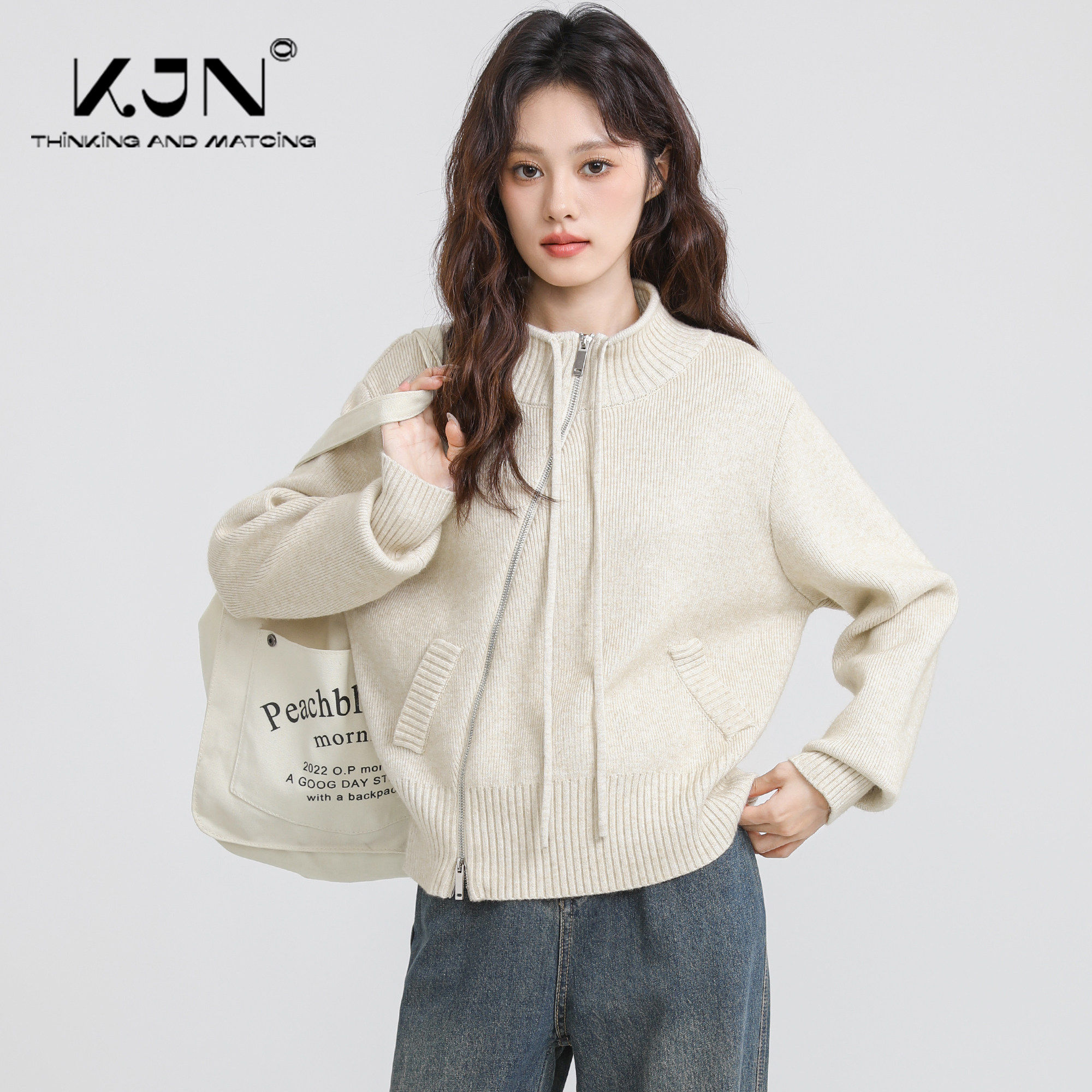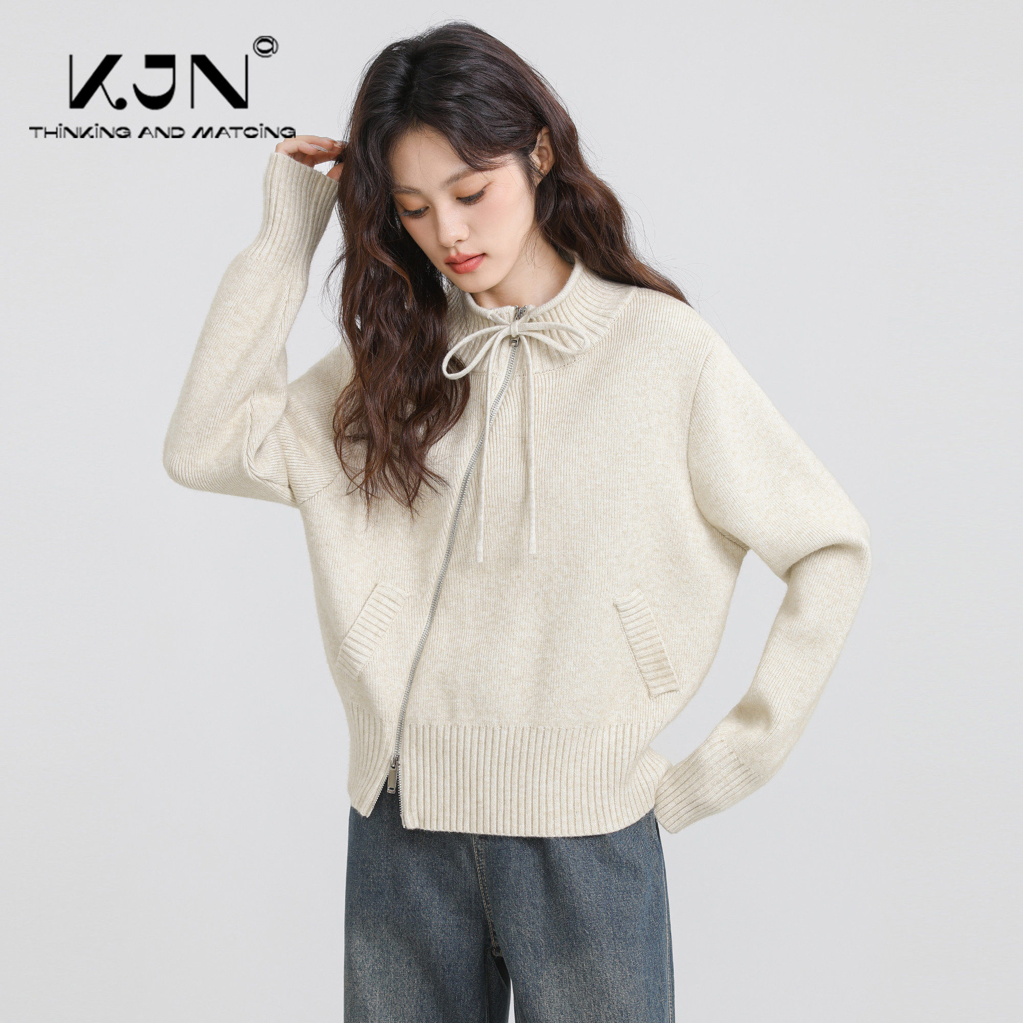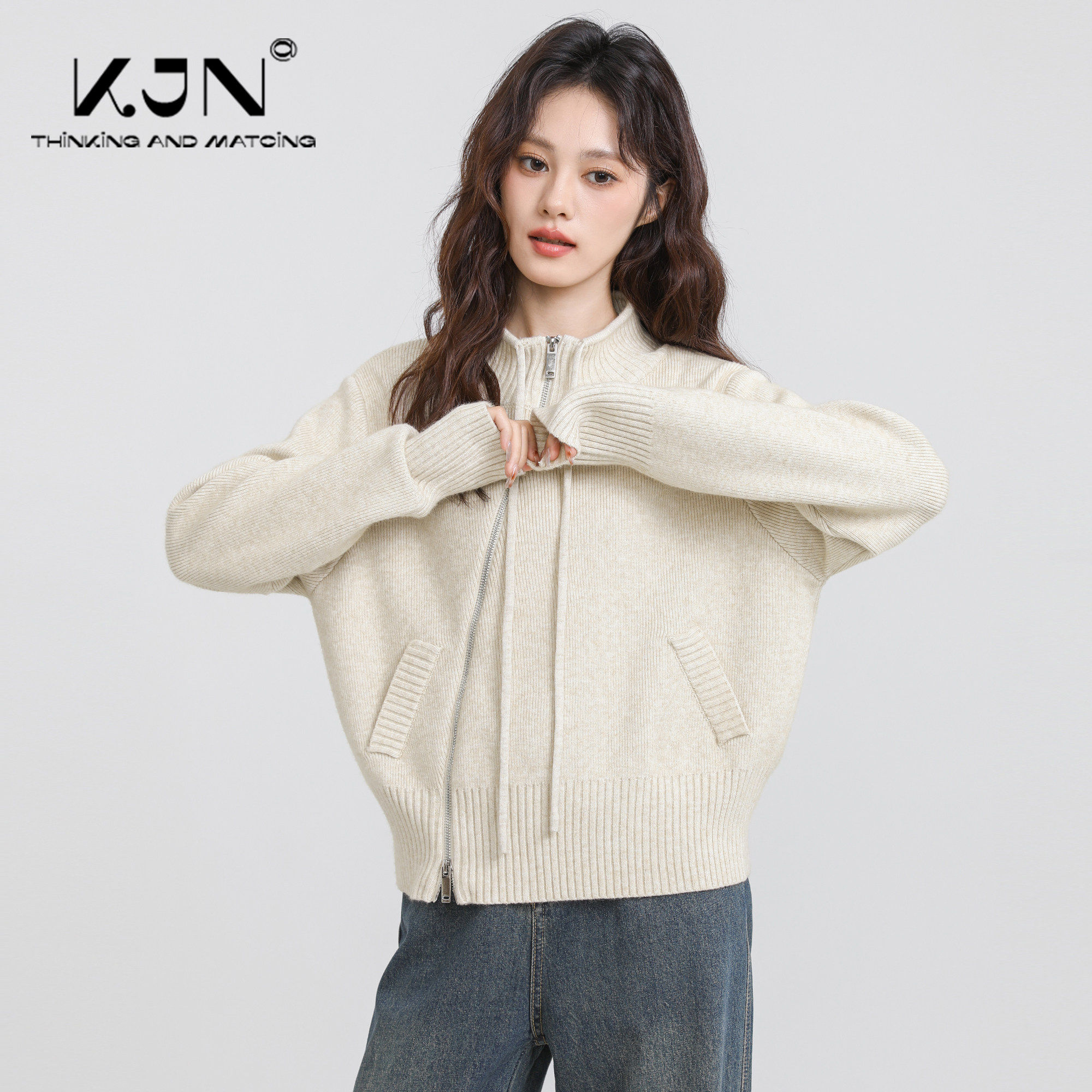 半高领加厚毛衣外套女2025春秋新款不规则双拉链立领针织开衫上衣