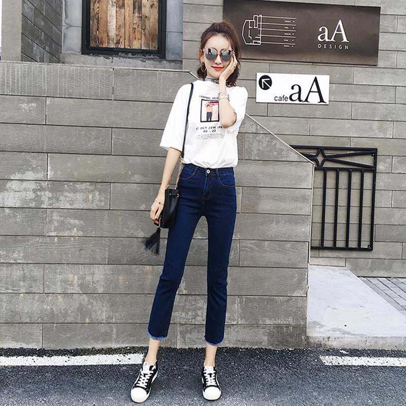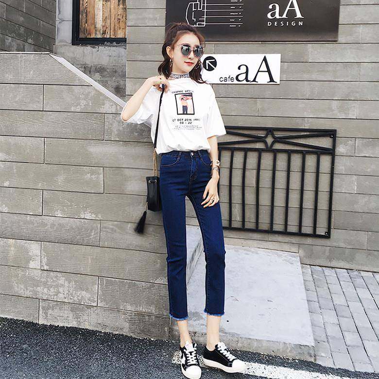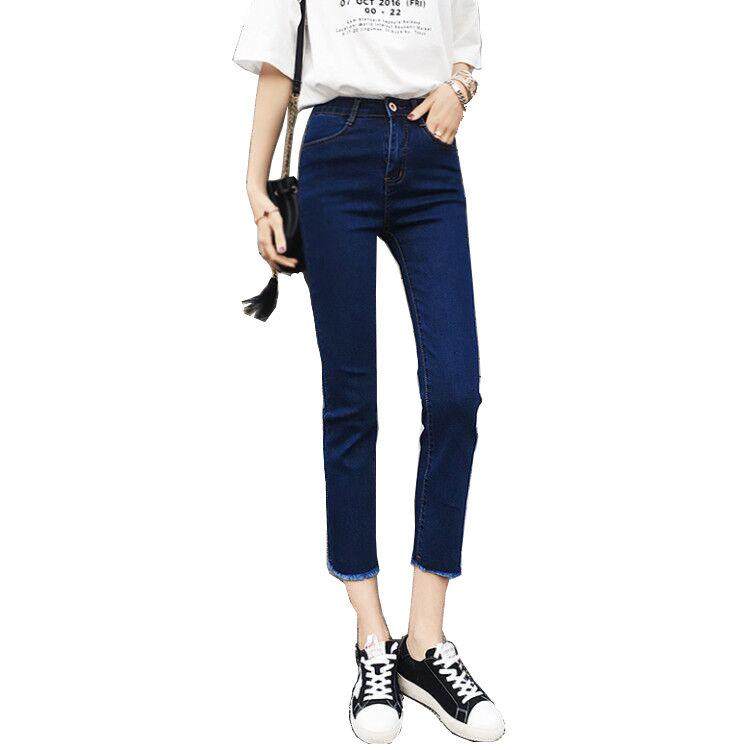 2025春秋新款深蓝色毛边牛仔裤女高腰显瘦九分八分超火修身直筒裤