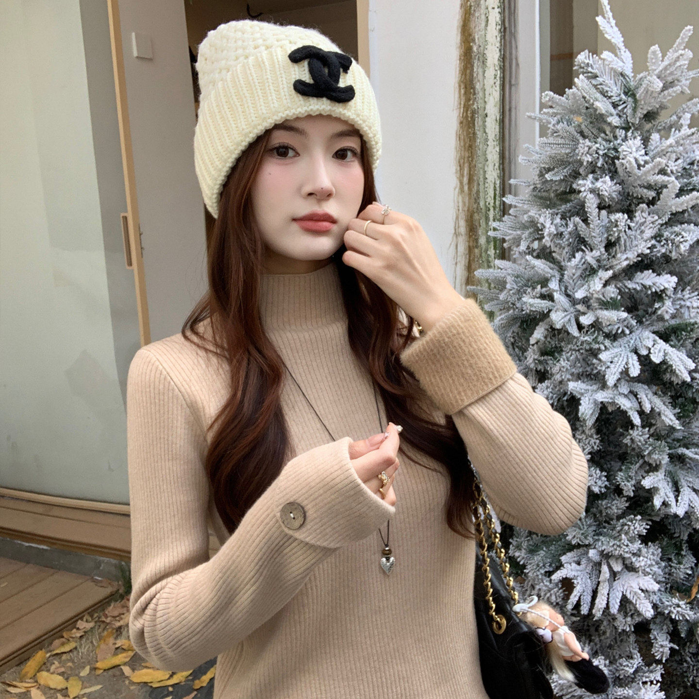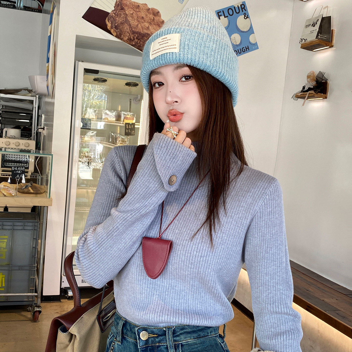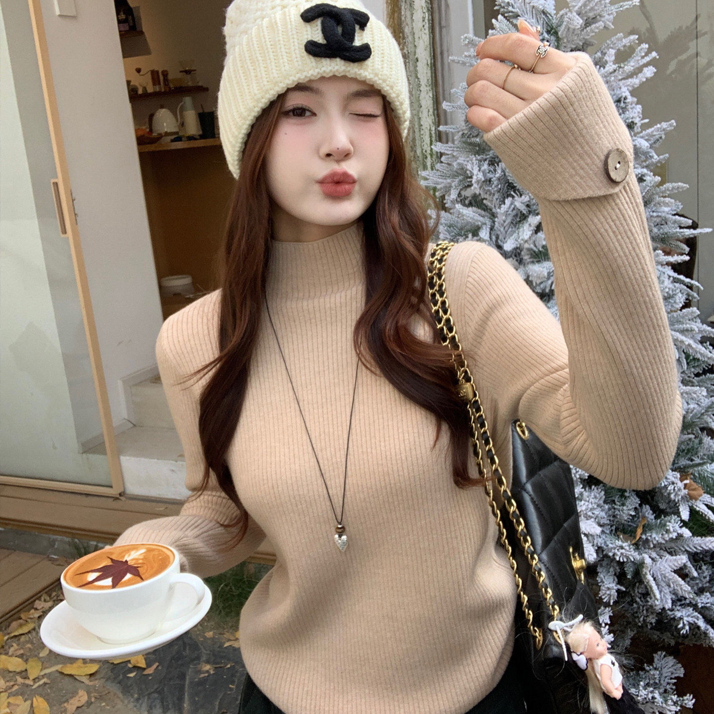 龙妹家杏色半高领加绒加厚毛衣女内搭打底衫2025新款冬季针织上衣