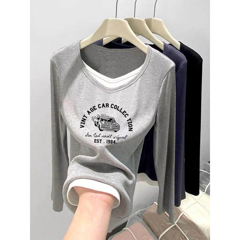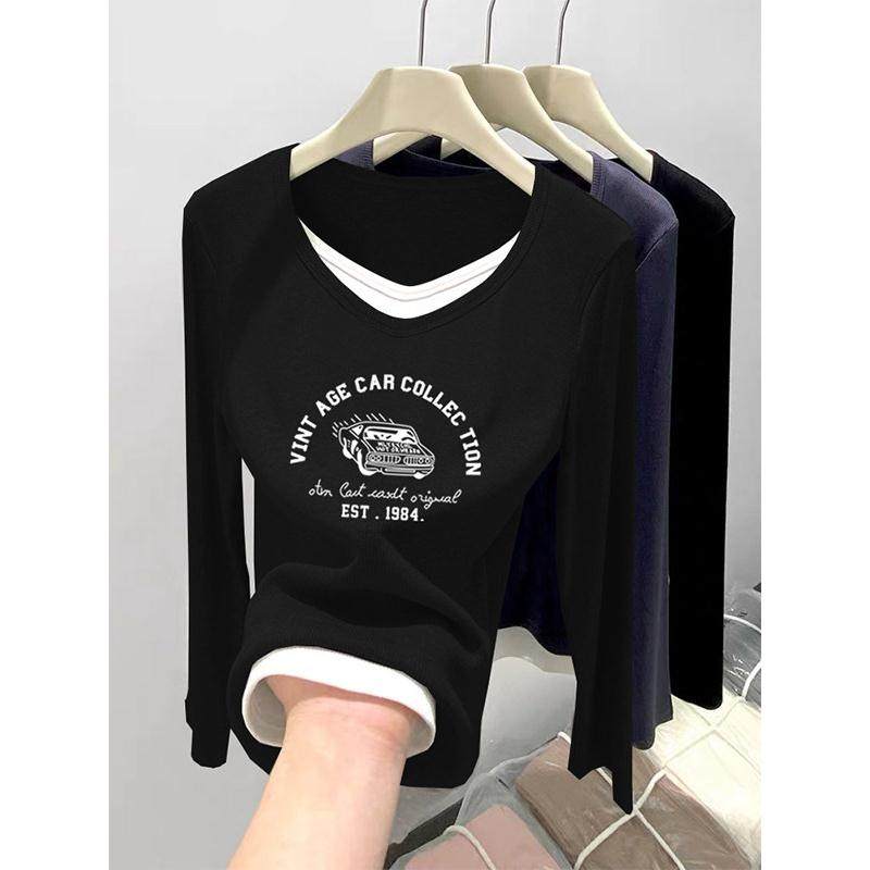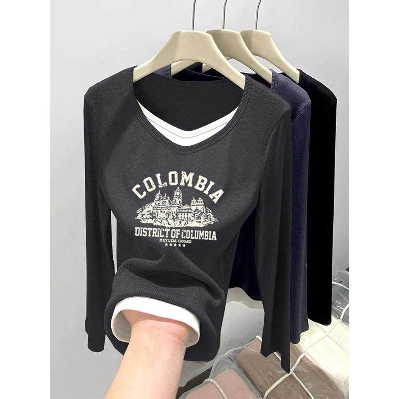 韩国新款假两件V领纯棉正肩长袖t恤女设计感黑色打底衫上衣春秋季