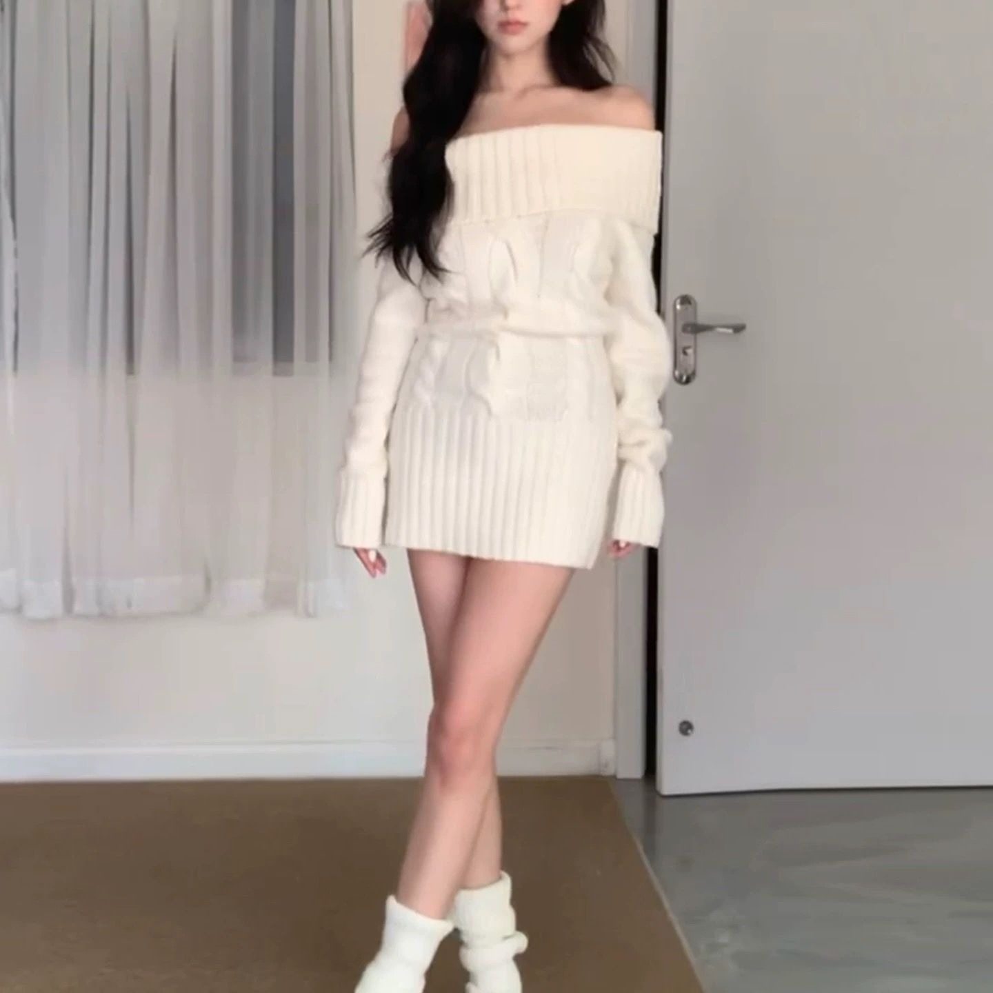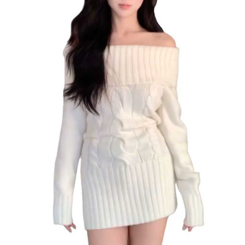 白色一字肩针织毛衣连衣裙子女春秋季新款配大衣内搭包臀短裙