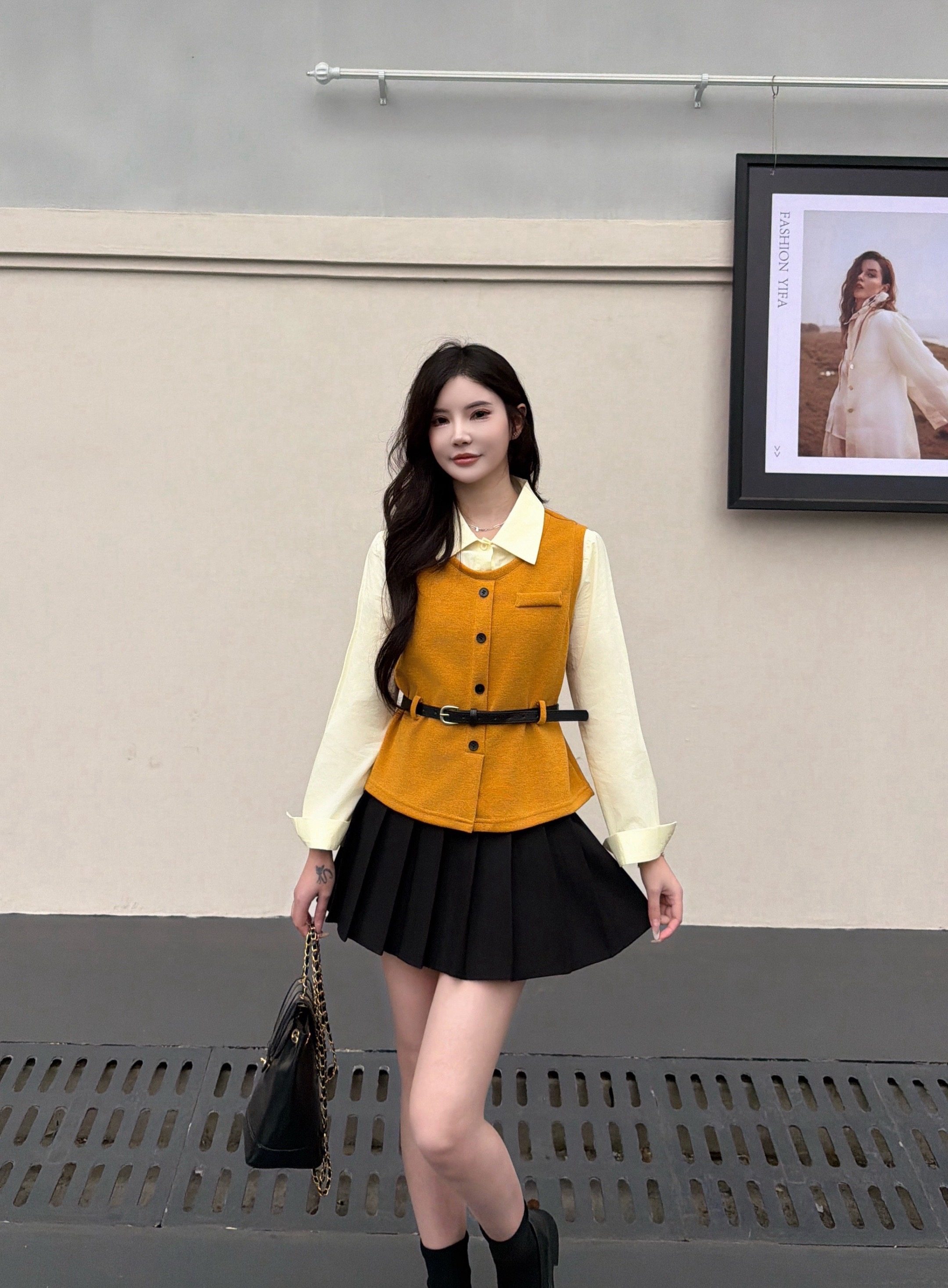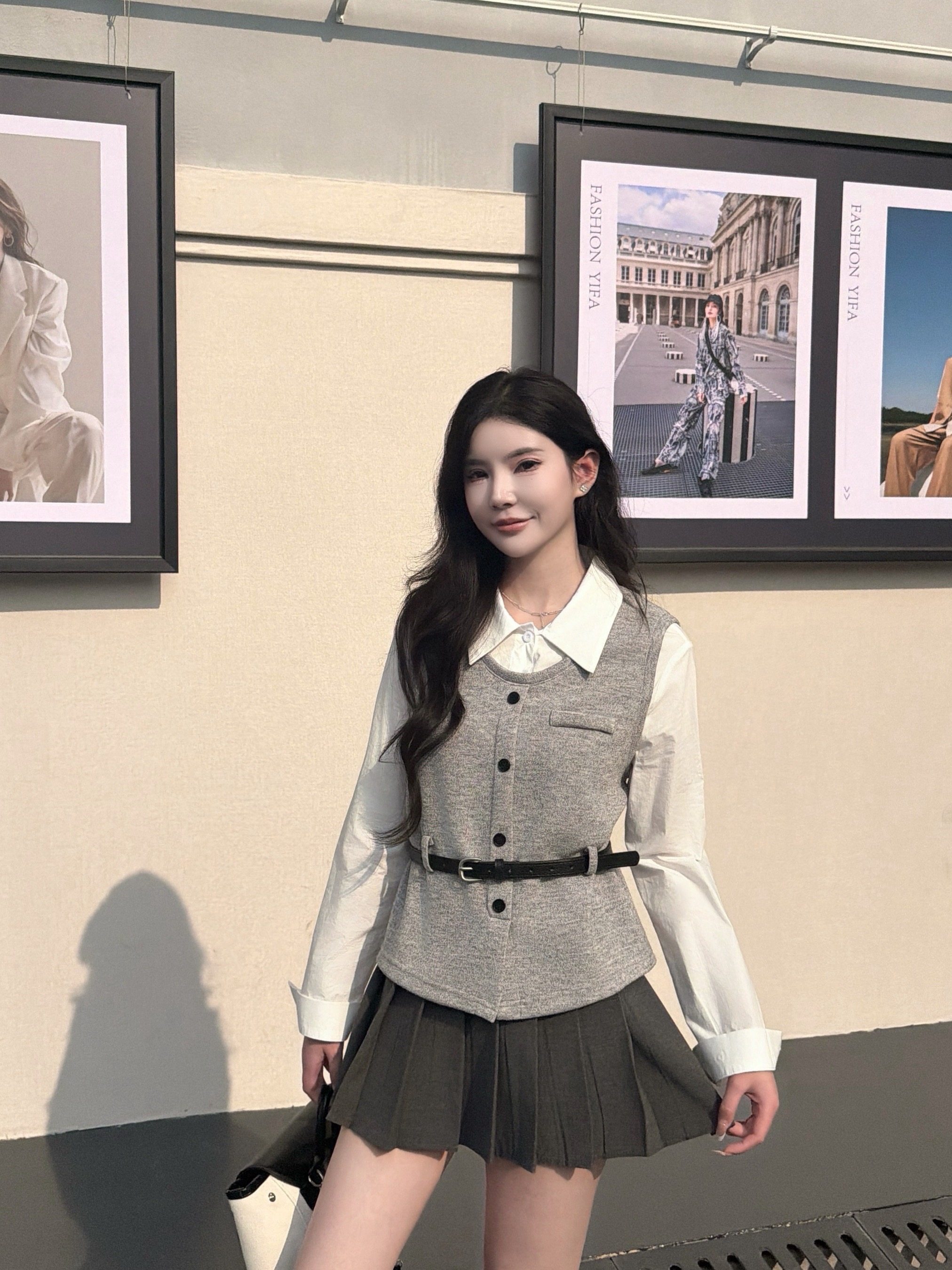 韩版气质假两件马甲衬衫女2026春季新款显瘦收腰上衣配腰带潮s212