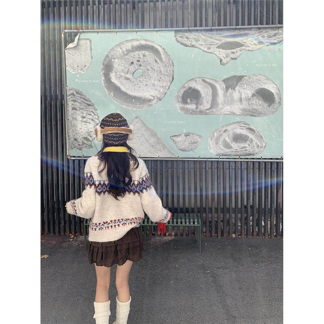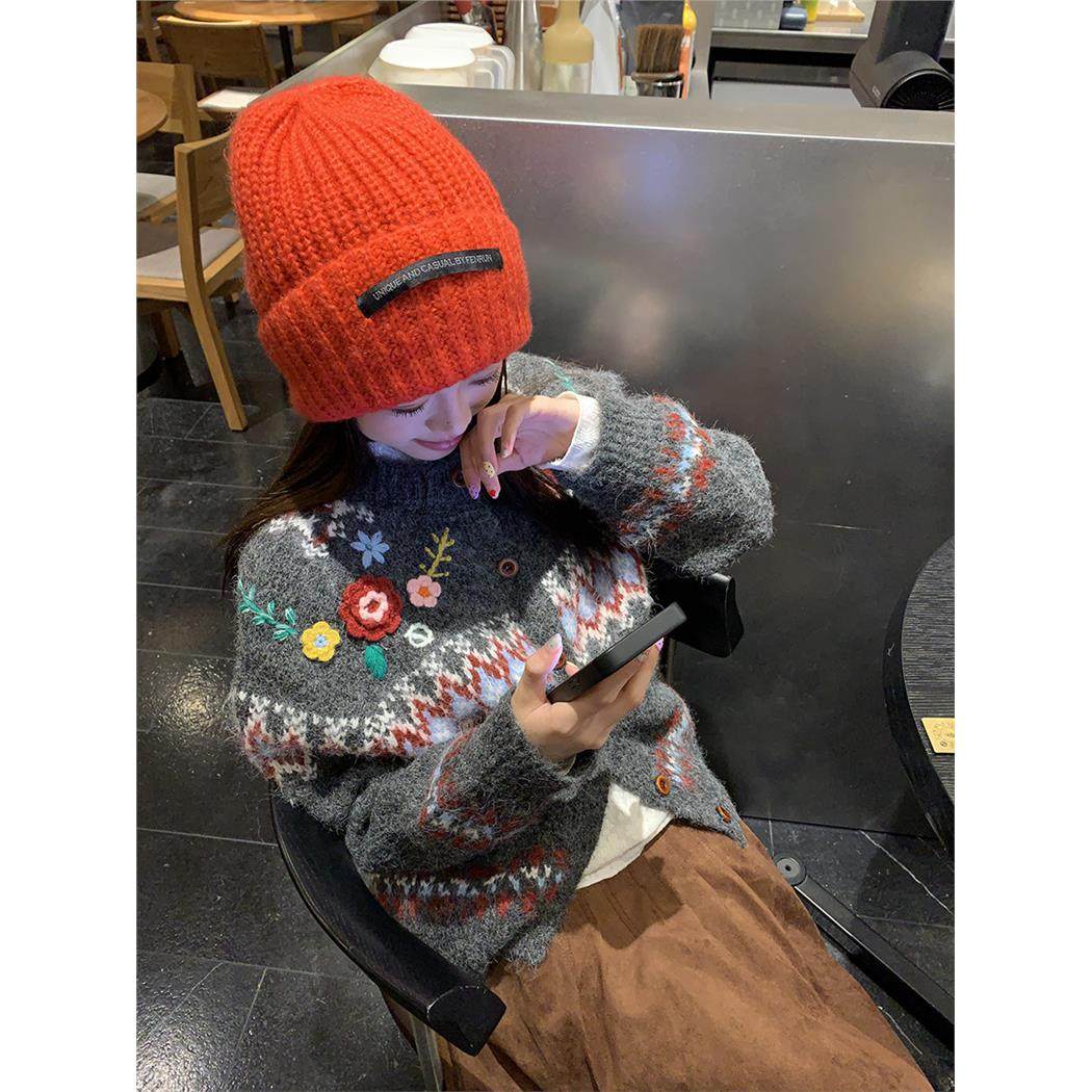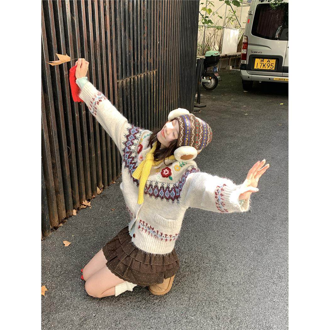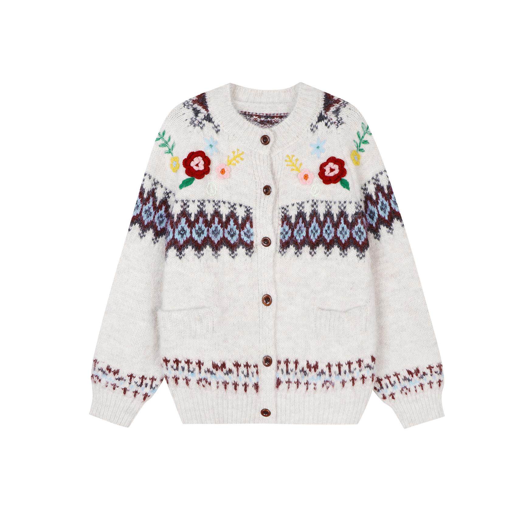 馨帮帮 甜美少女立体花朵毛衣2025新款费尔岛钩花单排扣针织开衫