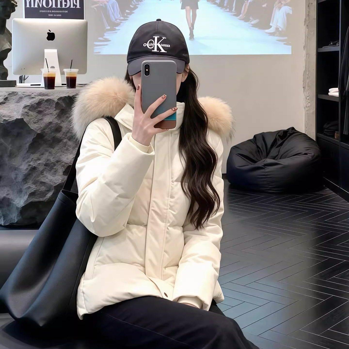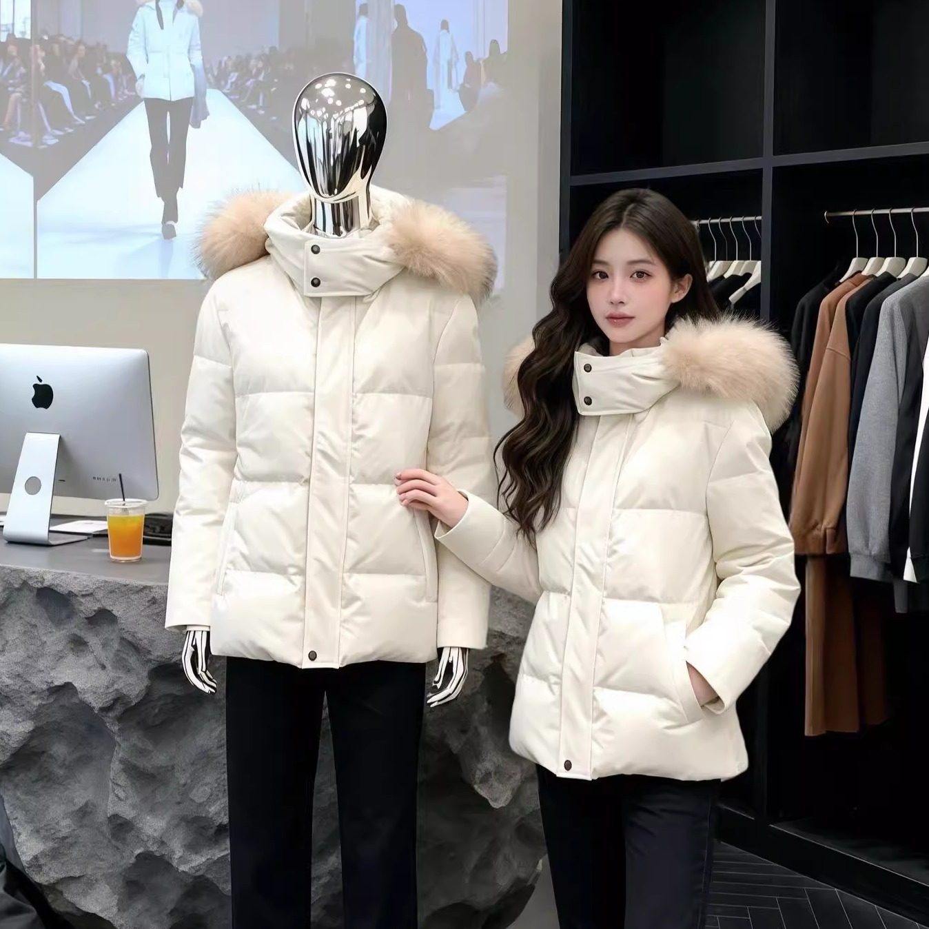 白色收腰羽绒服女2025新款短款大毛领修身小个子白鸭绒加厚外套冬