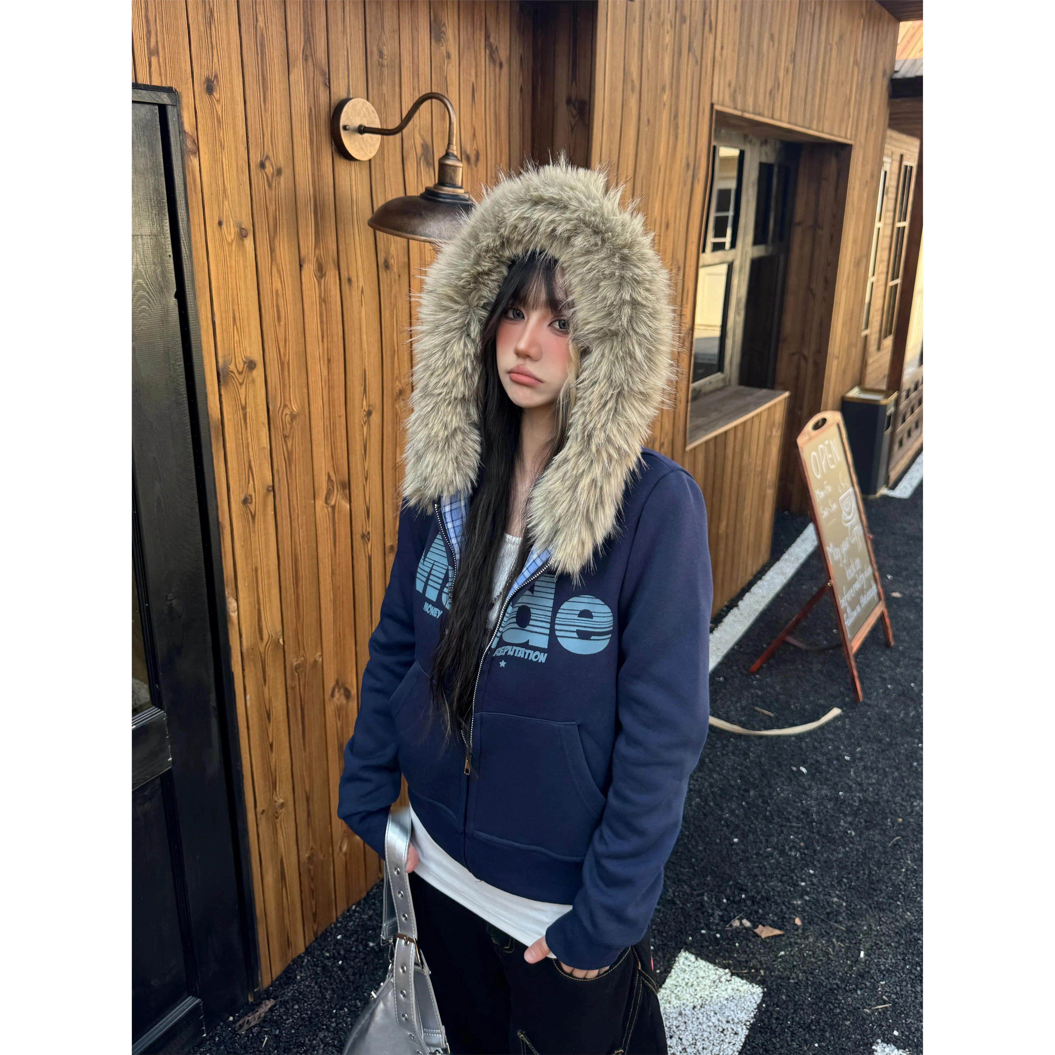 Amoeba美式覆古毛领连帽卫衣拉炼开衫字母印花秋季短款宽松外套女