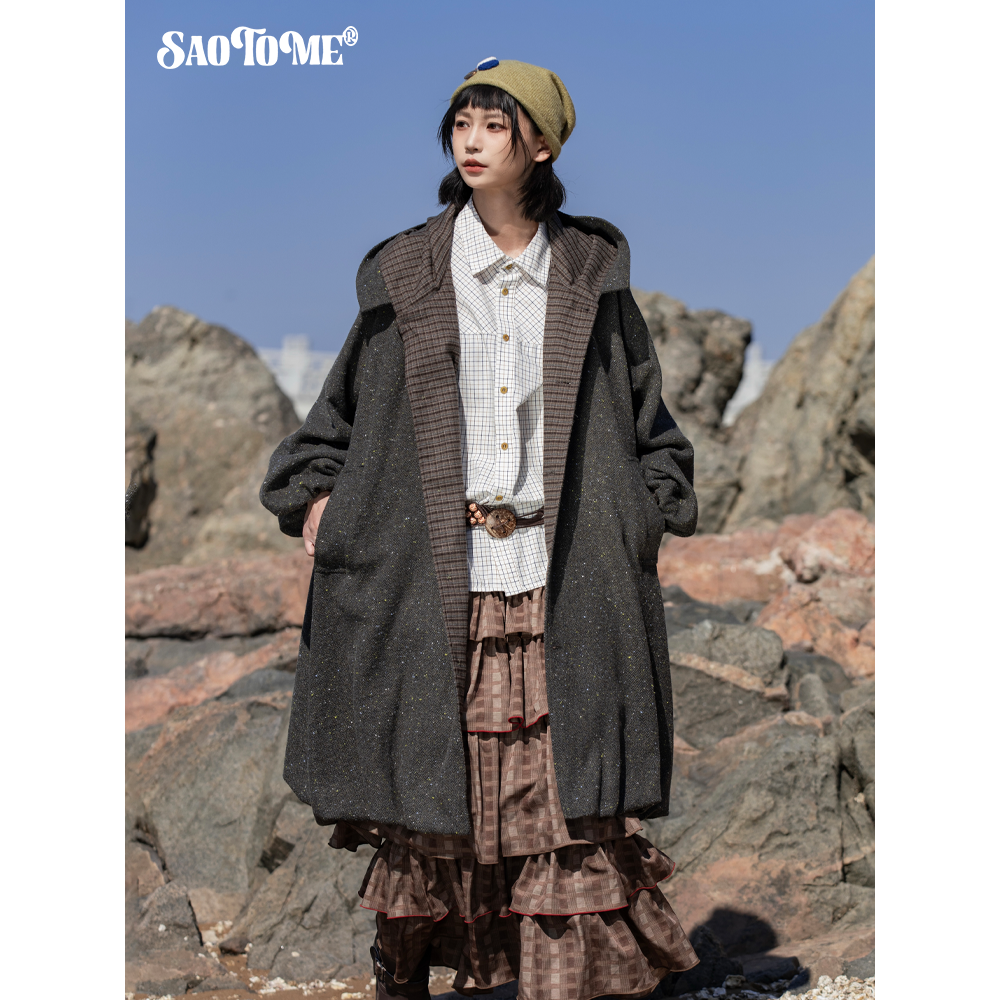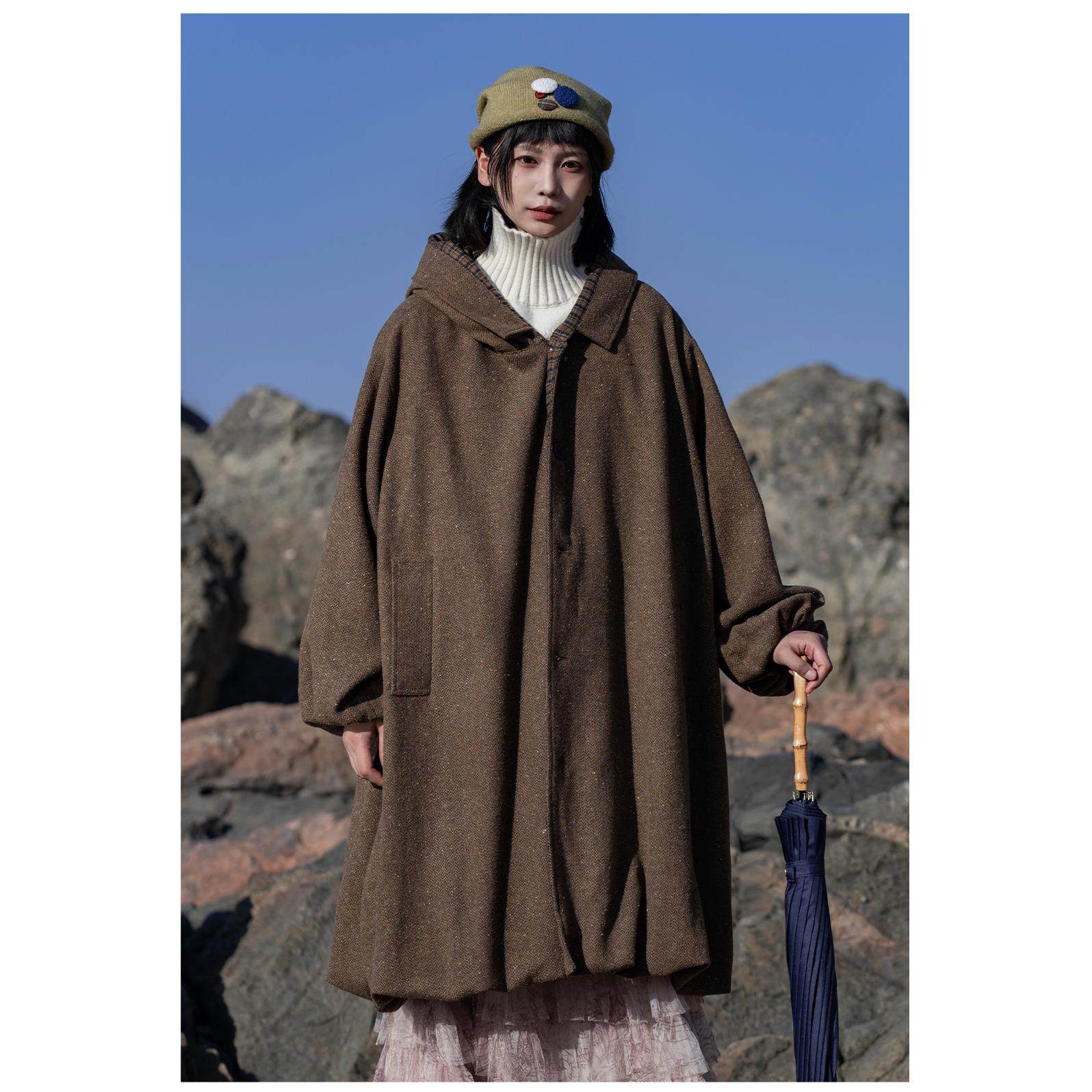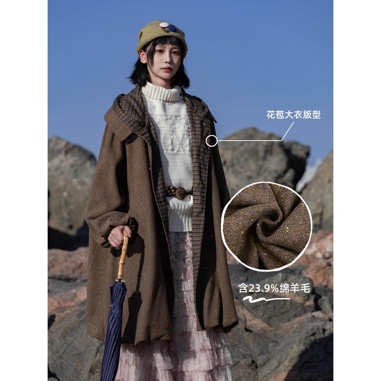 含羊毛早乙女惠子Saotome 日系复古连帽花苞毛呢中长款大衣