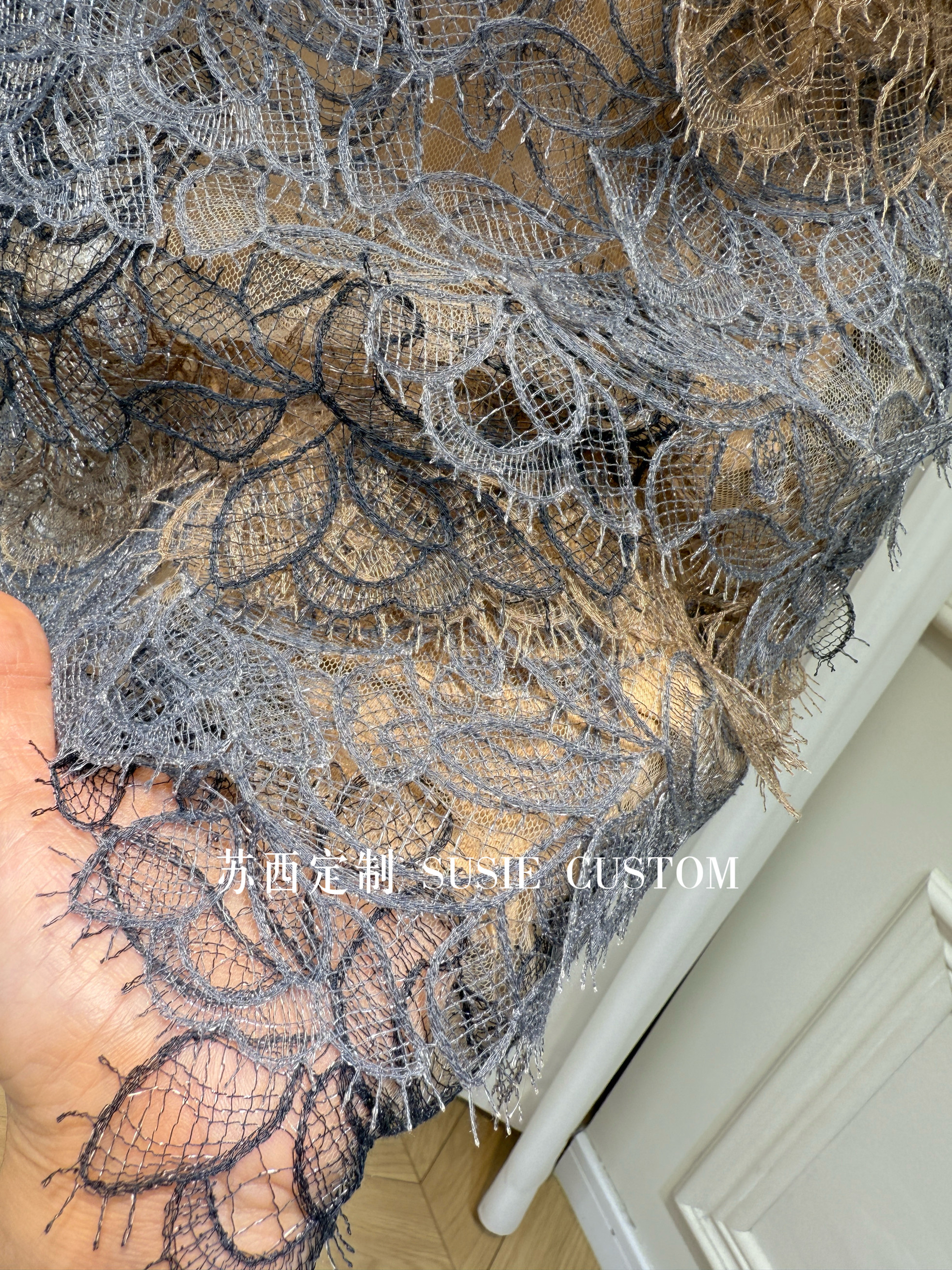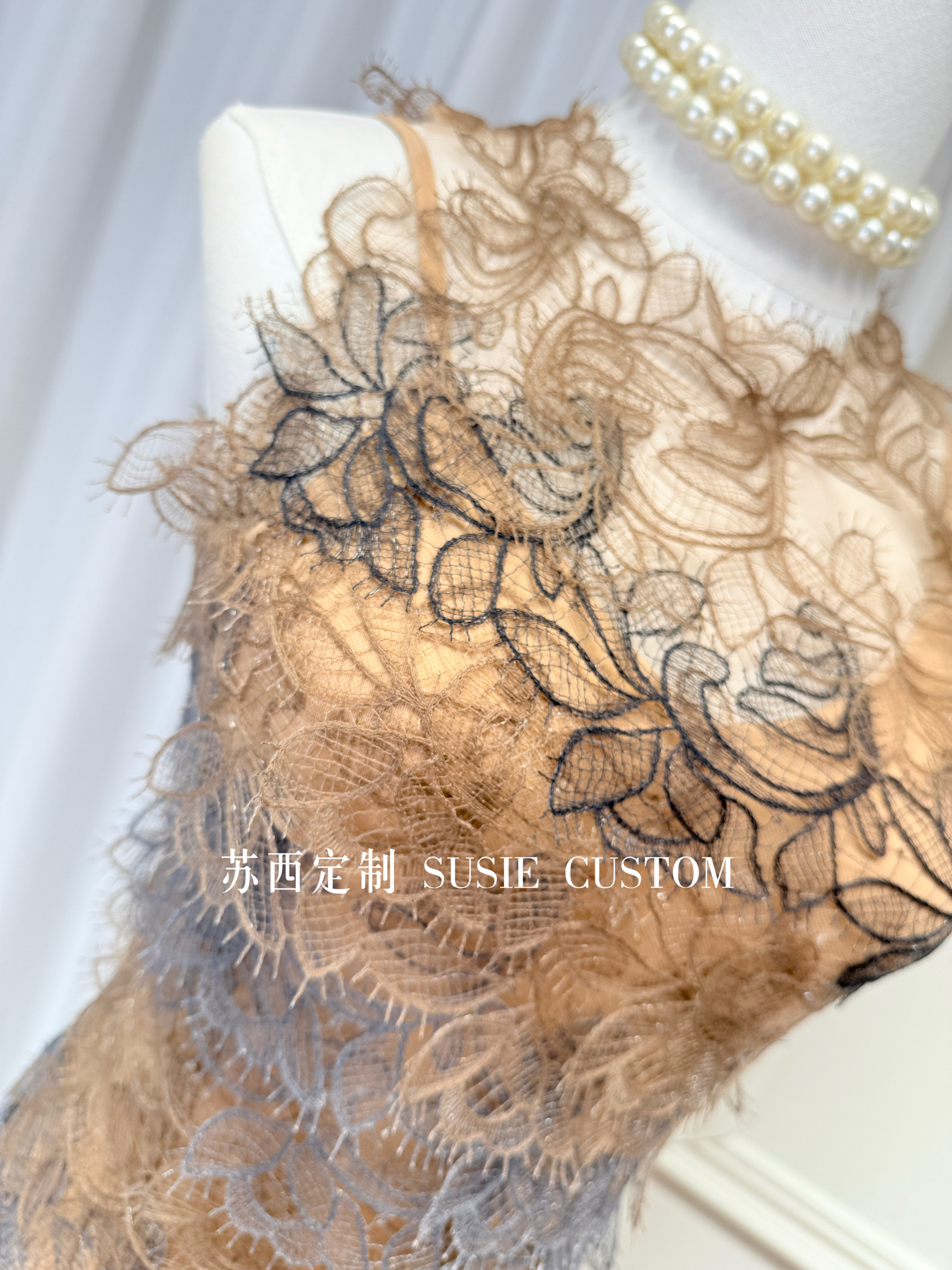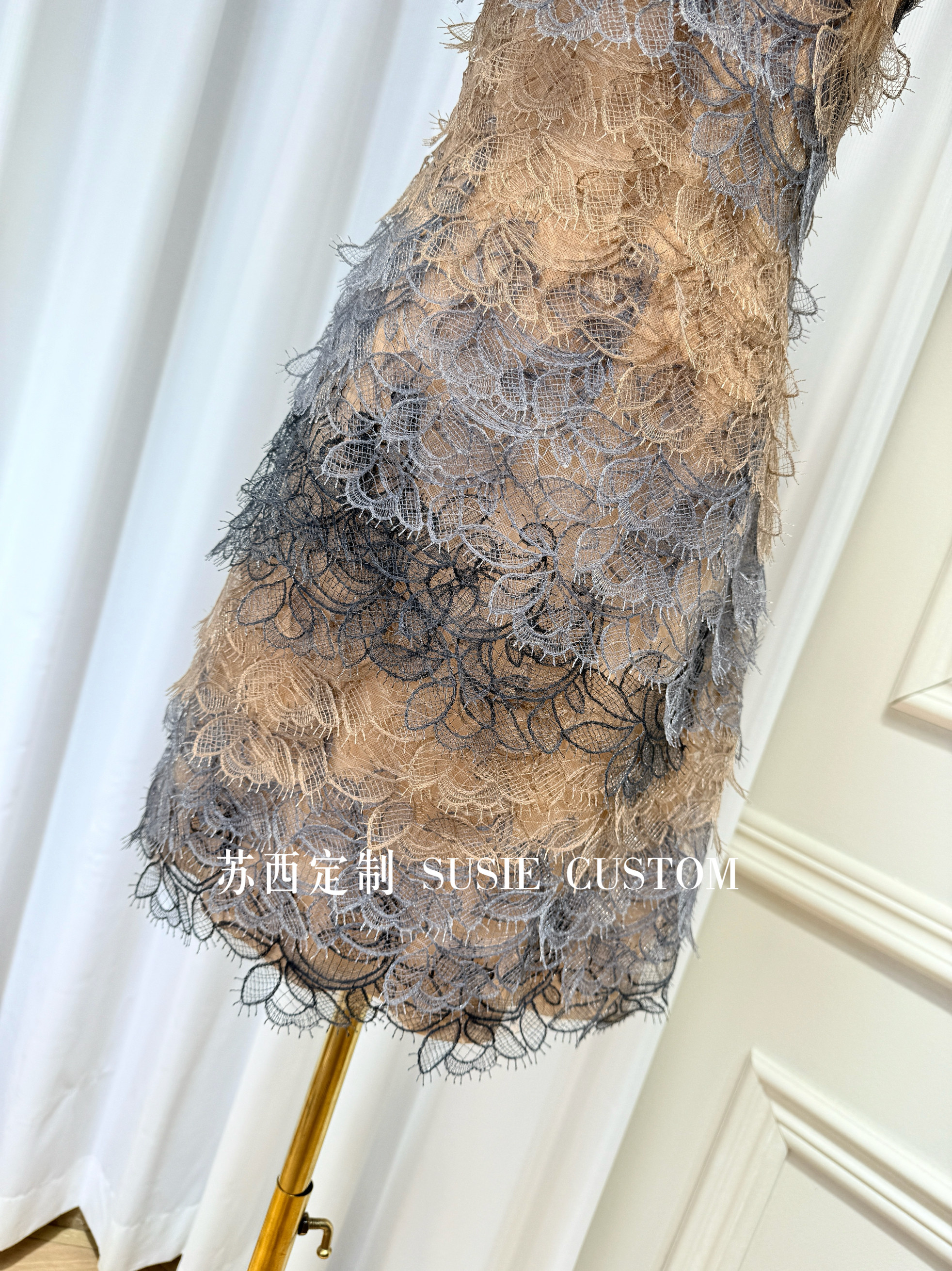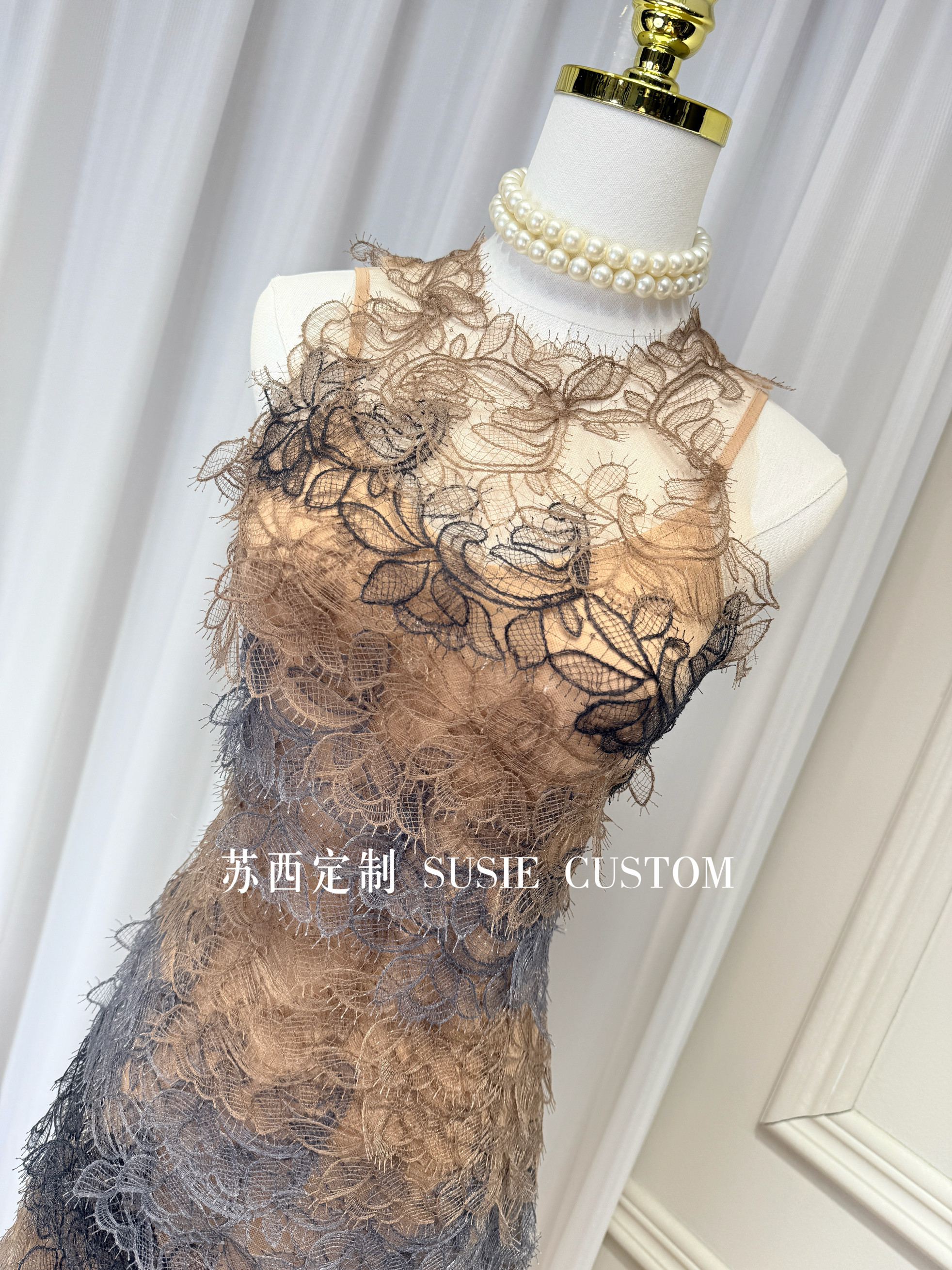高定设计款复古重工渐变色镂蕾丝层层裁剪收腰无袖修身连衣裙显瘦