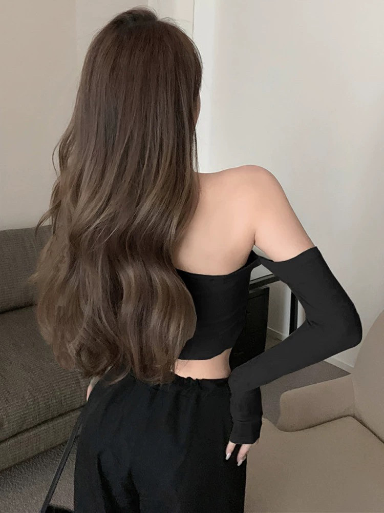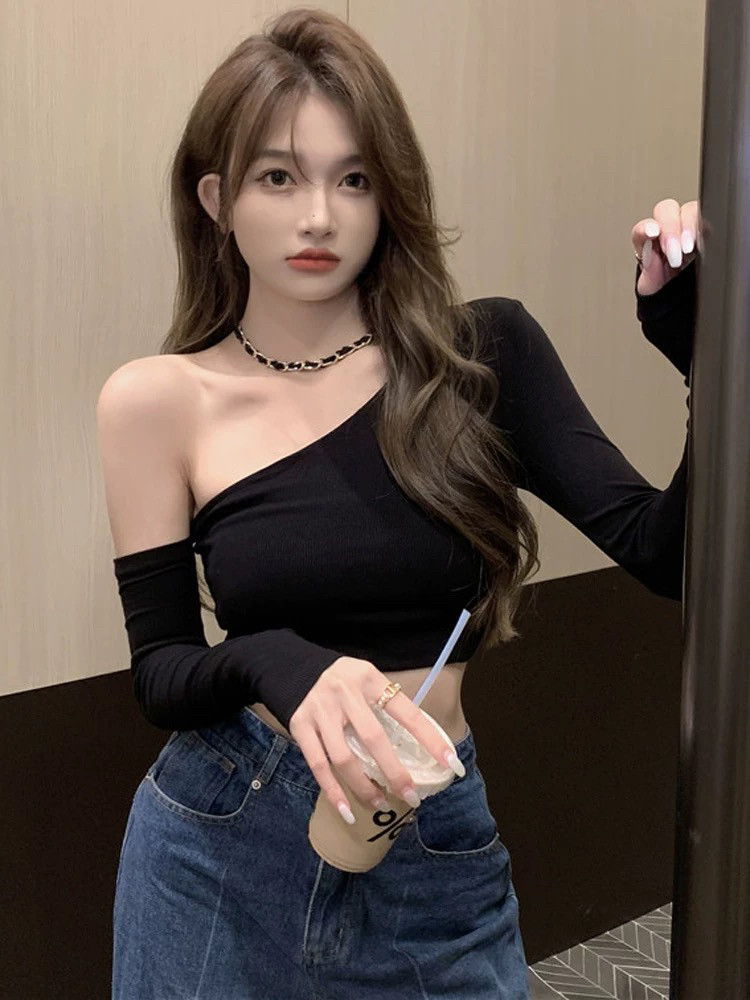 辣妹纯欲风斜肩露肩长袖t恤女春夏设计感小众紧身漏肚脐短款上衣