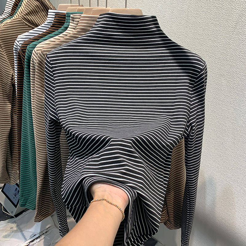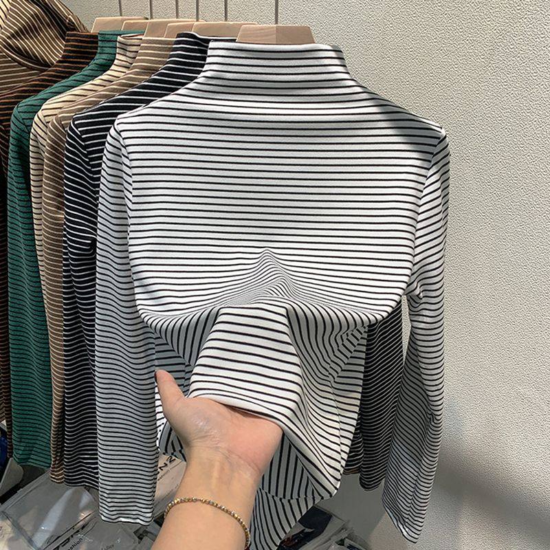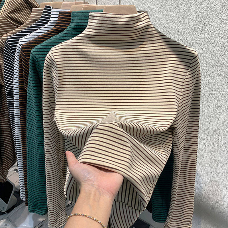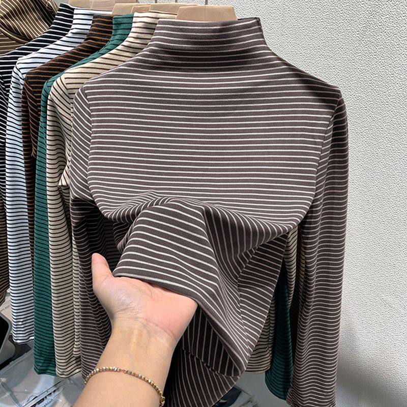 条纹德绒半高领打底衫女秋冬2025新款内搭长袖T恤加厚紧身上衣