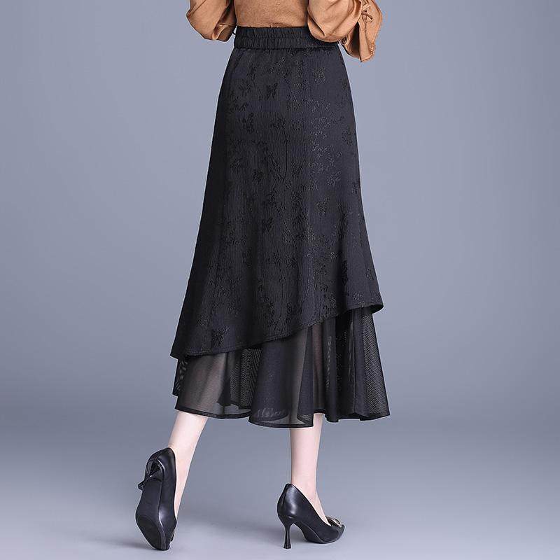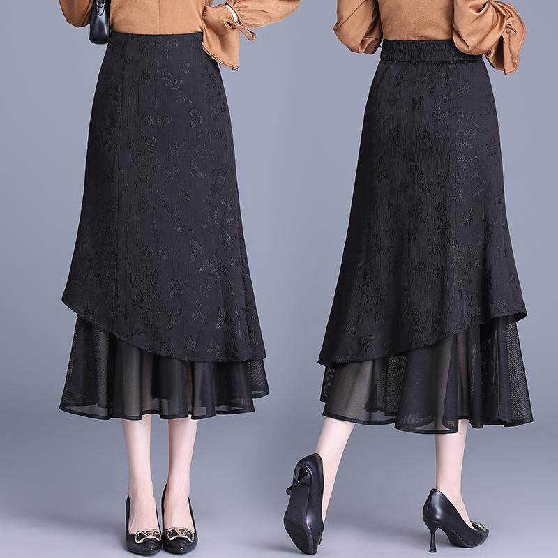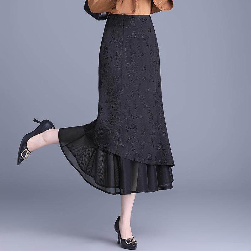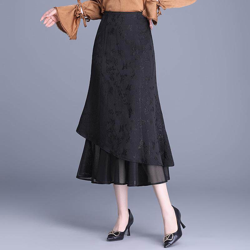提花鱼尾半身裙女2026年春季新款高腰显瘦修身网纱边长款包臀裙子