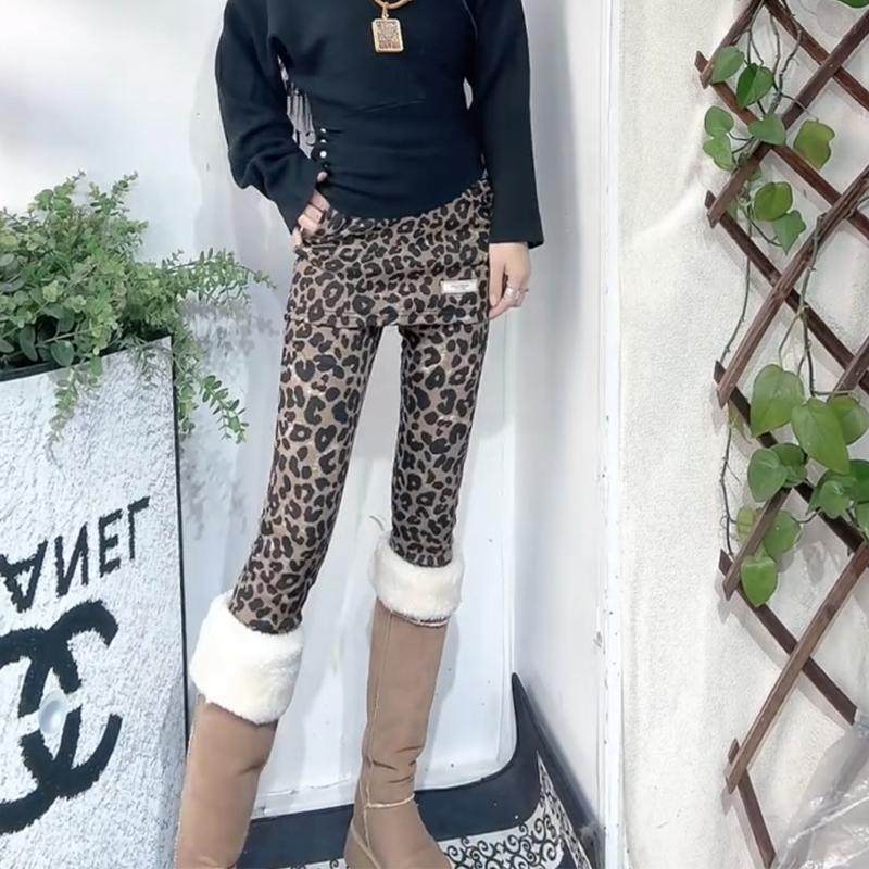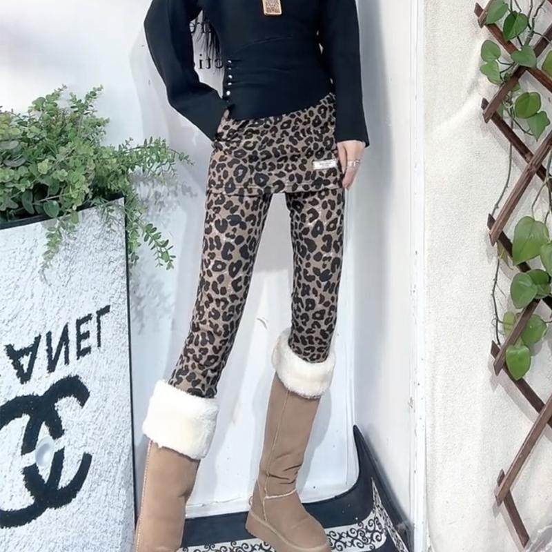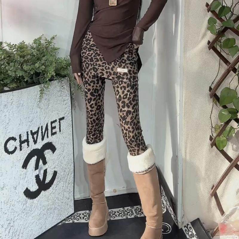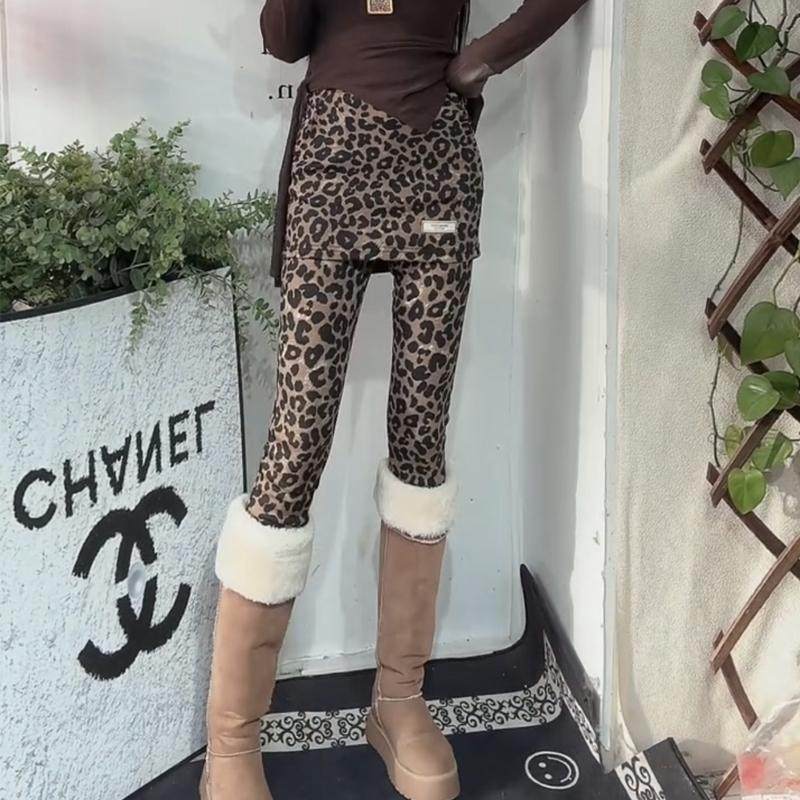 欧货丝绒豹纹围裙裤女秋冬新时尚弹力美式复古假两件九分小脚裤子