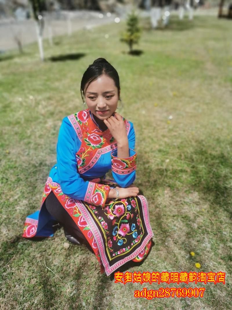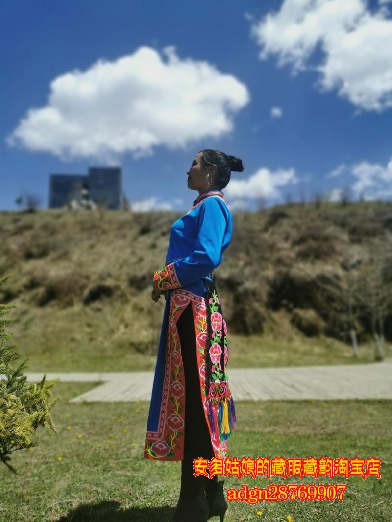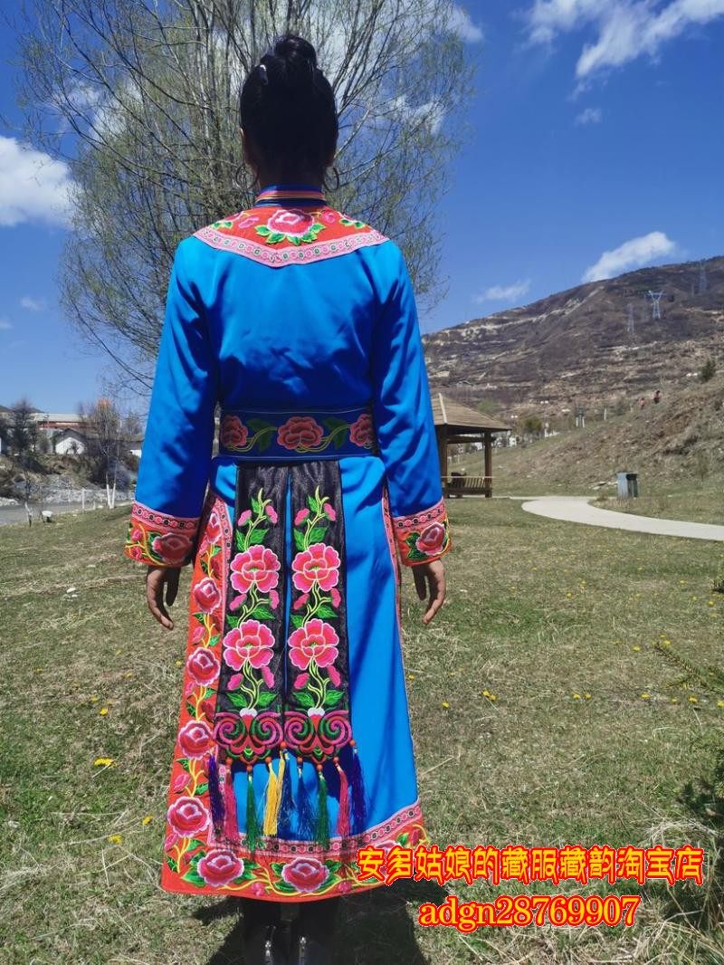 安多姑娘推荐阿坝羌族传统女式服饰云肩长衫围裙羌装蓝色羌服套装