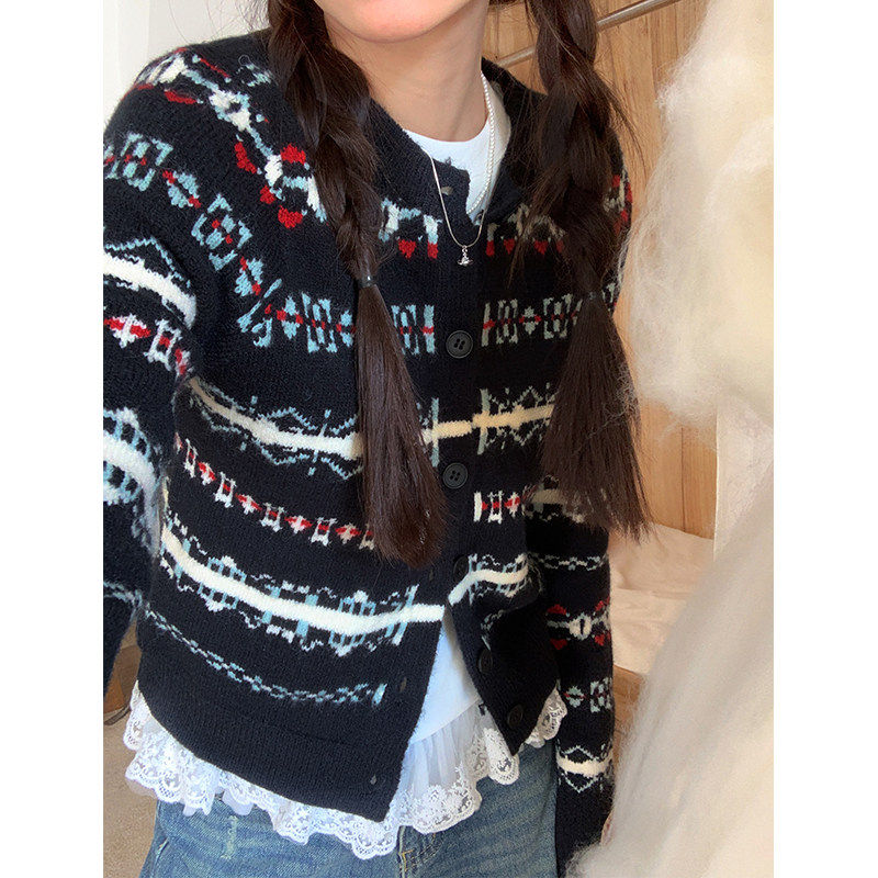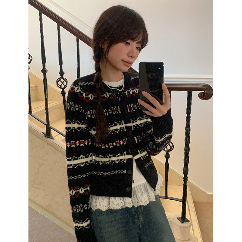 黑色费尔岛穿搭氛围感长袖针织女2025春季新款高级感提花开 衫外