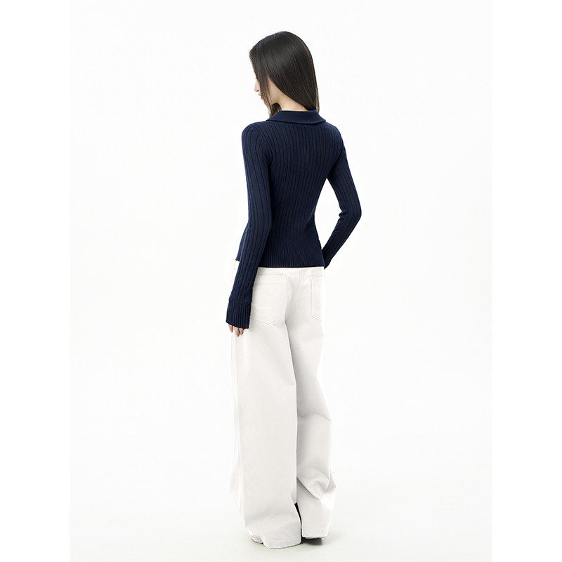 iiiamX藏蓝色正肩polo领针织衫上衣女秋冬季内搭修身翻领打底毛衣