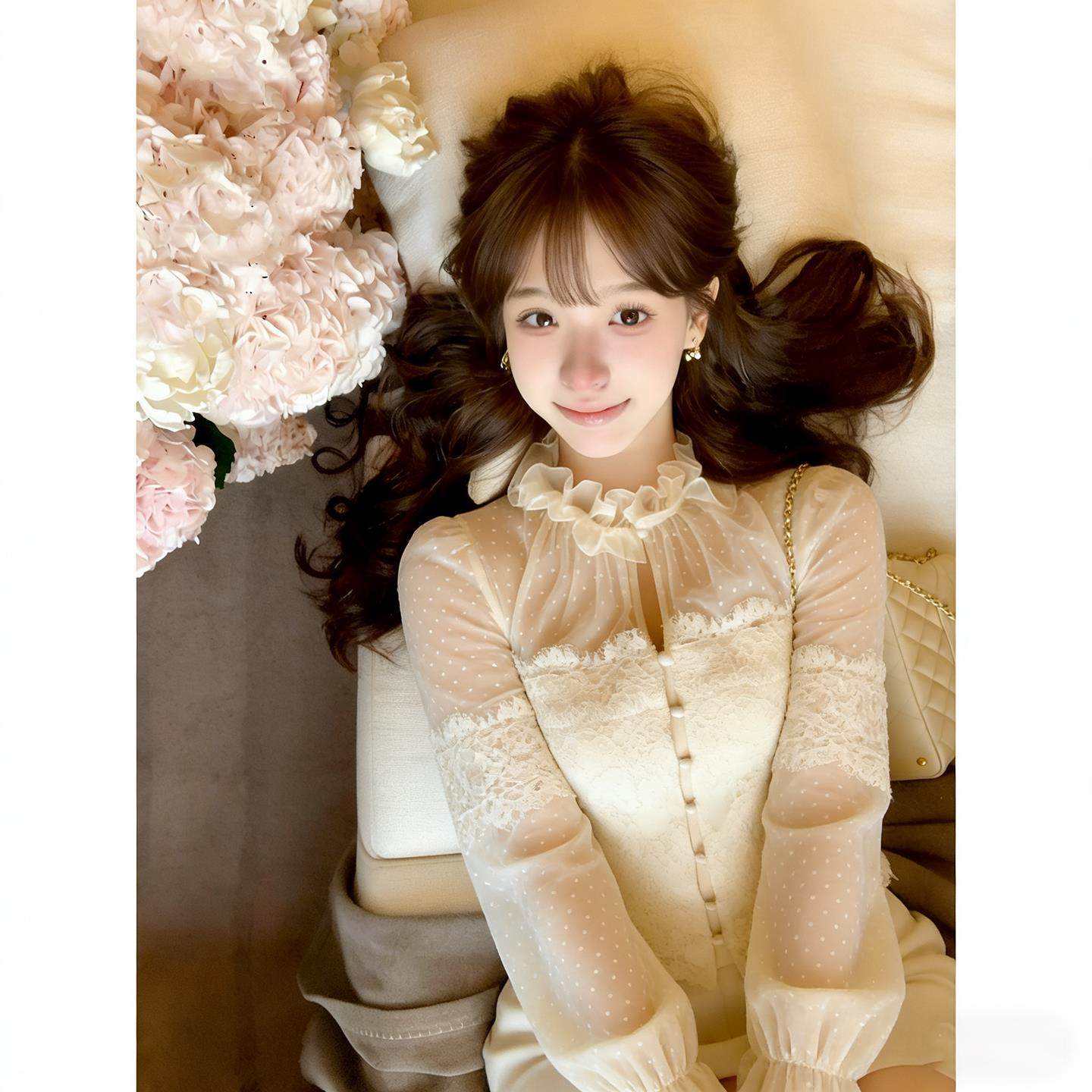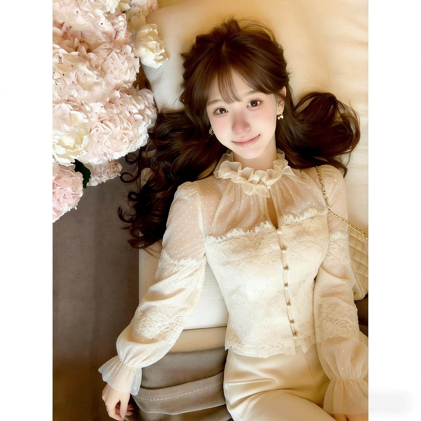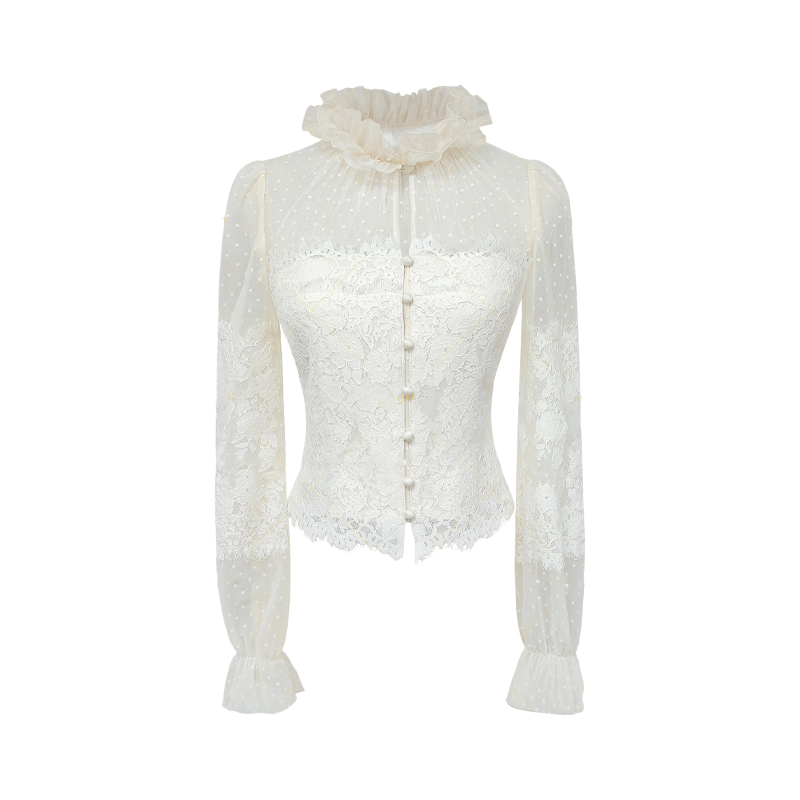 重工复古蕾丝波点上衣女春秋洋气轻奢高级感花边网纱拼接收腰衬衫