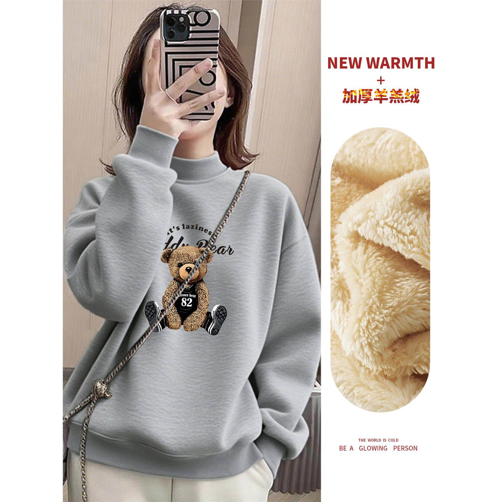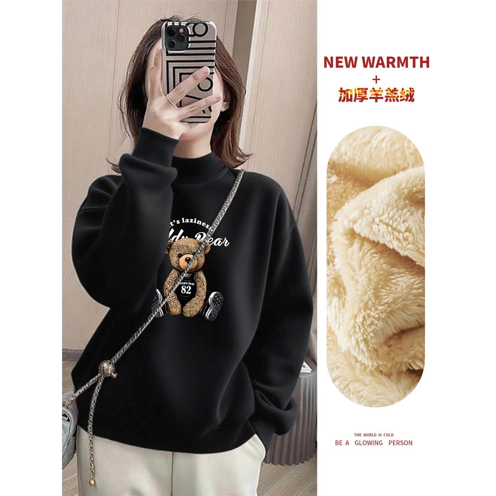 2025冬季新款半高领卫衣女彷羊羔绒加绒加厚时尚宽松小熊印花上衣