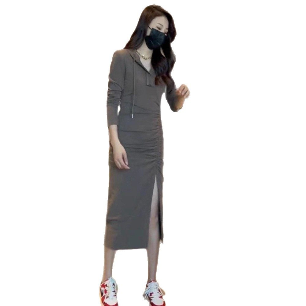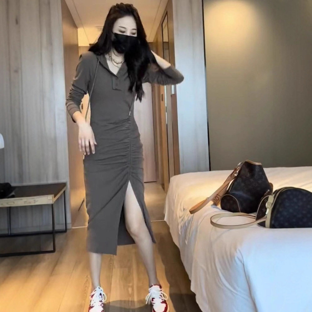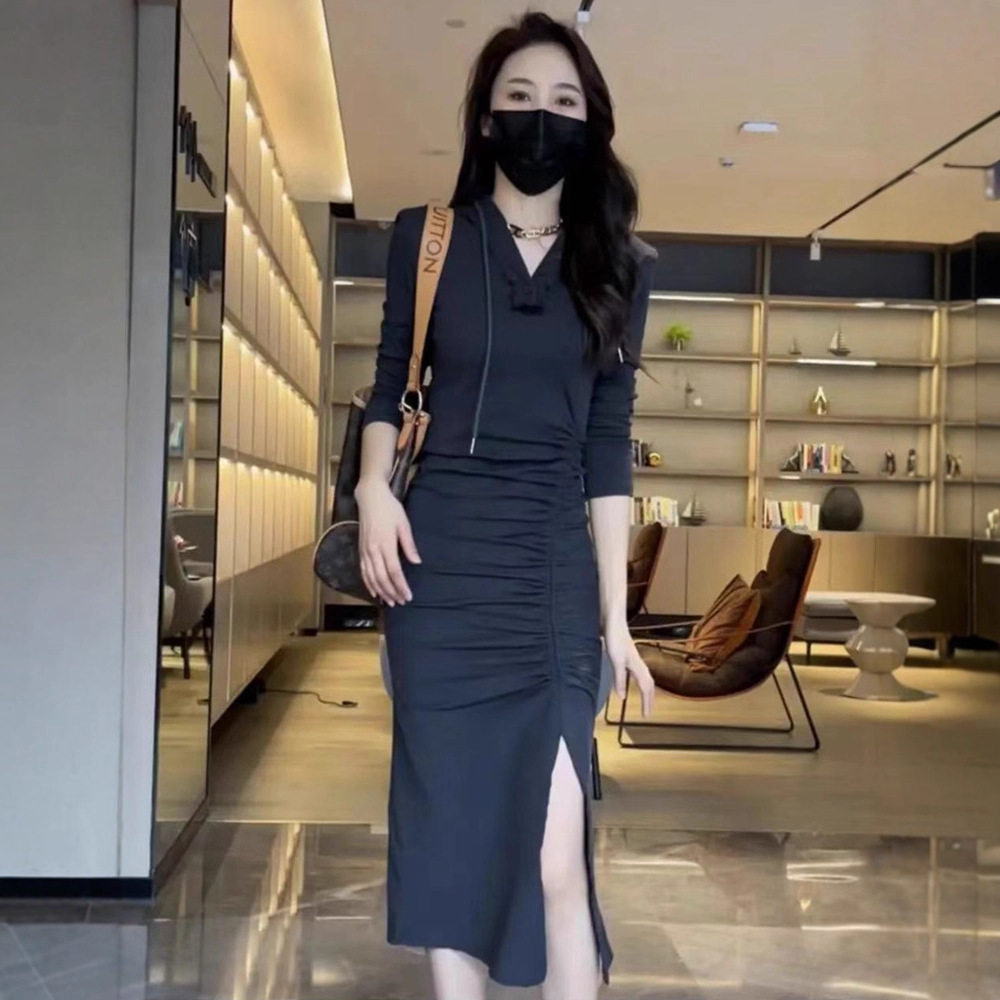 连帽连衣裙女春装中长款气质开叉收腰显瘦纯欲褶皱包臀长裙子