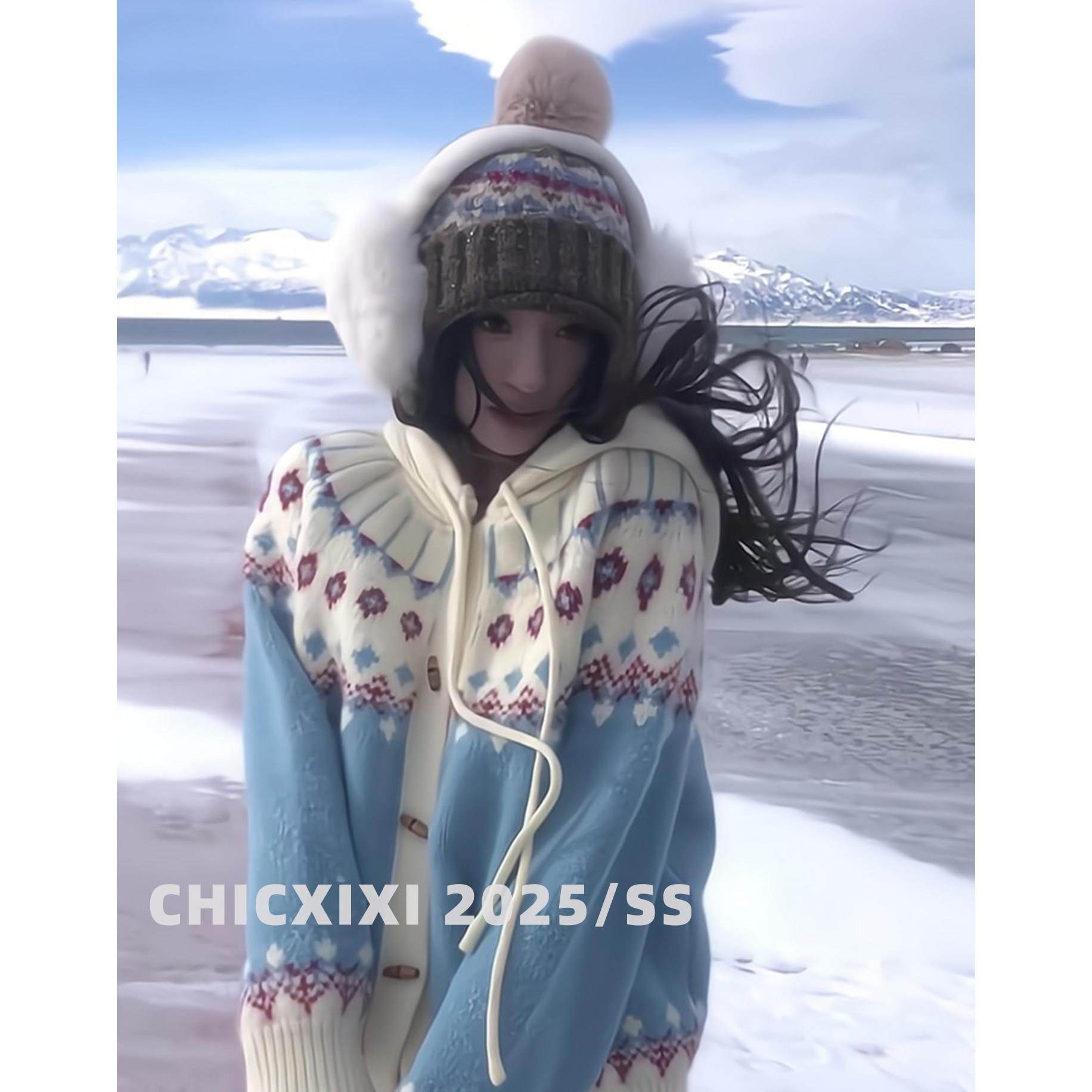氛围感蓝色费尔岛牛角扣毛衣外套女秋冬季慵懒风连帽圣诞针织开衫