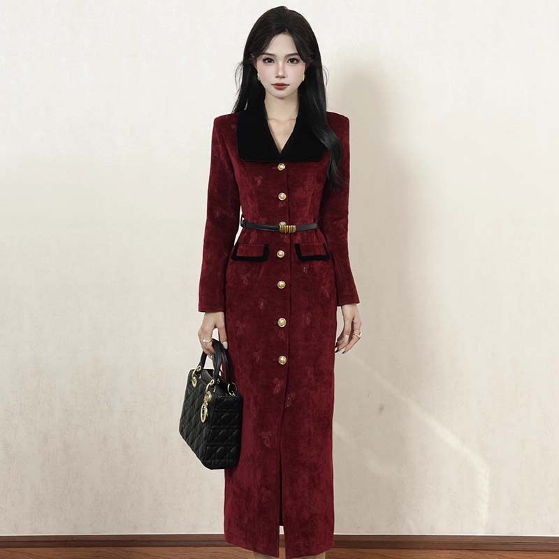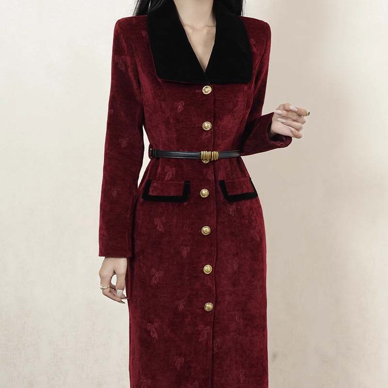 含腰带法式翻领打底裙子2025秋冬季新款拼色气质连衣裙QY0170