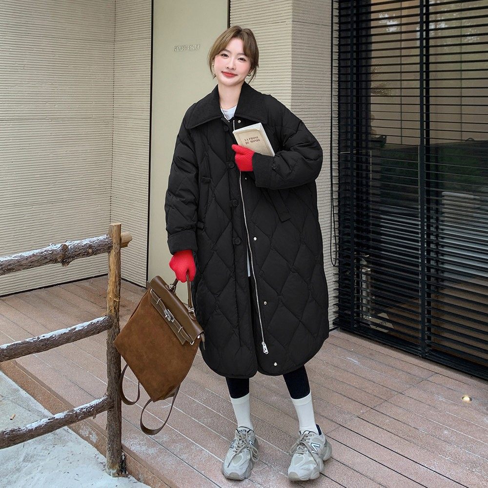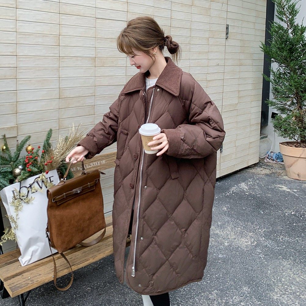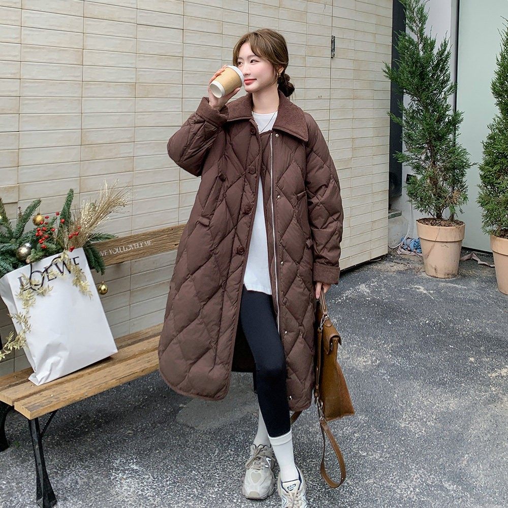 咖色翻领菱格羽绒棉服女冬季中长款2025新款过膝加厚保暖时尚棉衣