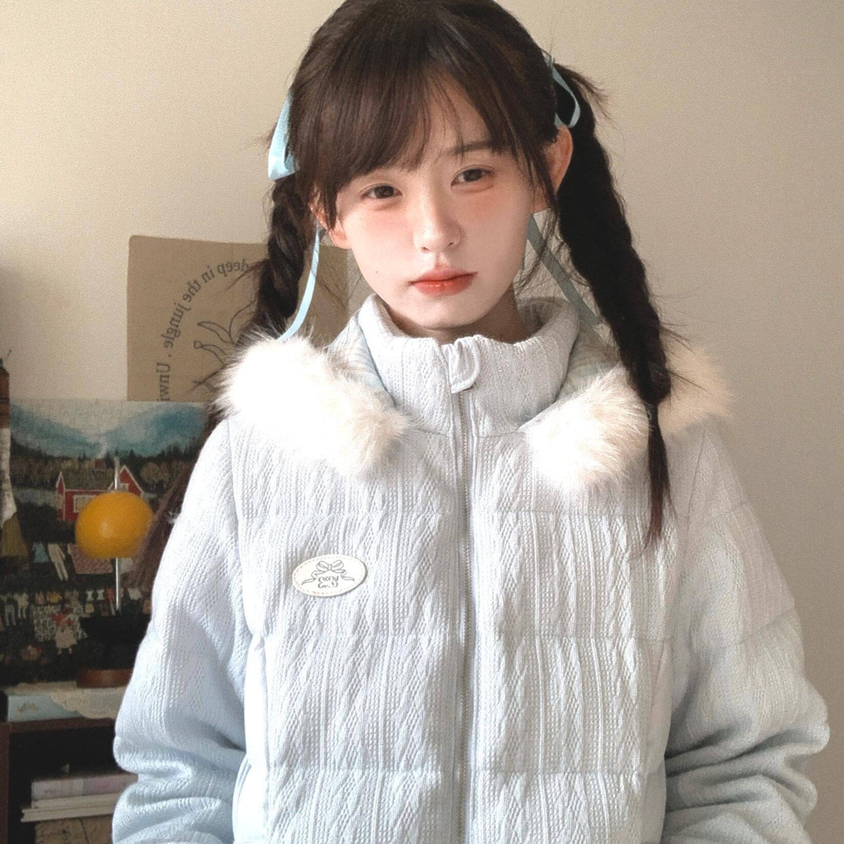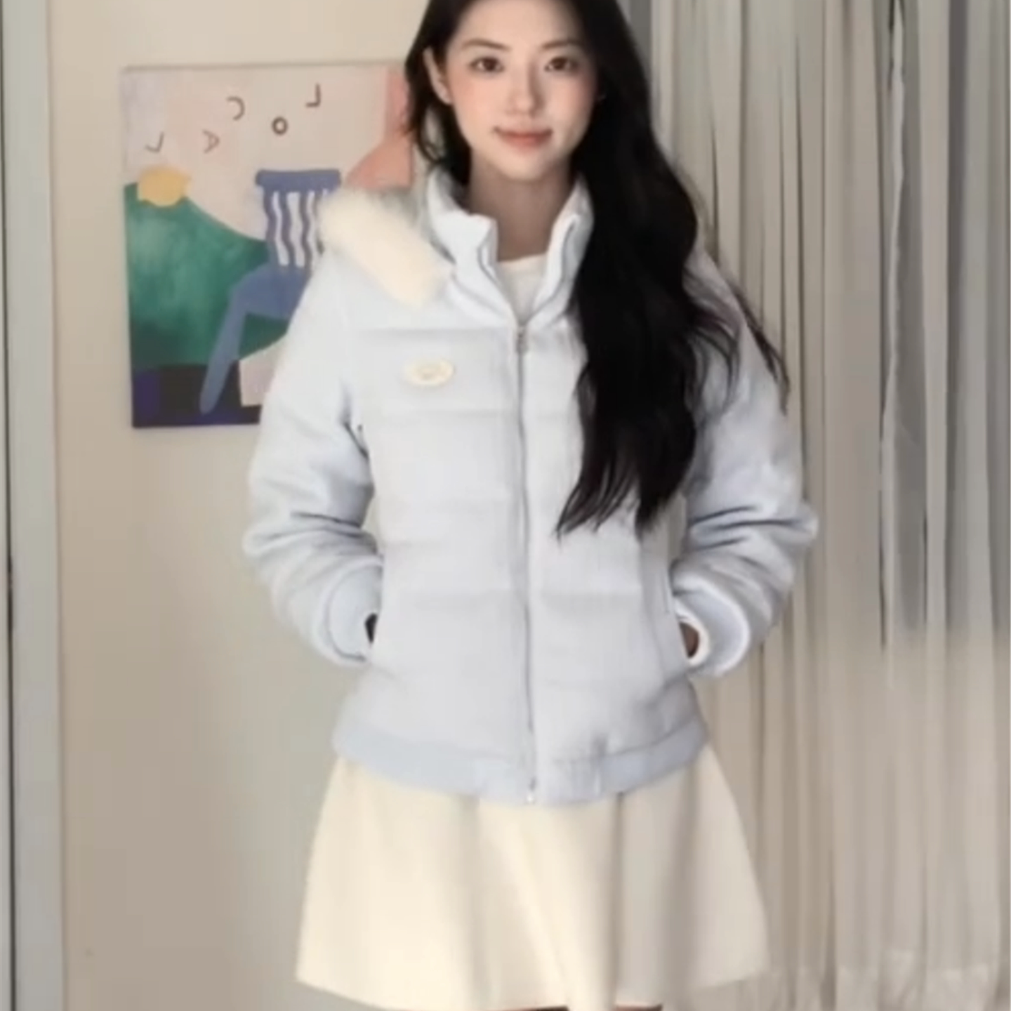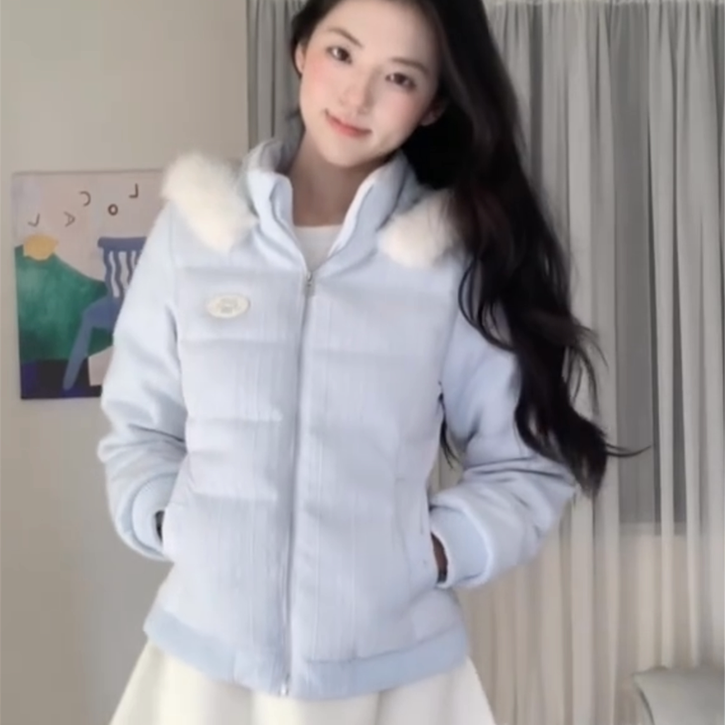 韩系温柔百搭毛织拼接收腰棉服女款冬季加绒加厚短款毛领棉衣外套