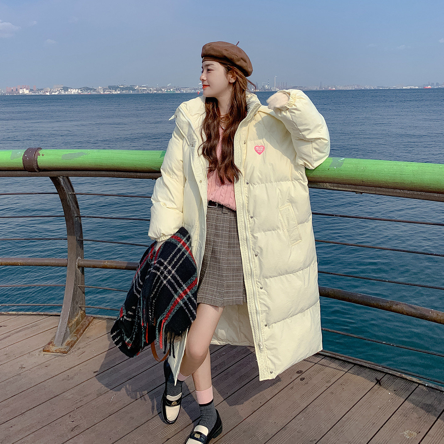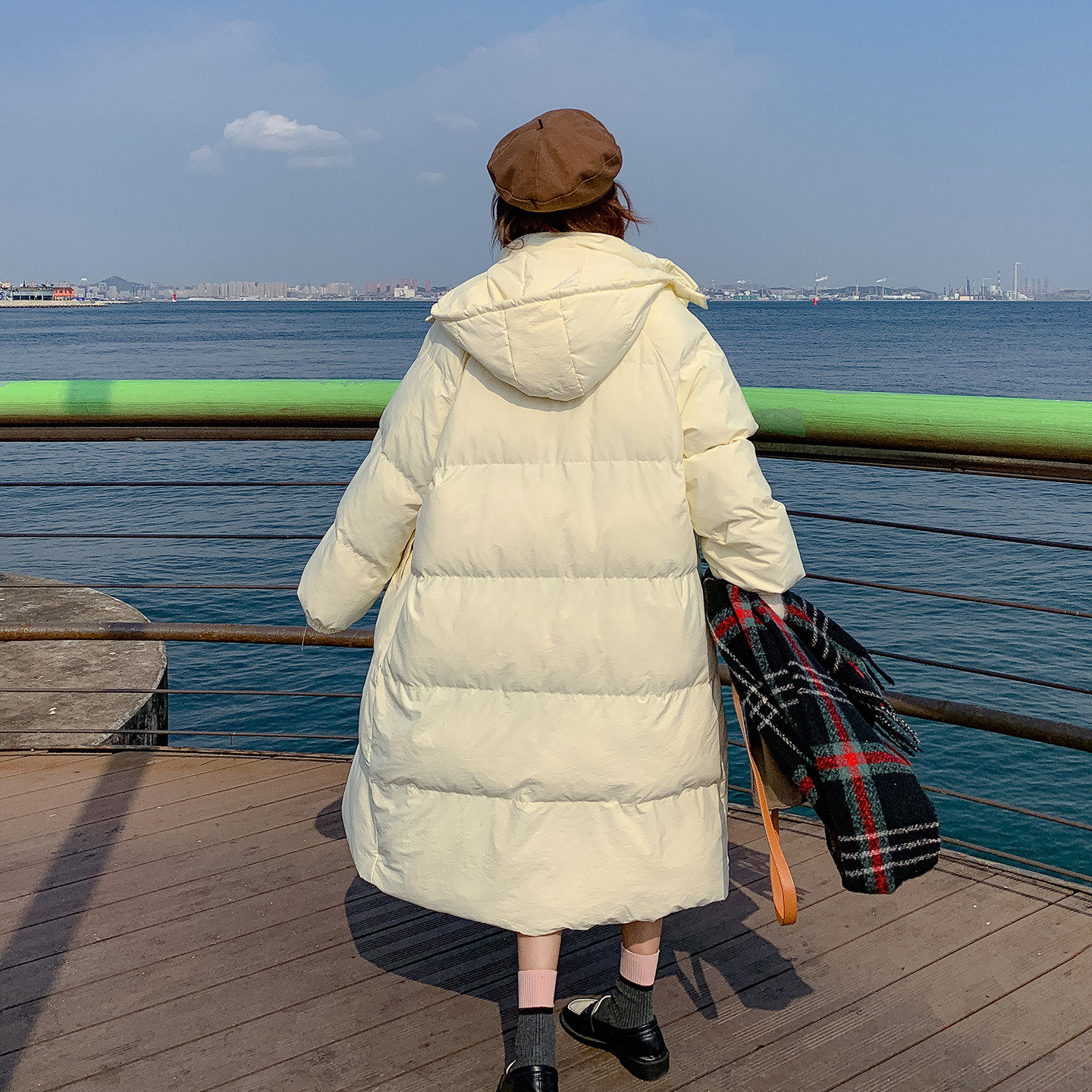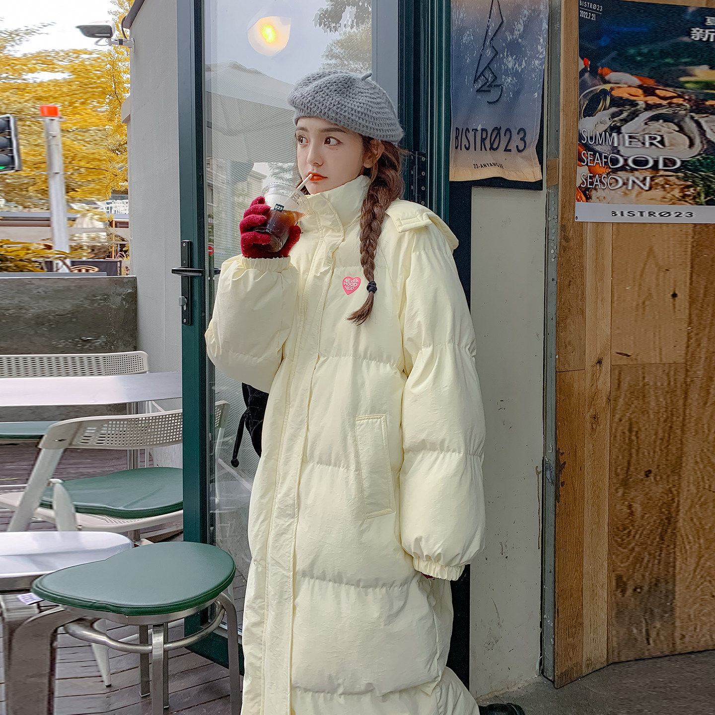 奶黄色学院风长款连帽羽绒服女2025冬季新款减龄保暖90白鸭绒外套
