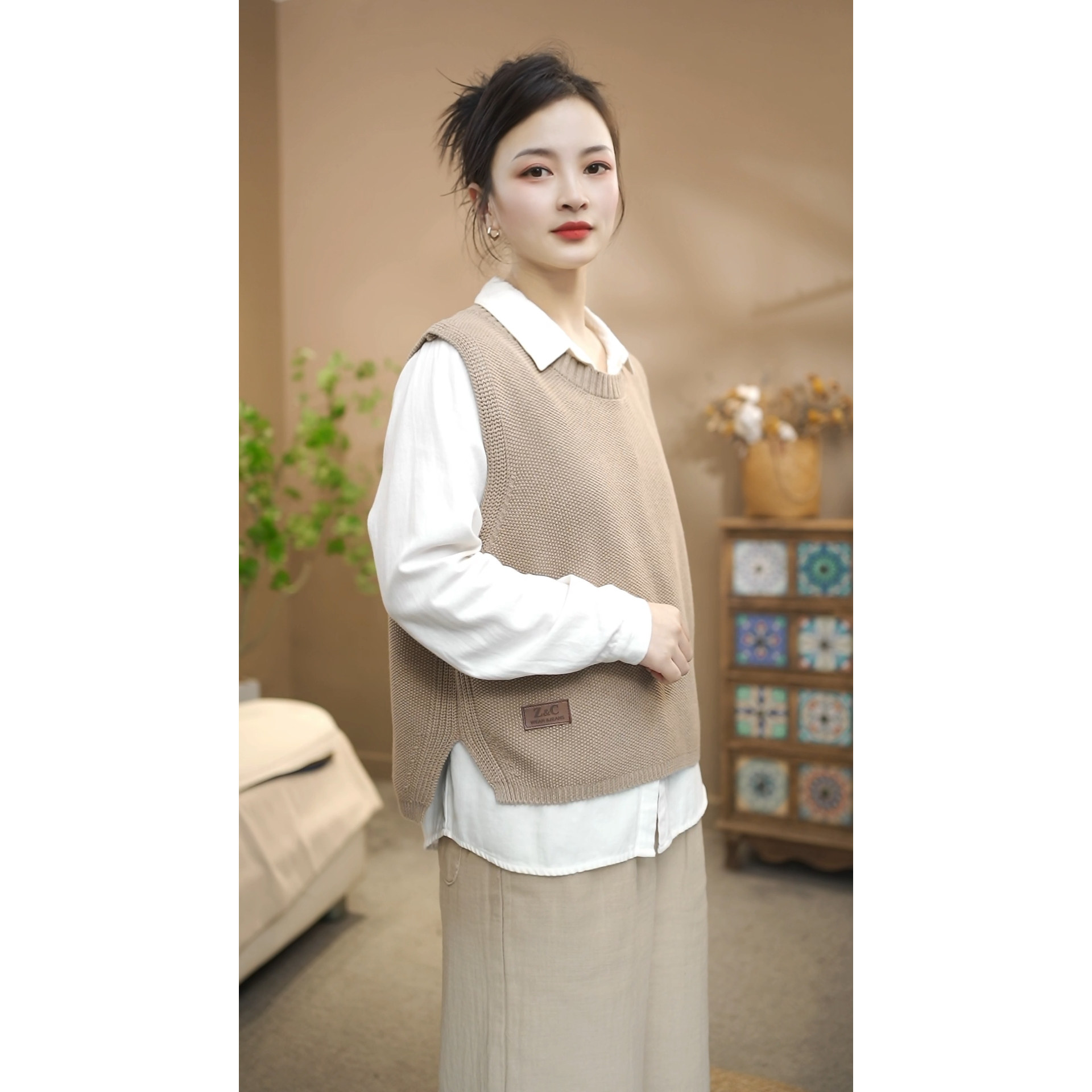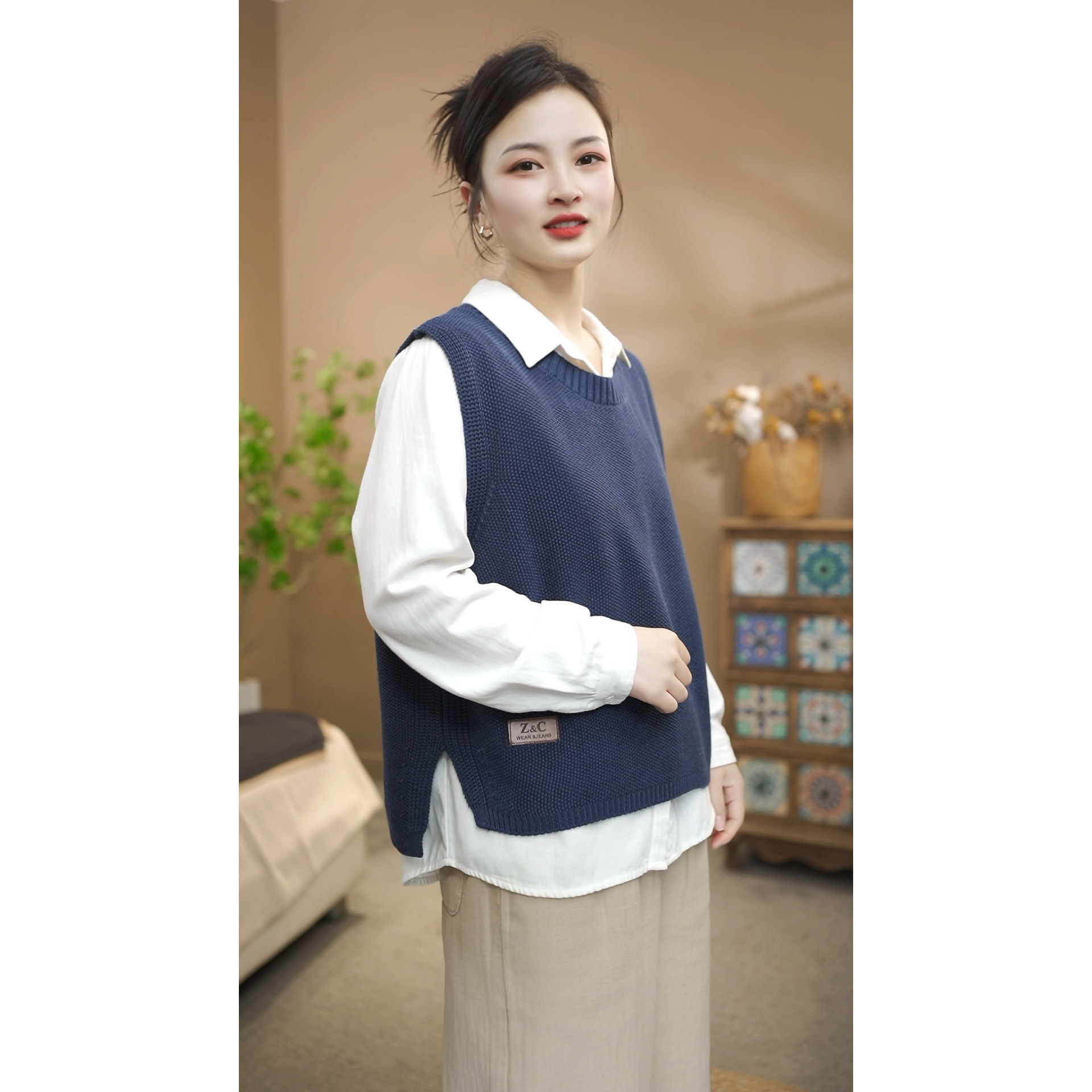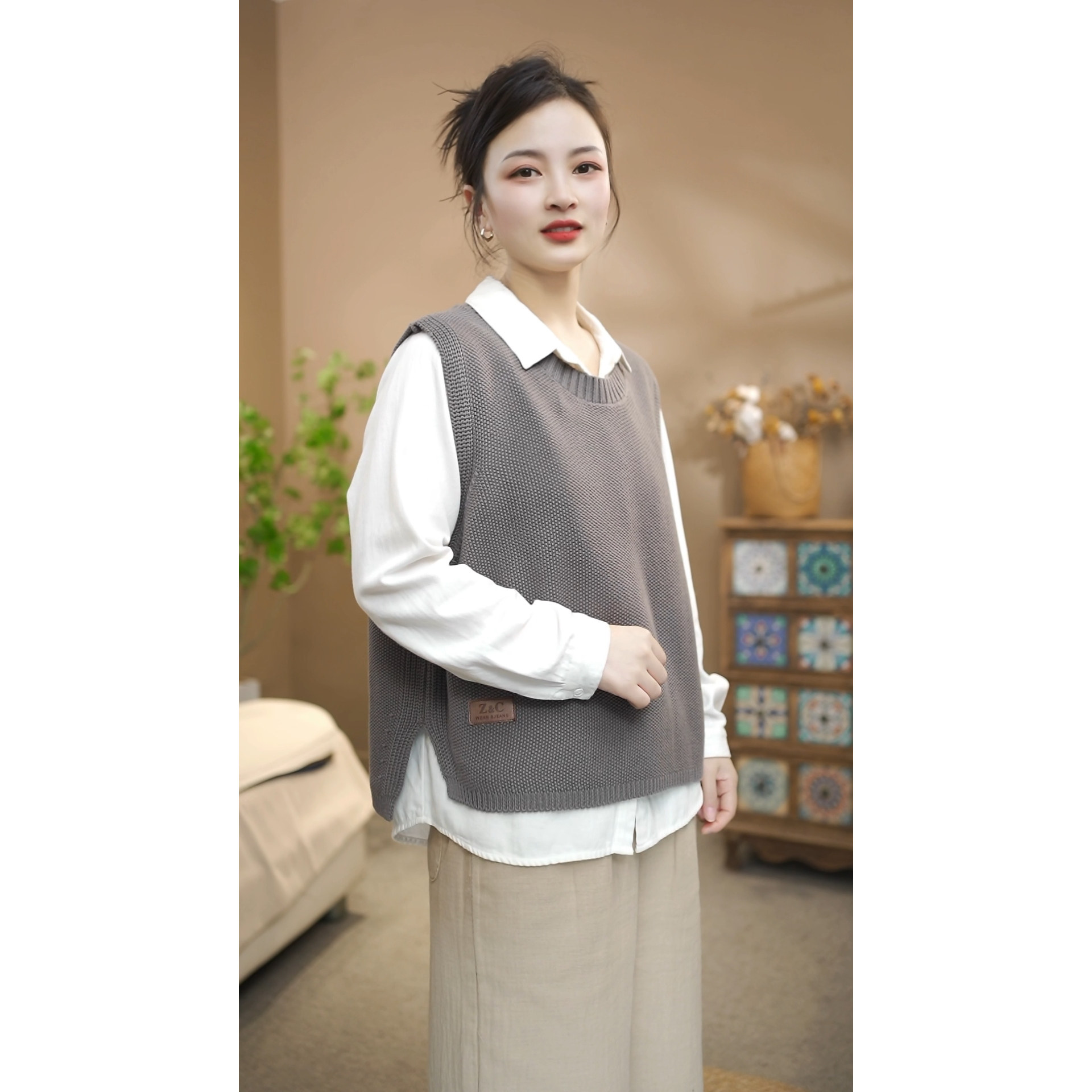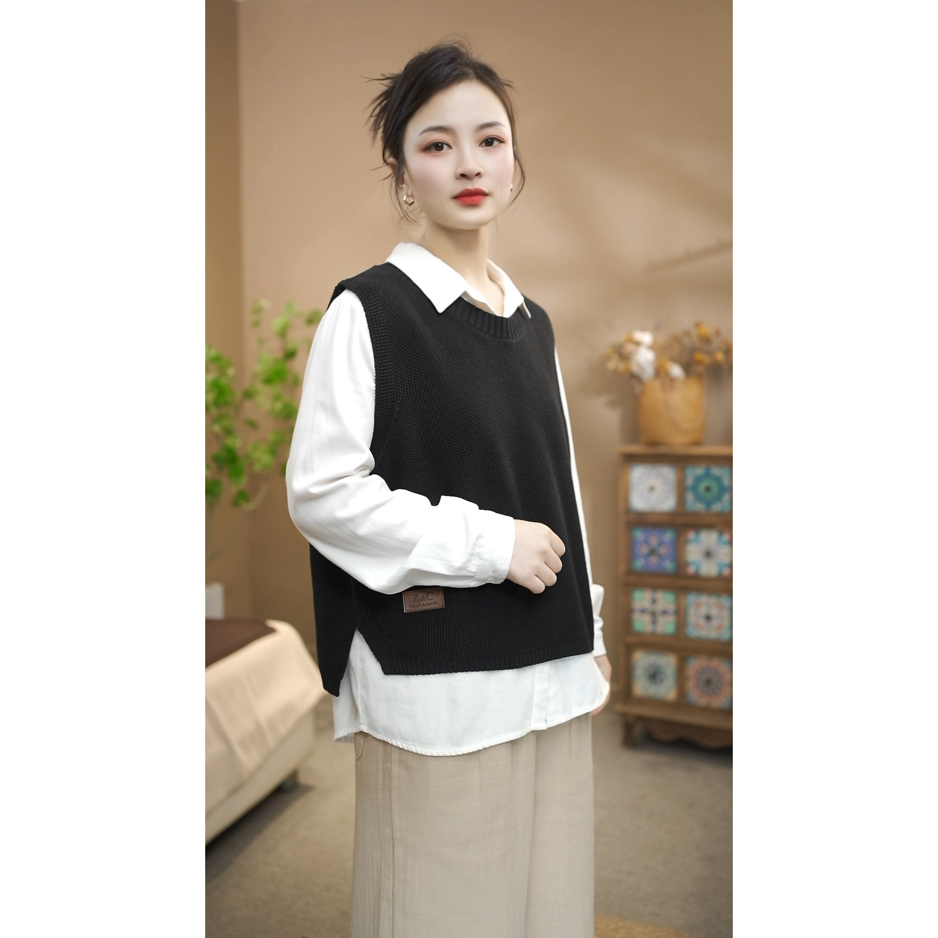 春款侧面开叉棉线针织圆领套头贴标马甲女休闲百搭叠穿上衣26616