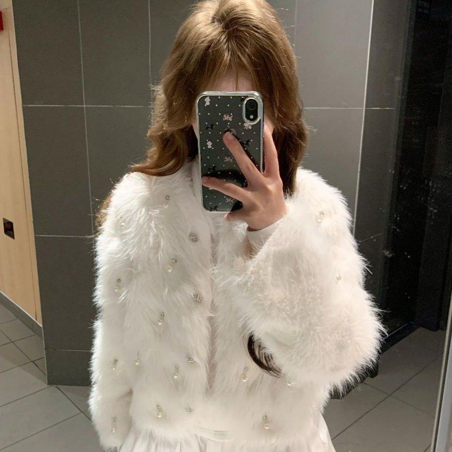 奶fufu白色小香风仿水貂绒毛衣开衫外套女秋冬季加厚毛毛环保皮草