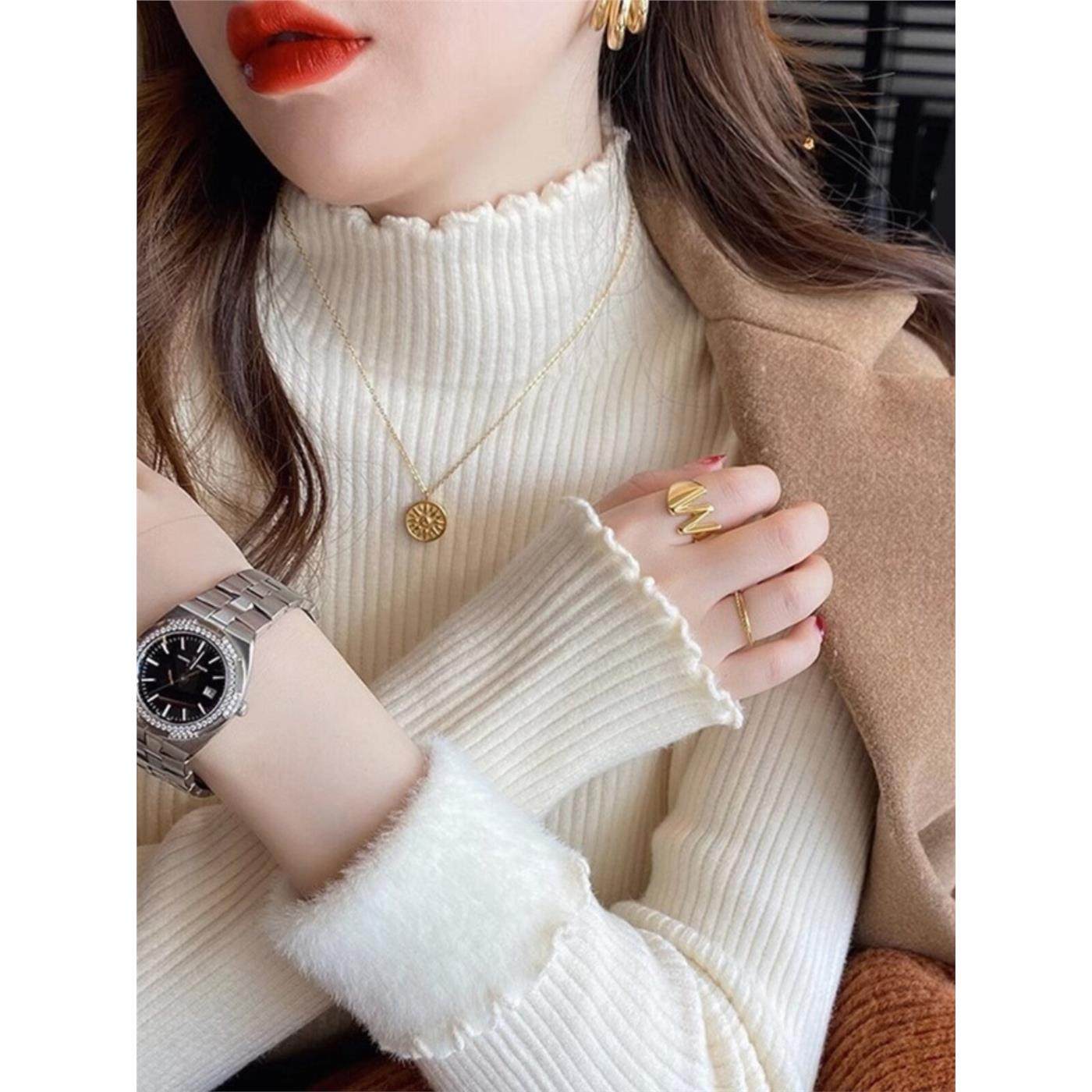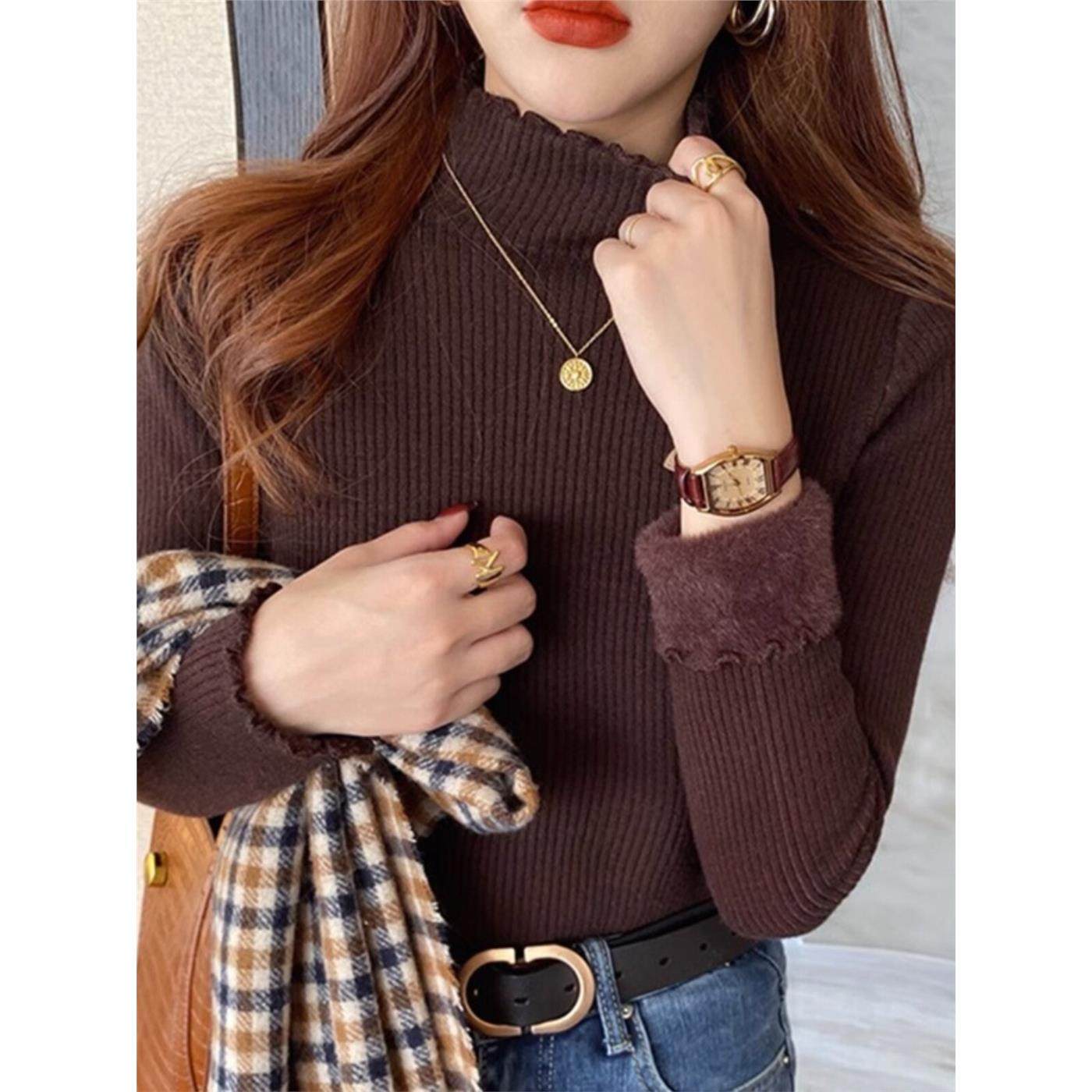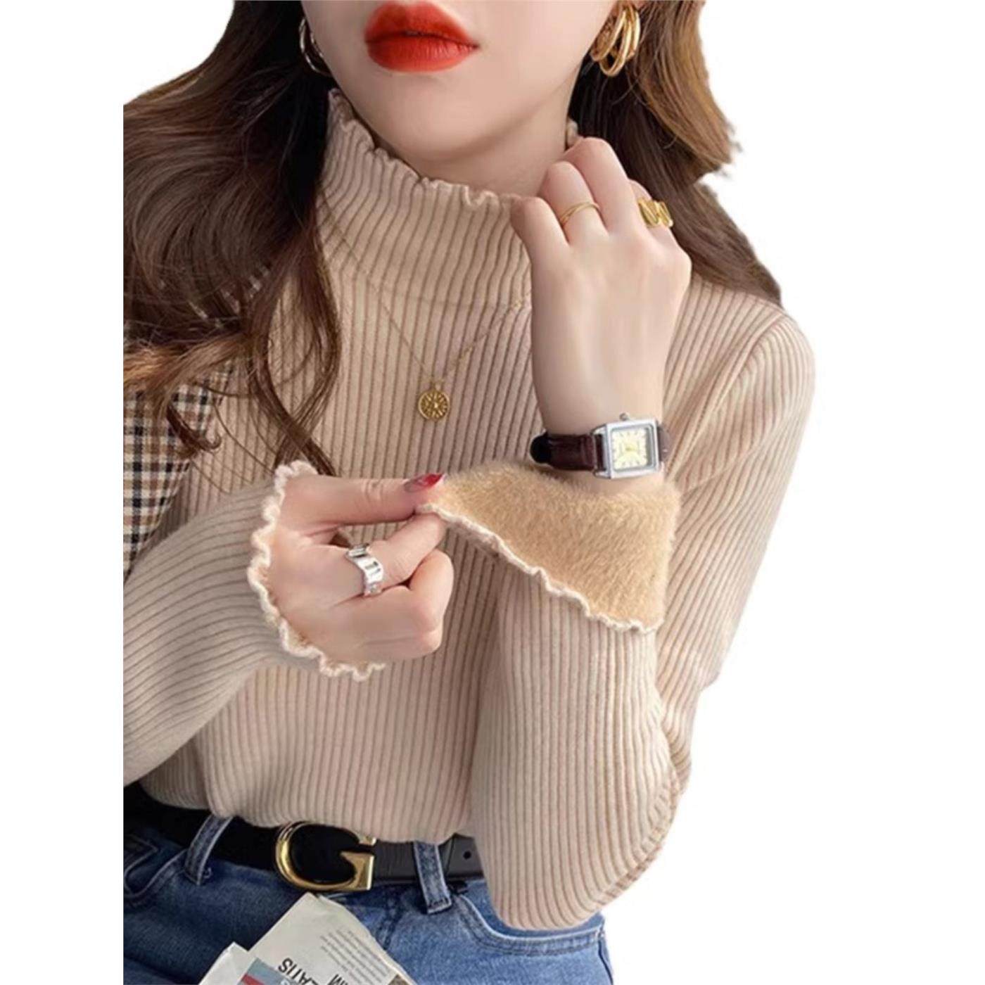 半高领一体绒打底衫女内搭秋冬新款加绒加厚毛衣洋气木耳边针织衫