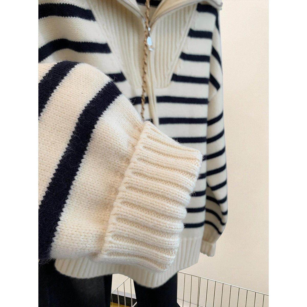 法国Rixo Rane ?浣熊绒条纹半拉链针织毛衣女秋冬季翻领加厚上衣