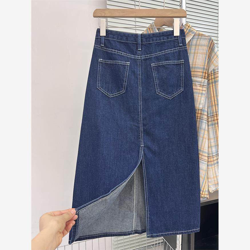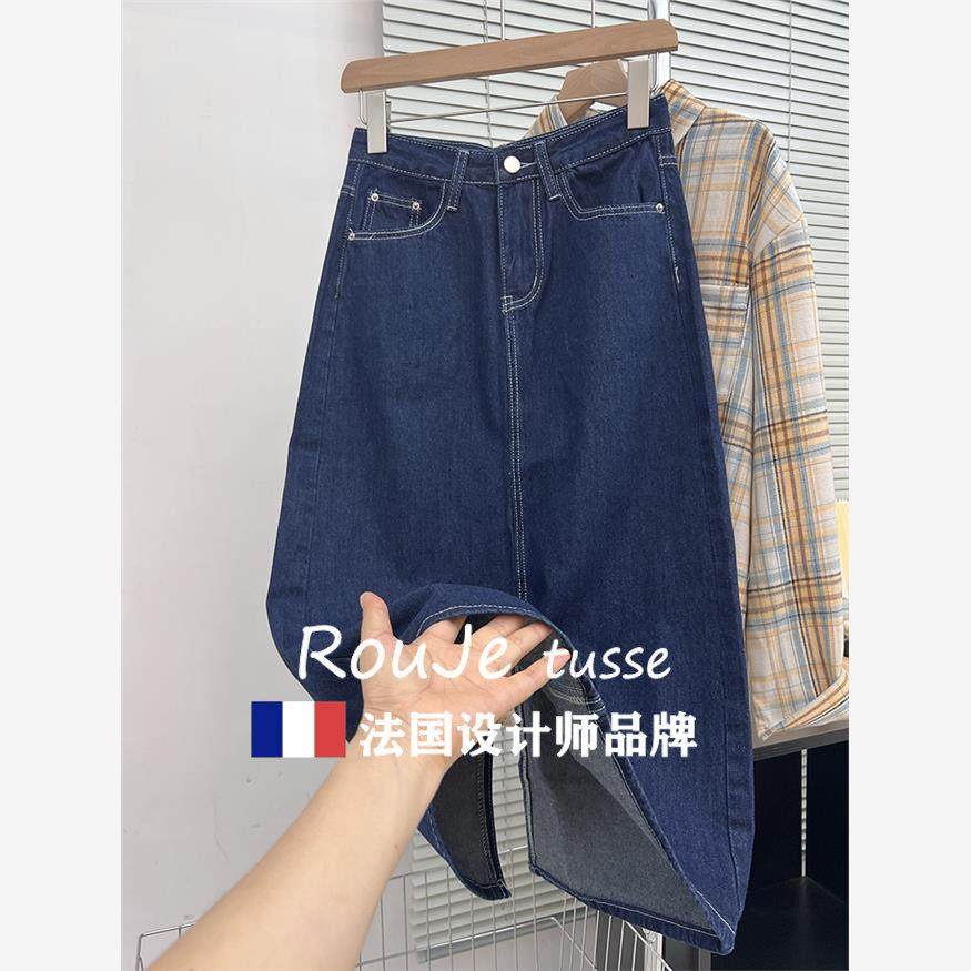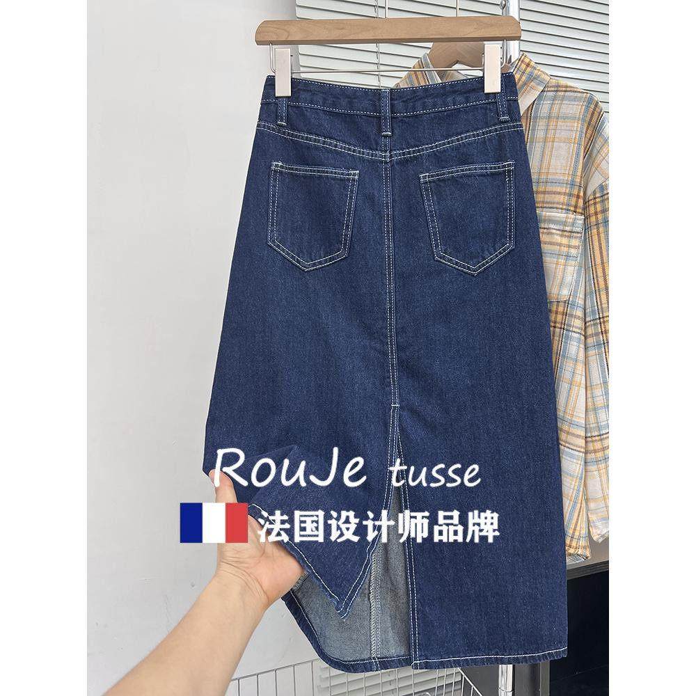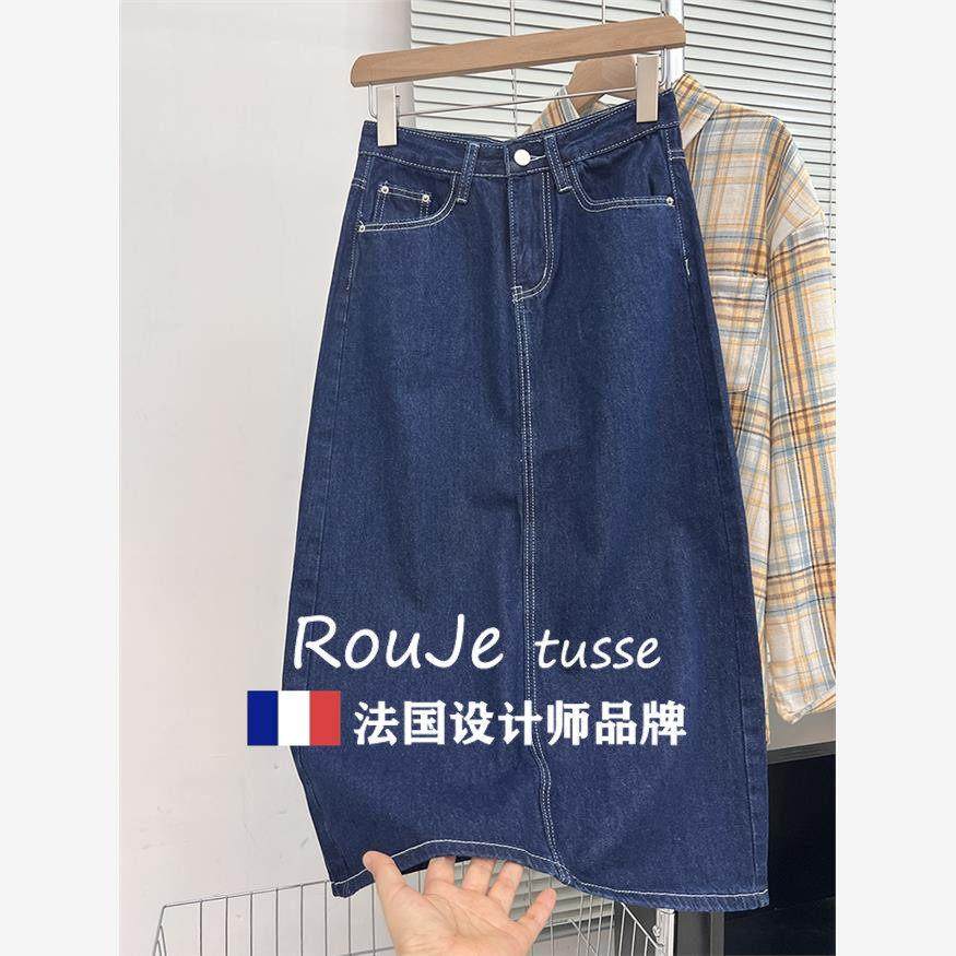 Rouje tusse深蓝色开 叉牛仔半身裙女夏大尺码高腰显瘦中长a字包