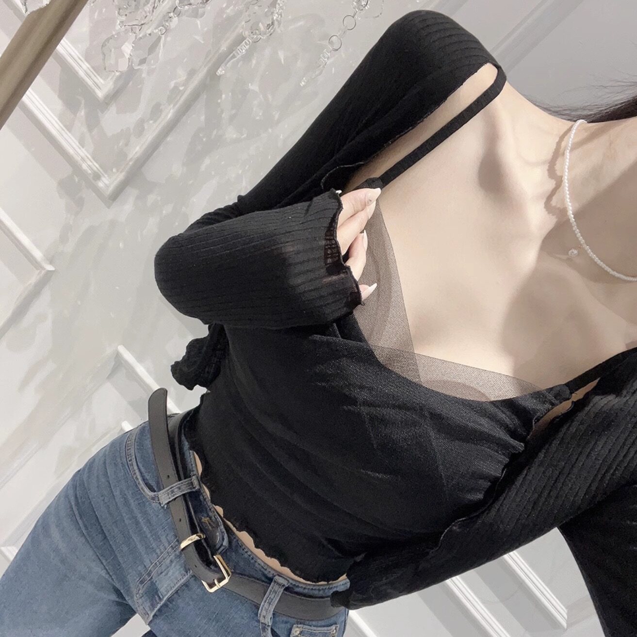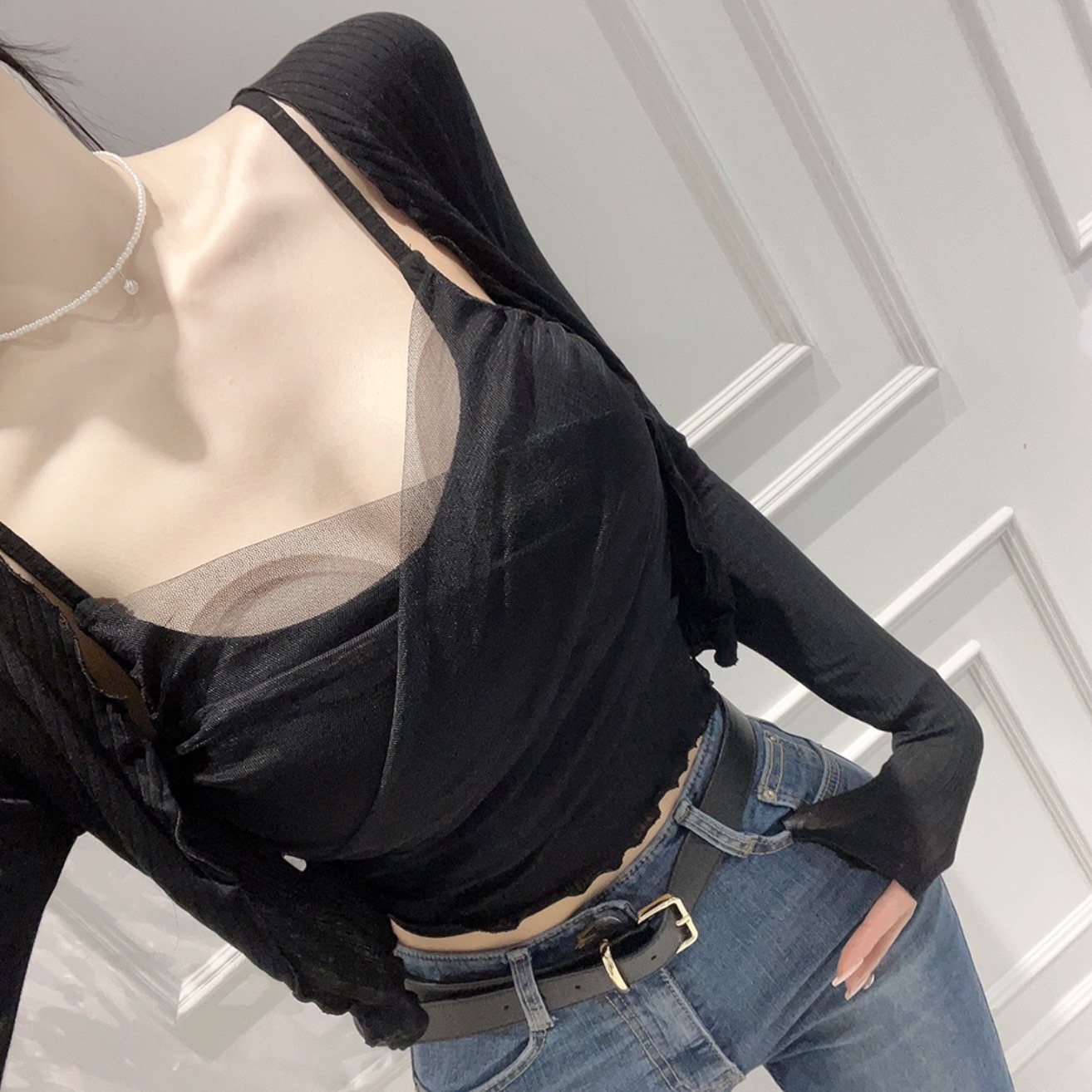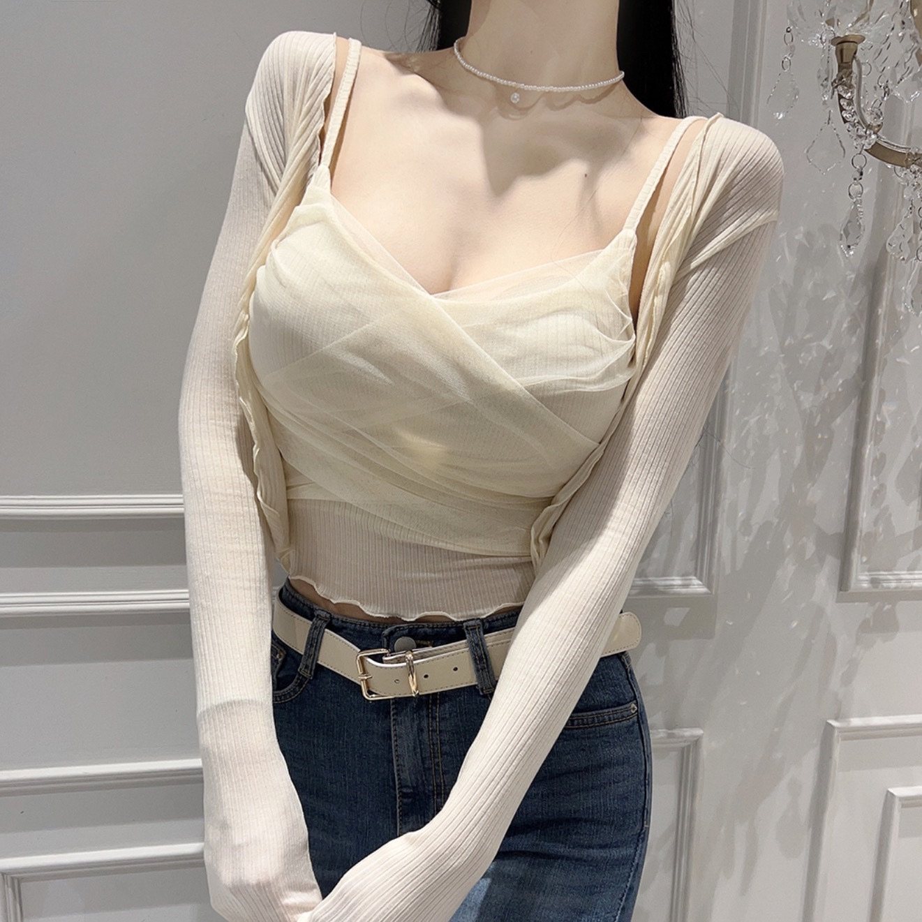 韩国东大门新款性感蕾丝网纱吊带背心女短款长袖小开衫两件套装潮