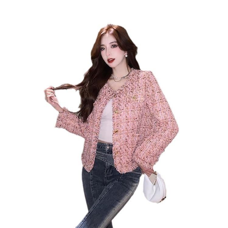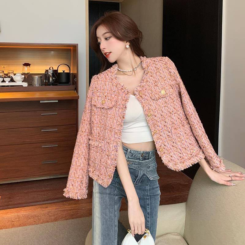 法式粉色粗花呢外套女秋冬季2024新款名媛小香风洋气炸街短款上衣