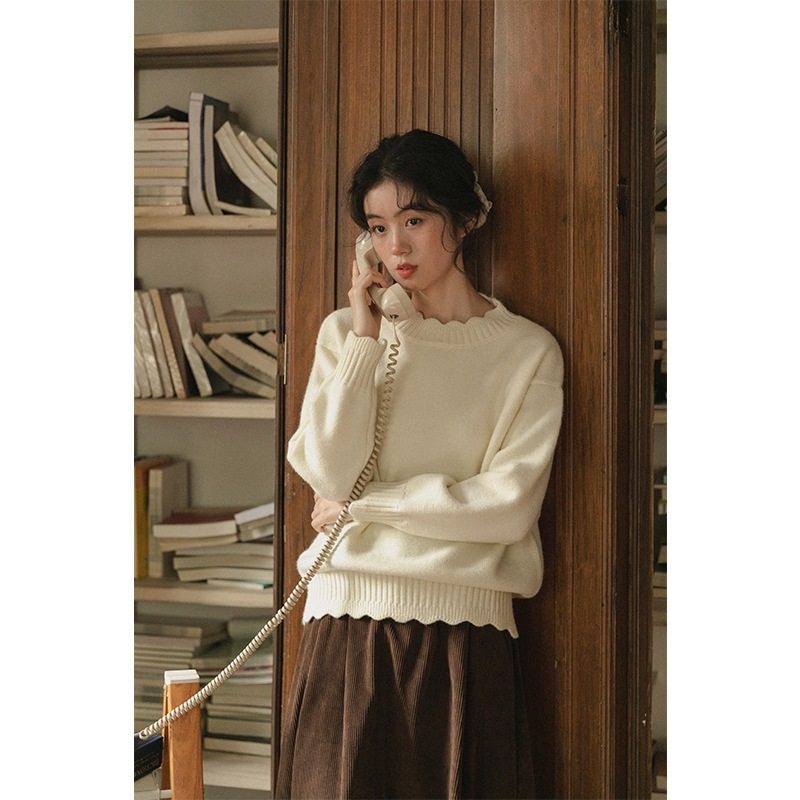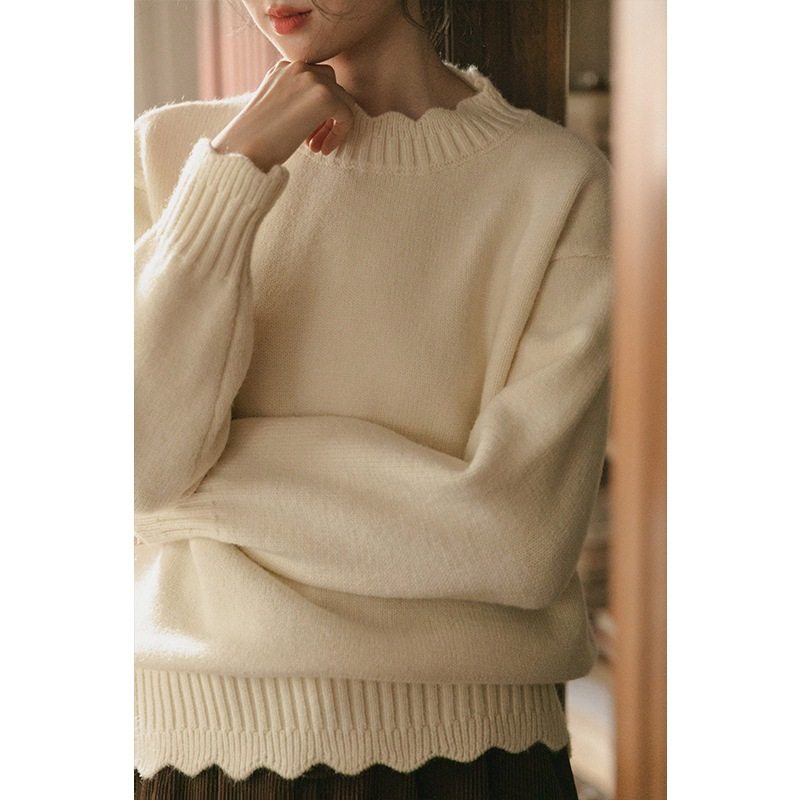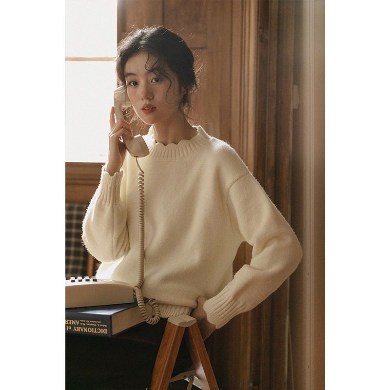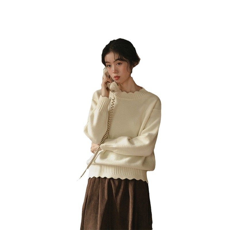 2024新款米白色花边针织毛衣女秋冬季复古套头慵懒风软糯内搭上衣
