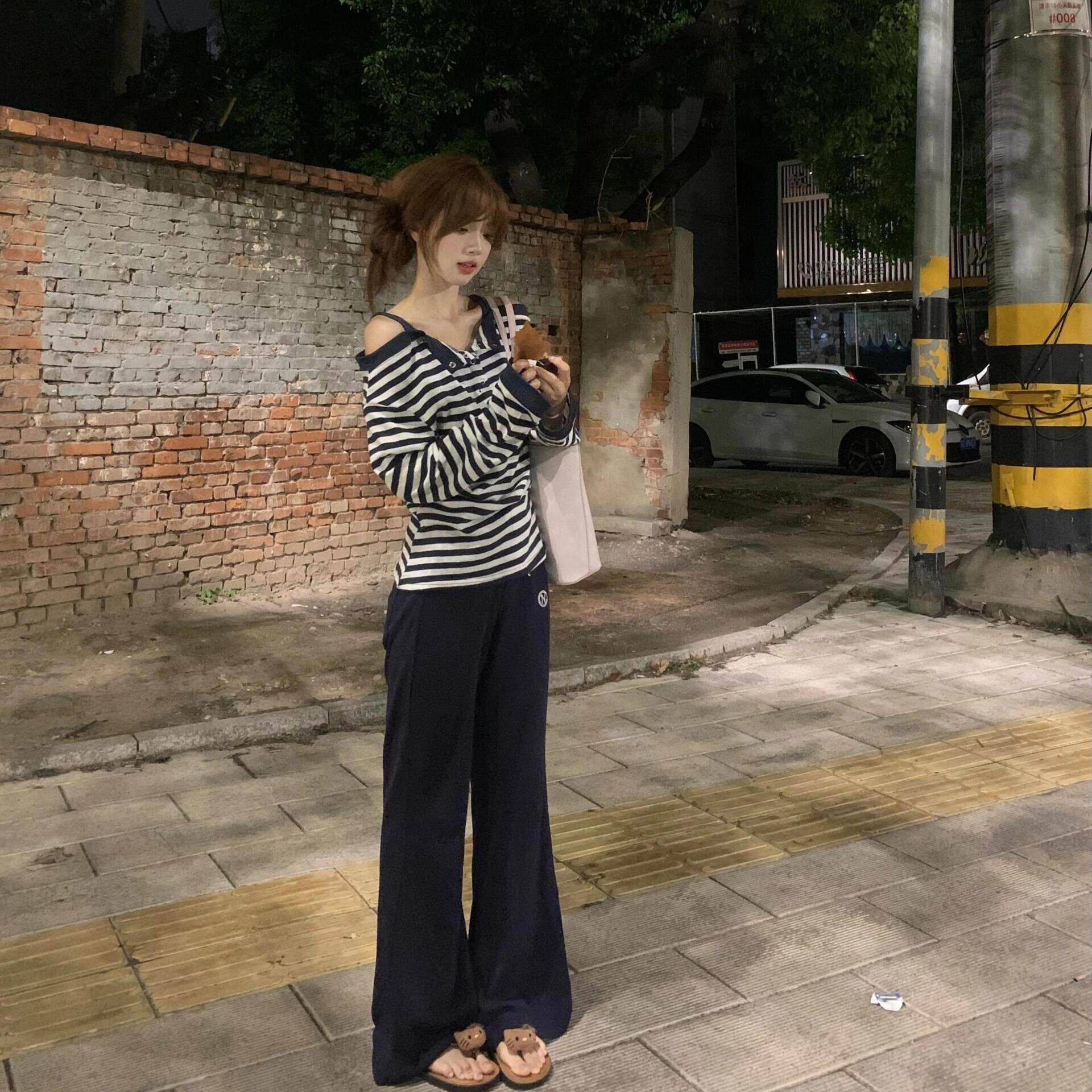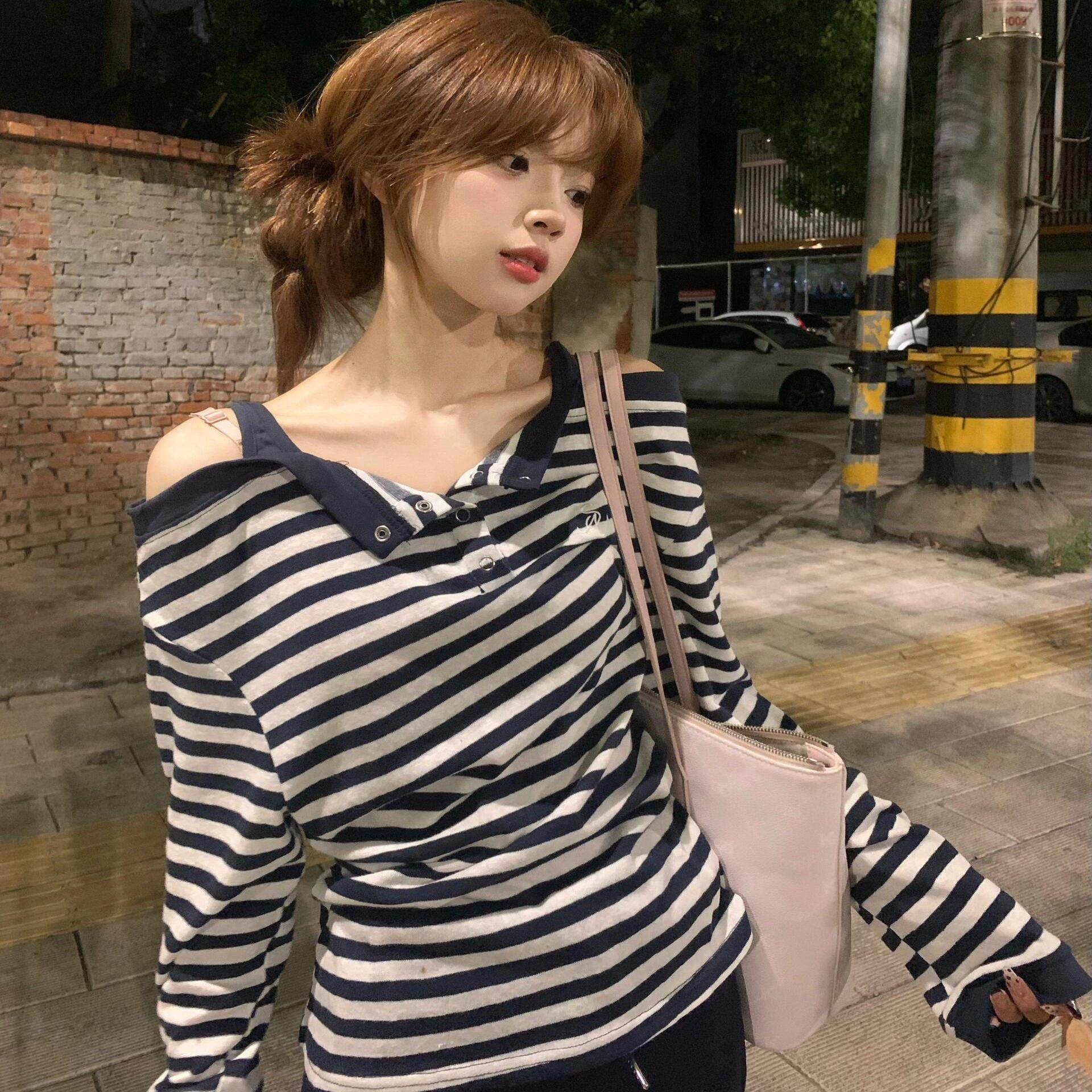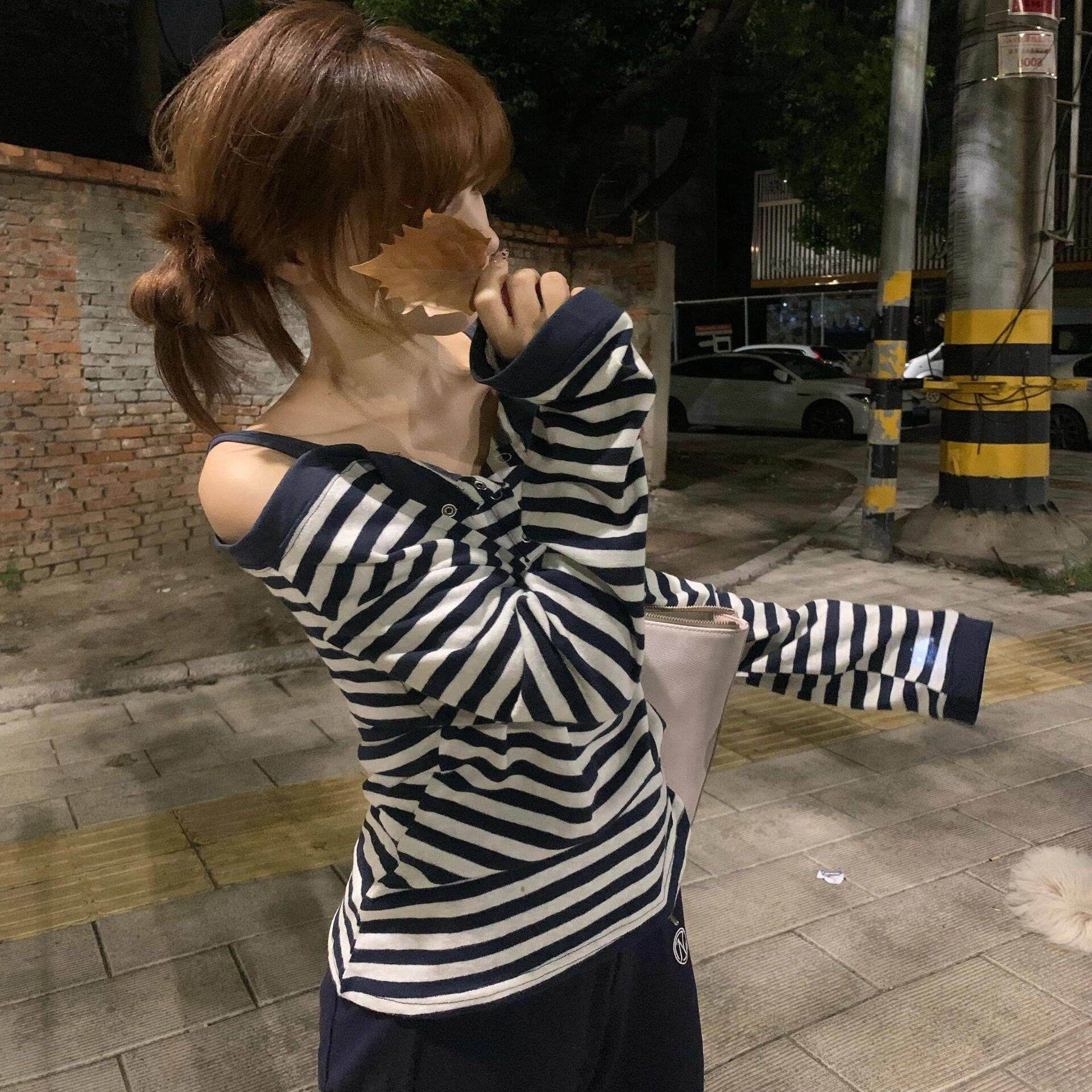 ROUJE SUNG藏青色露锁骨长袖T恤女秋季韩版辣妹假两件条纹上衣潮