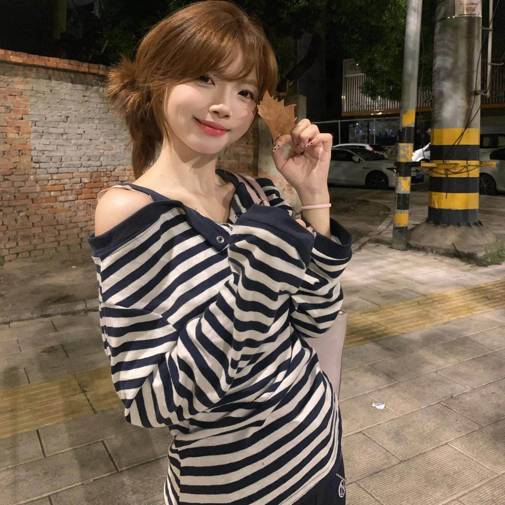 首页> 女装> ROUJE SUNG藏青色露锁骨长袖T恤女秋季韩版辣妹假两件条纹上衣潮