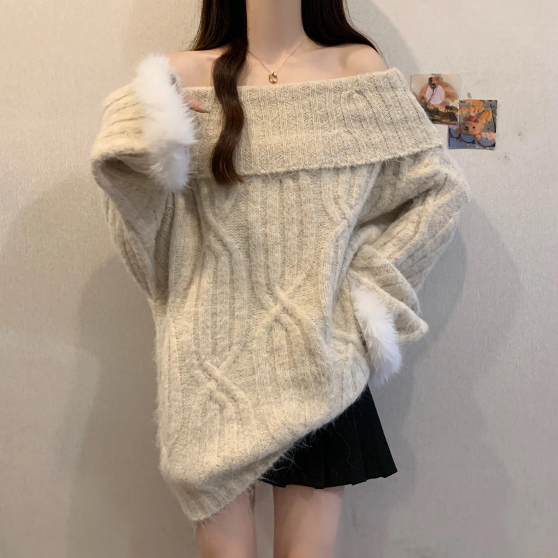 秋冬新款胖MM高级感慵懒显瘦一字领麻花毛毛袖口圣诞过年红毛衣女