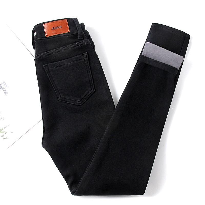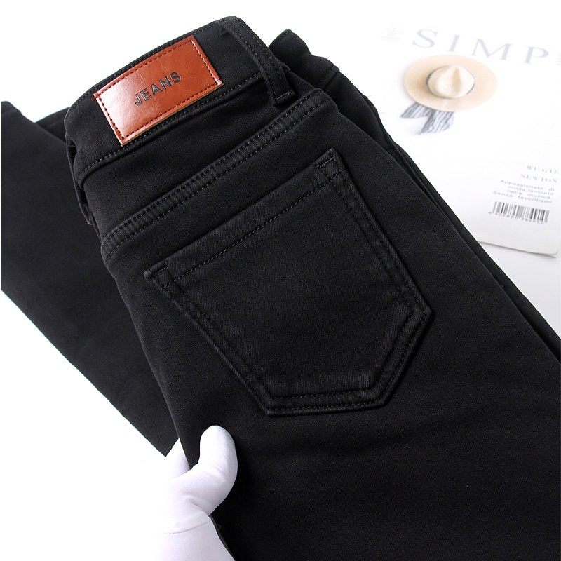 黑色一体绒牛仔裤女2025冬季高腰九分显瘦弹力加绒加厚小脚长裤子