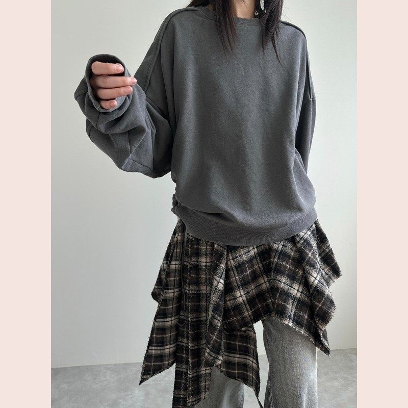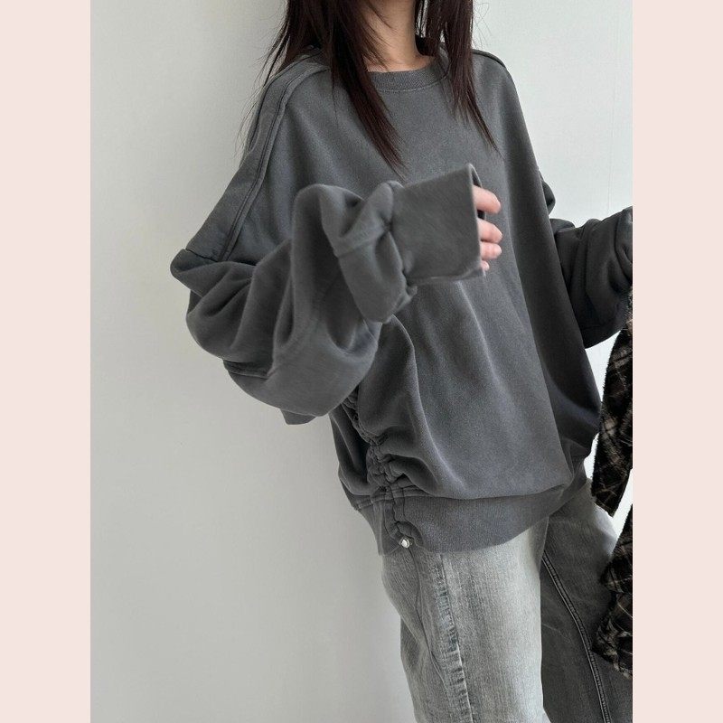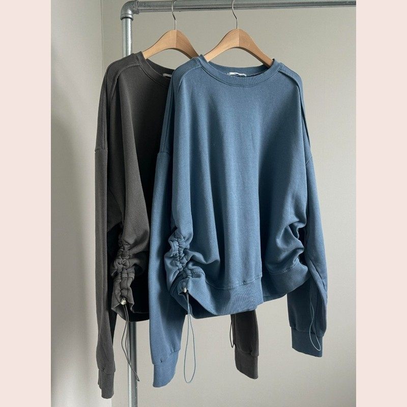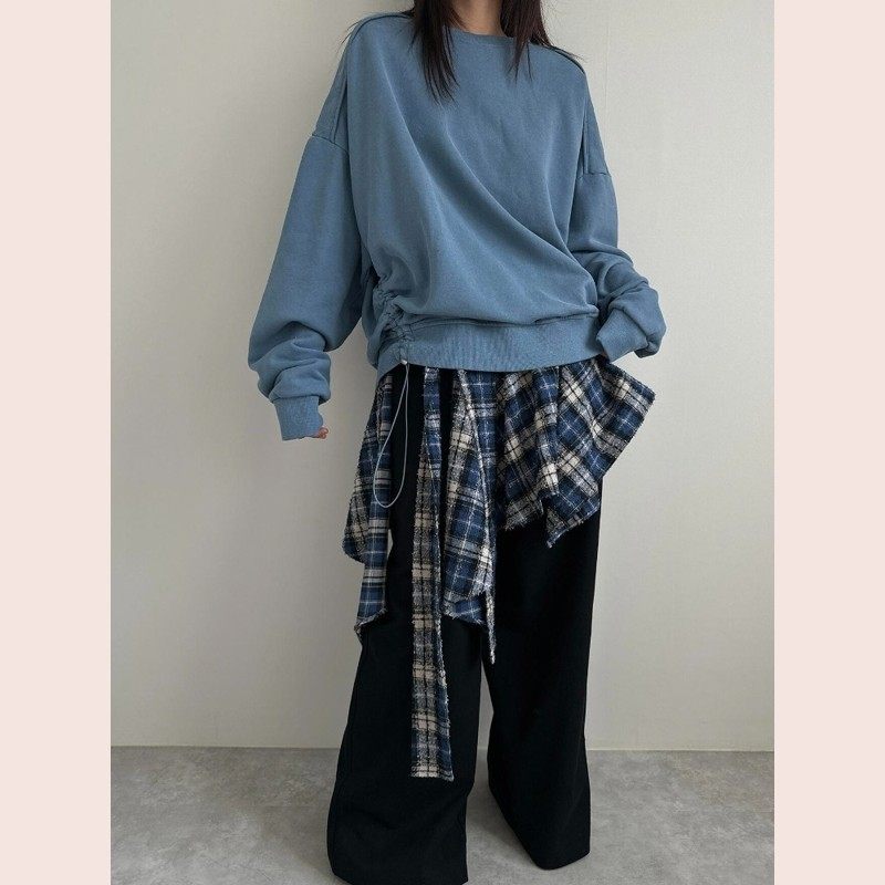 韩系穿搭蓝色侧抽绳落肩圆领卫衣极简风高级感复古休闲上衣2025冬