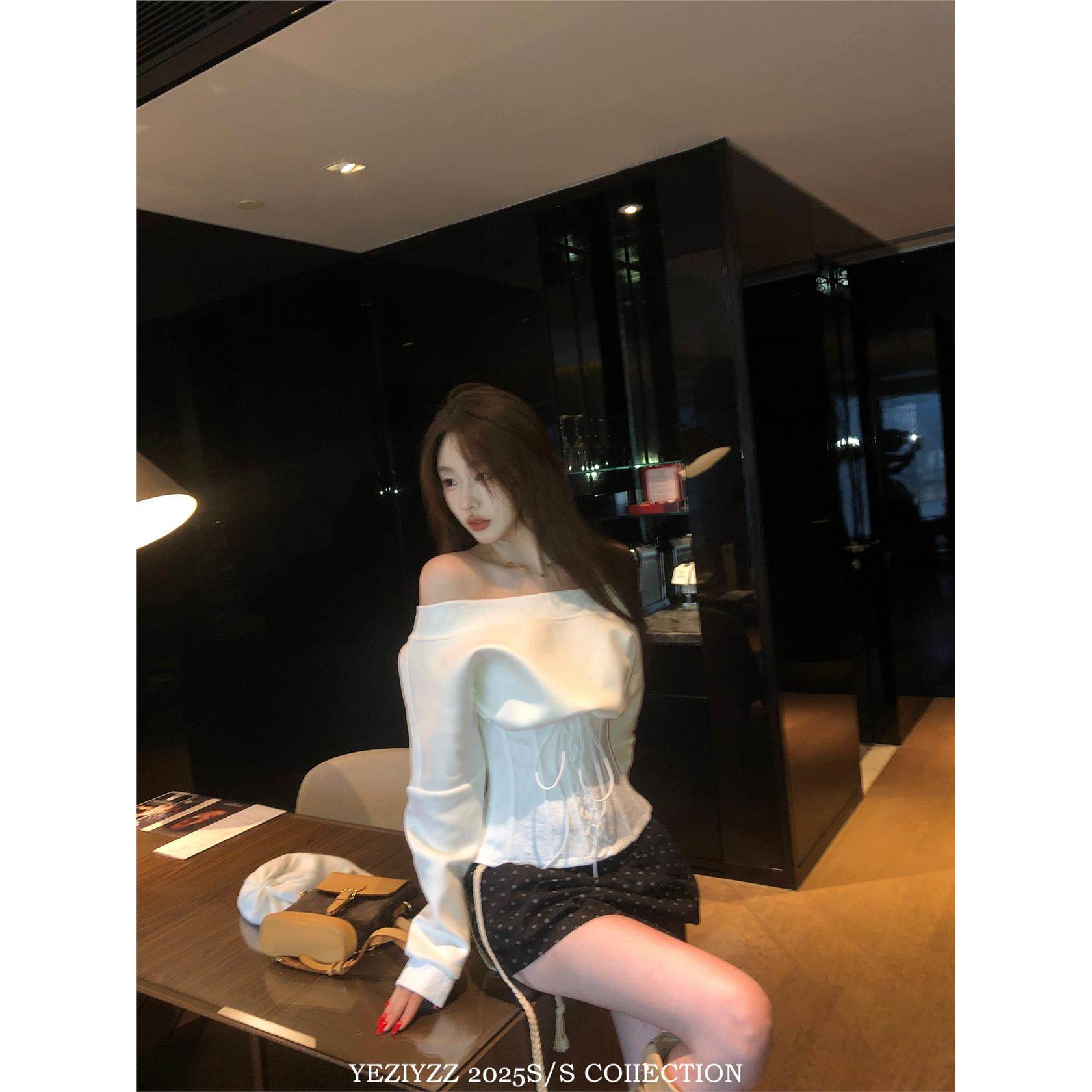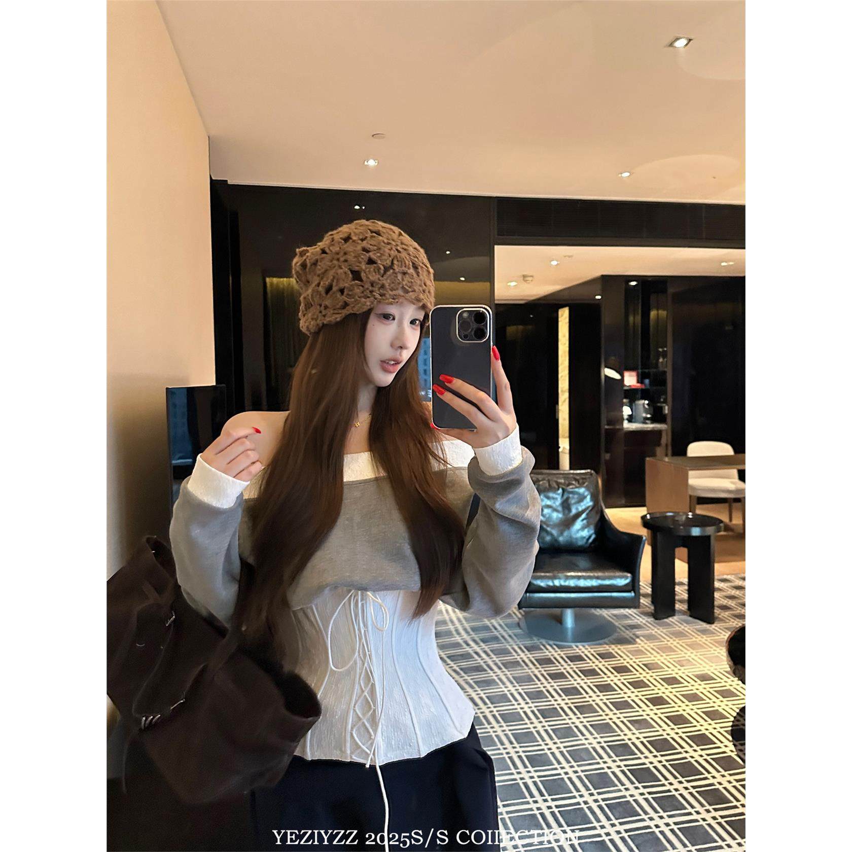 叶子 YEZIYZZ 撞色一字领长袖卫衣女装秋冬别致收腰显瘦露肩上衣